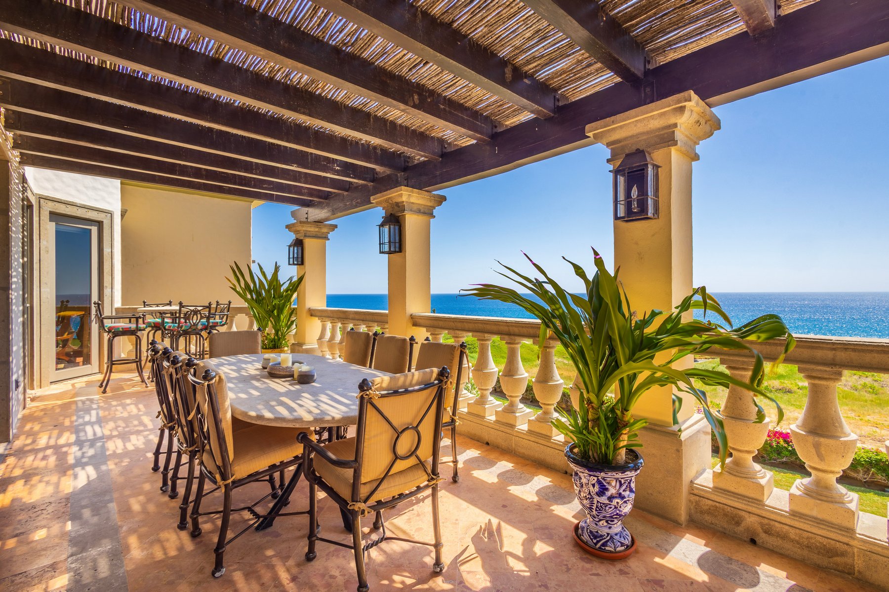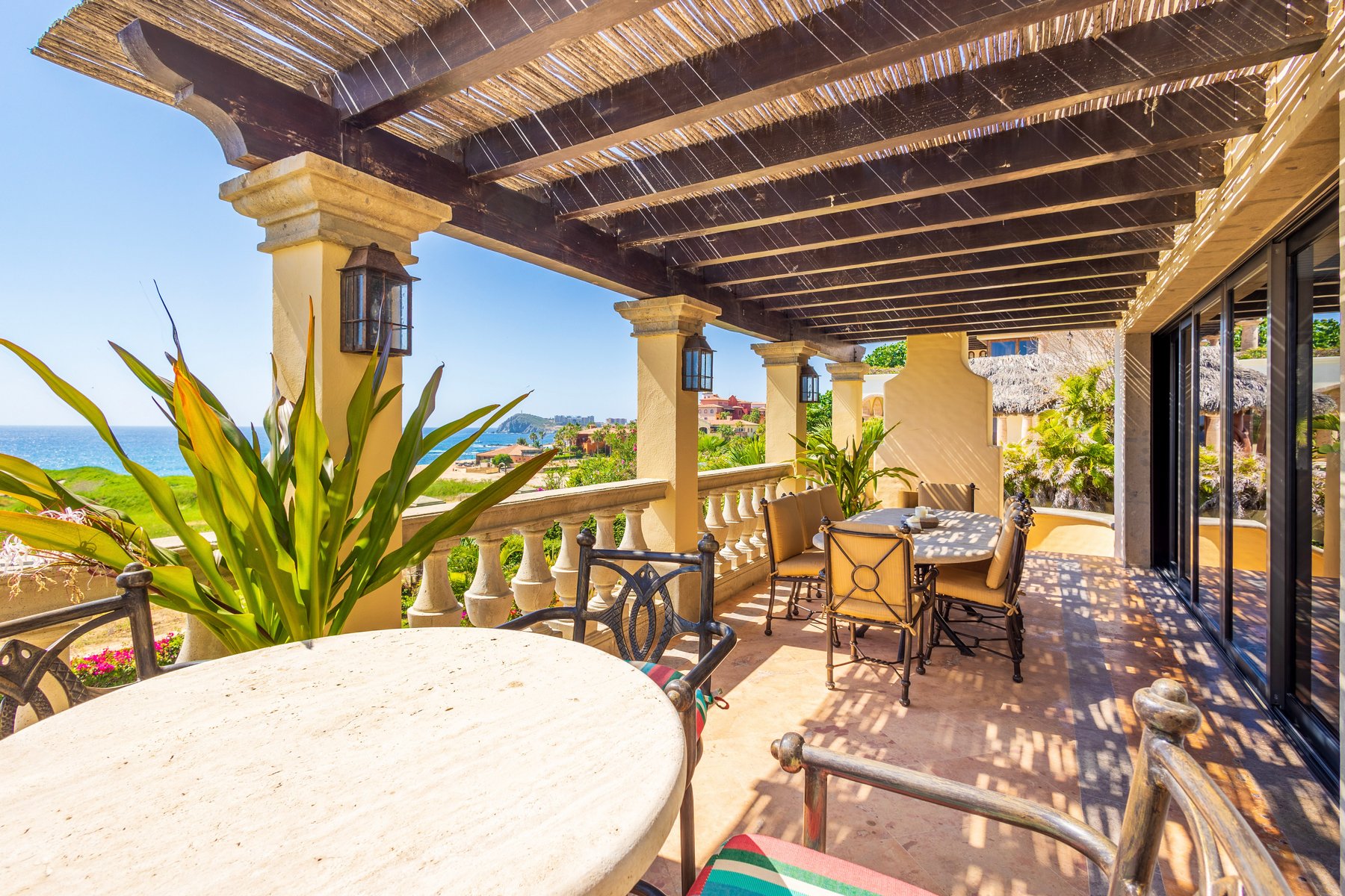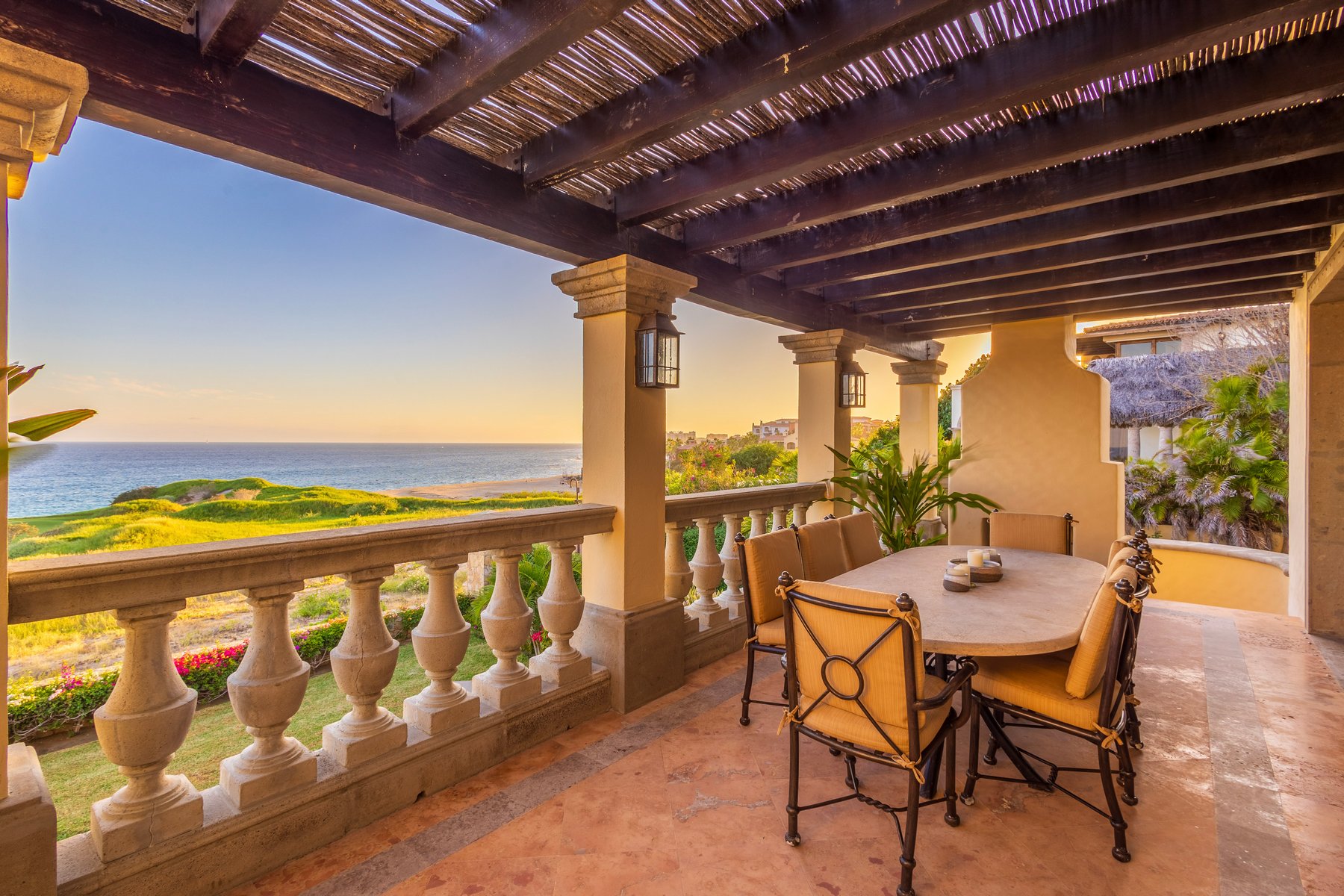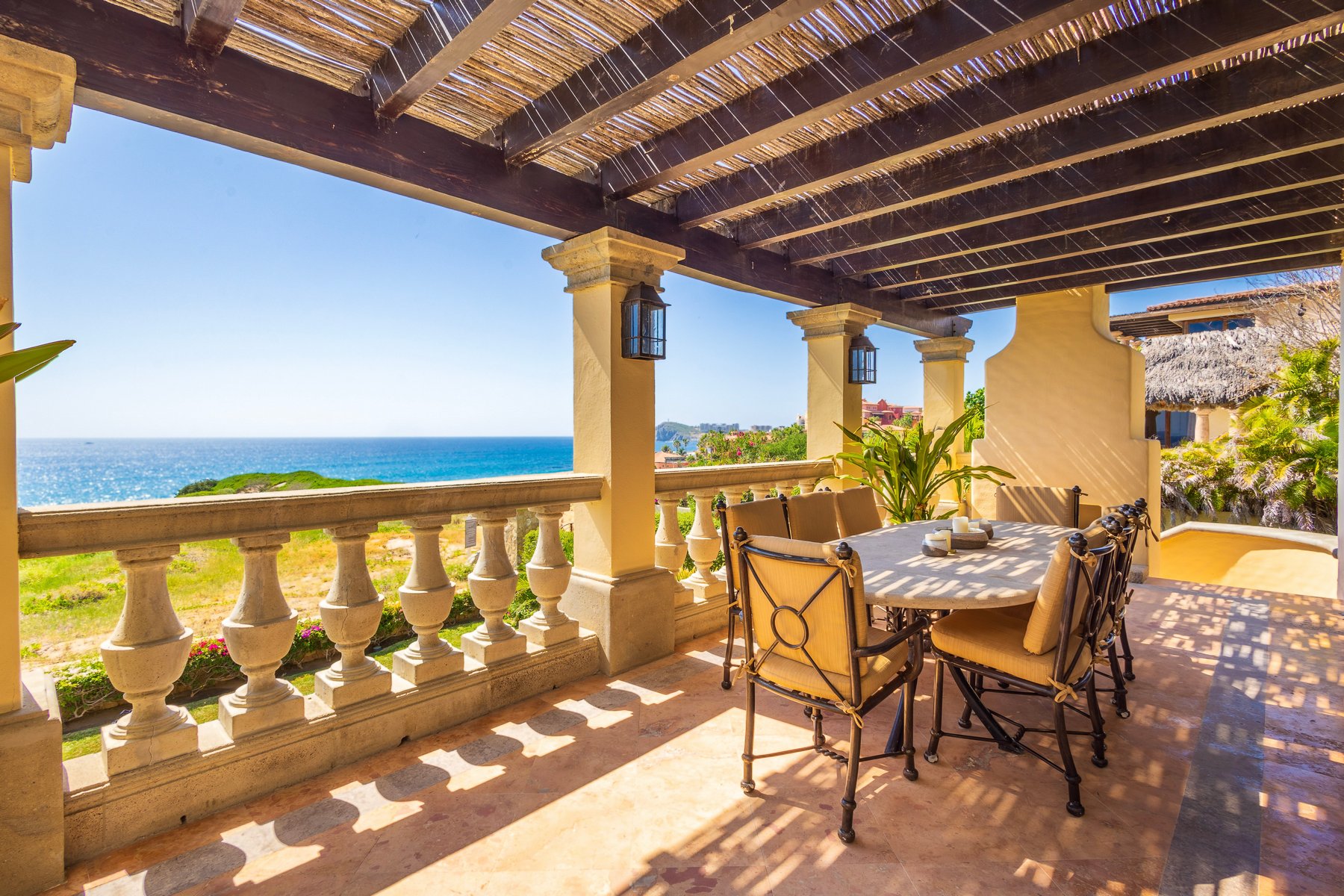 Casa Mariposa is a three-bedroom, beachfront villa rental in the gated Cabo del Sol community in Cabo San Lucas — 5,200 square feet of Hacienda-style architecture positioned directly on the oceanfront with the sea immediately below the terrace and direct access to a swimmable beach. Three bedrooms, 3.5 baths, and six guests across two stories with the kind of ocean views that appear in every room that faces the water.