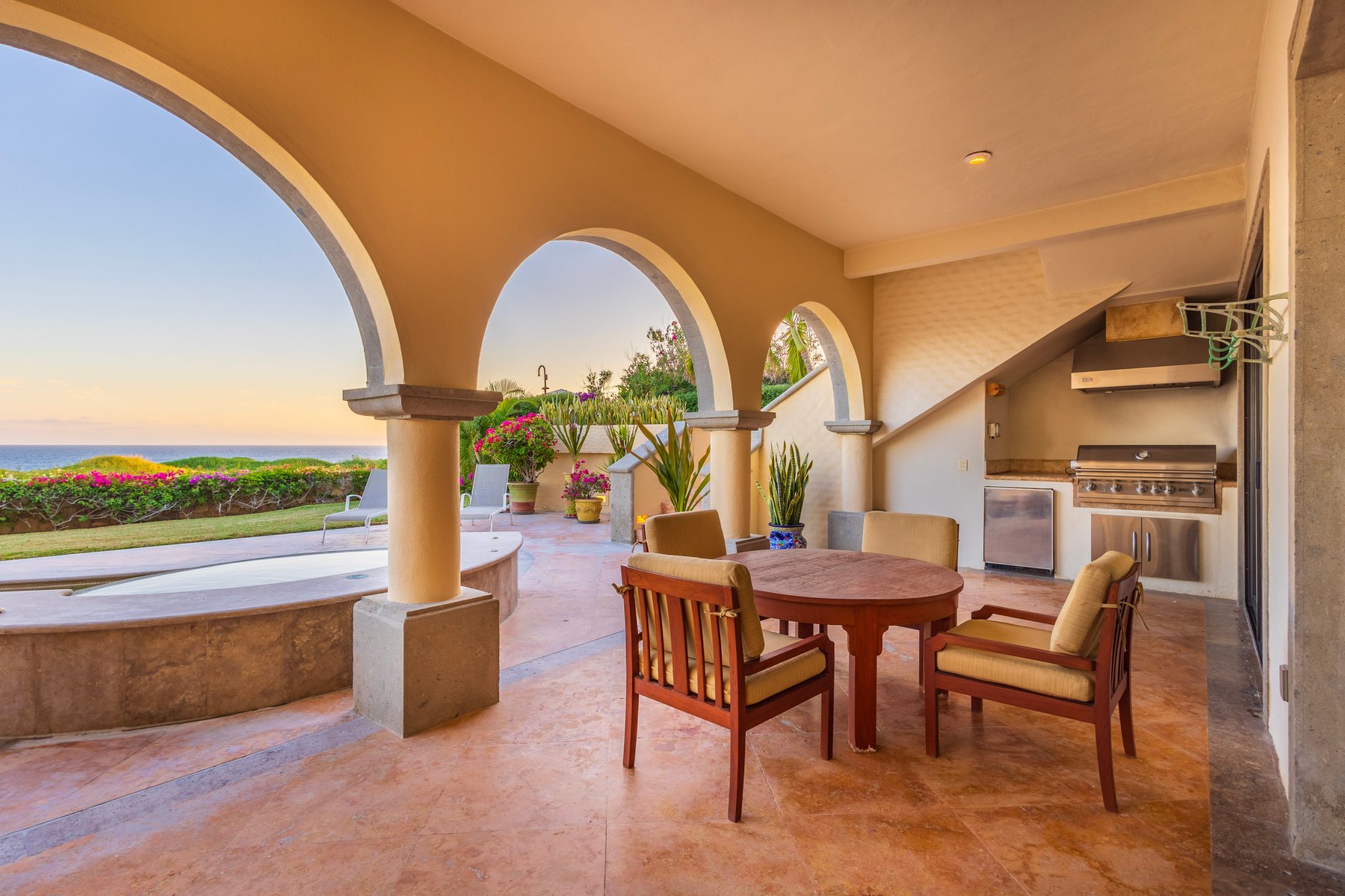 The outdoor terrace holds a private pool, jacuzzi, and expansive ocean-view dining area with a BBQ grill — the beach is a step down from the terrace rather than a drive or a walk. The sound of the waves is part of the property's ambient character throughout the day and into the evening.