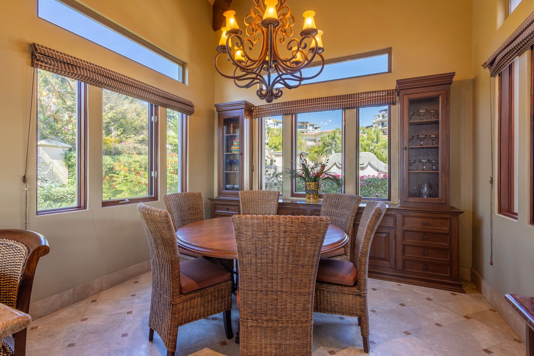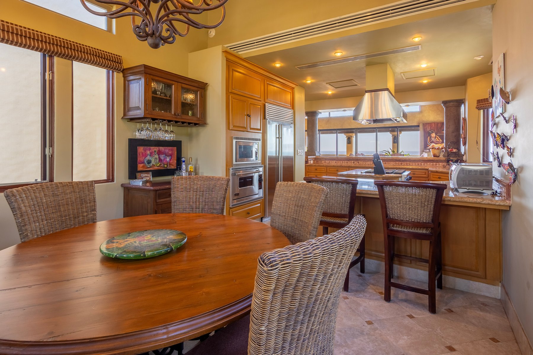 Inside, rich wooden furnishings accented with vibrant touches of color give the interior warmth against the white walls typical of Hacienda construction. The master bedroom and the third bedroom each have king beds; the second has two double beds. All three have ensuite baths with both a shower and a soaking tub. A gourmet kitchen with a breakfast bar for two, a dining room with panoramic ocean views, a TV, air conditioning, and high-speed internet complete the specification. Daily housekeeping is included except Sundays and Mexican holidays. The Cabo del Sol golf course is within the community.