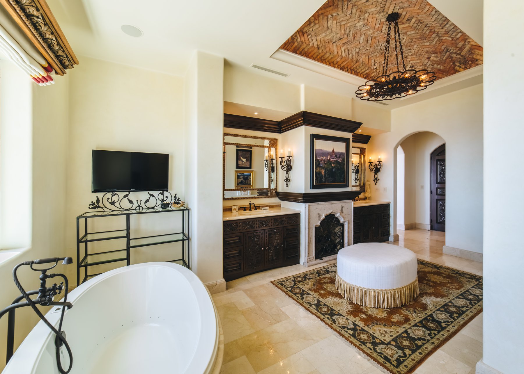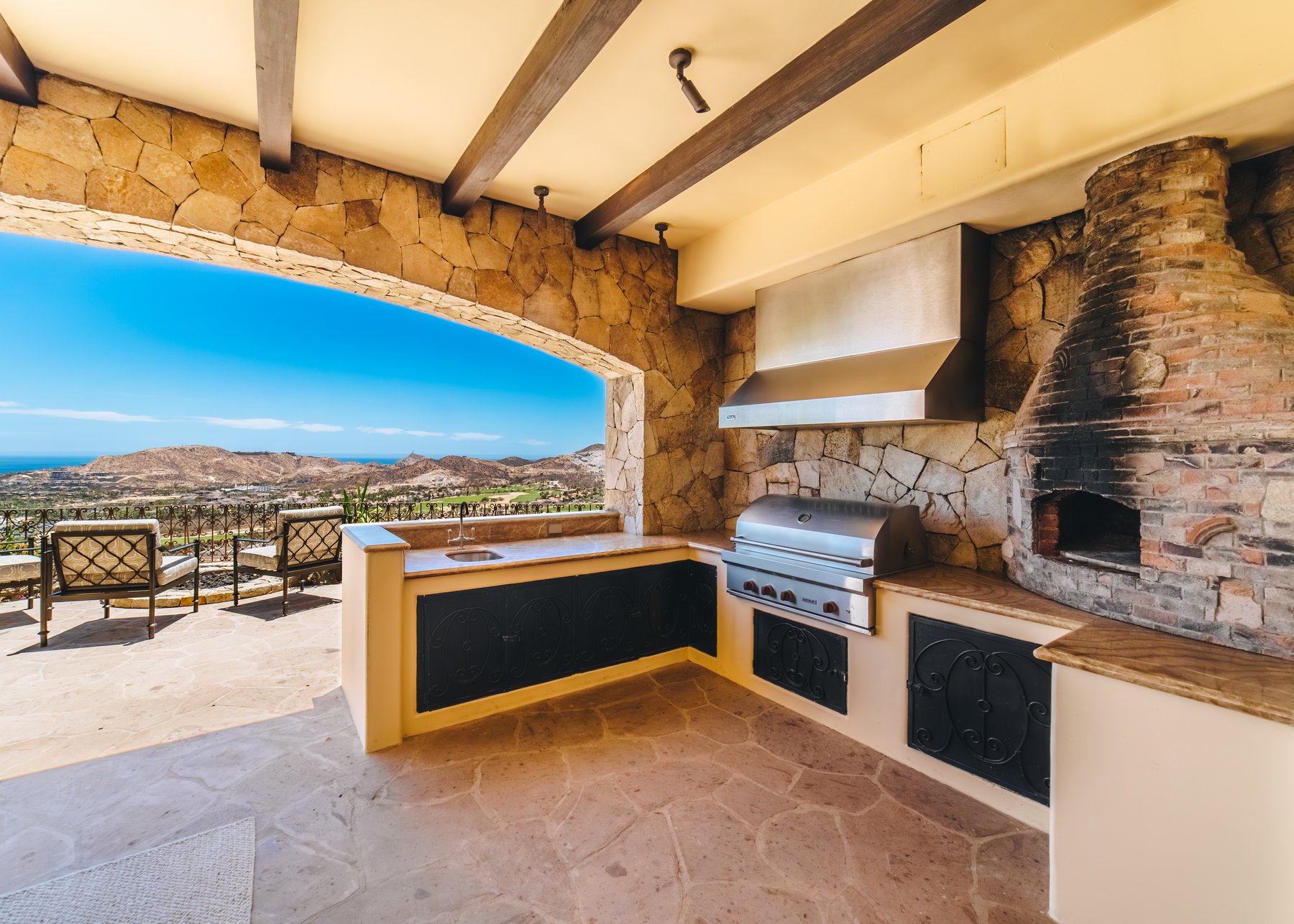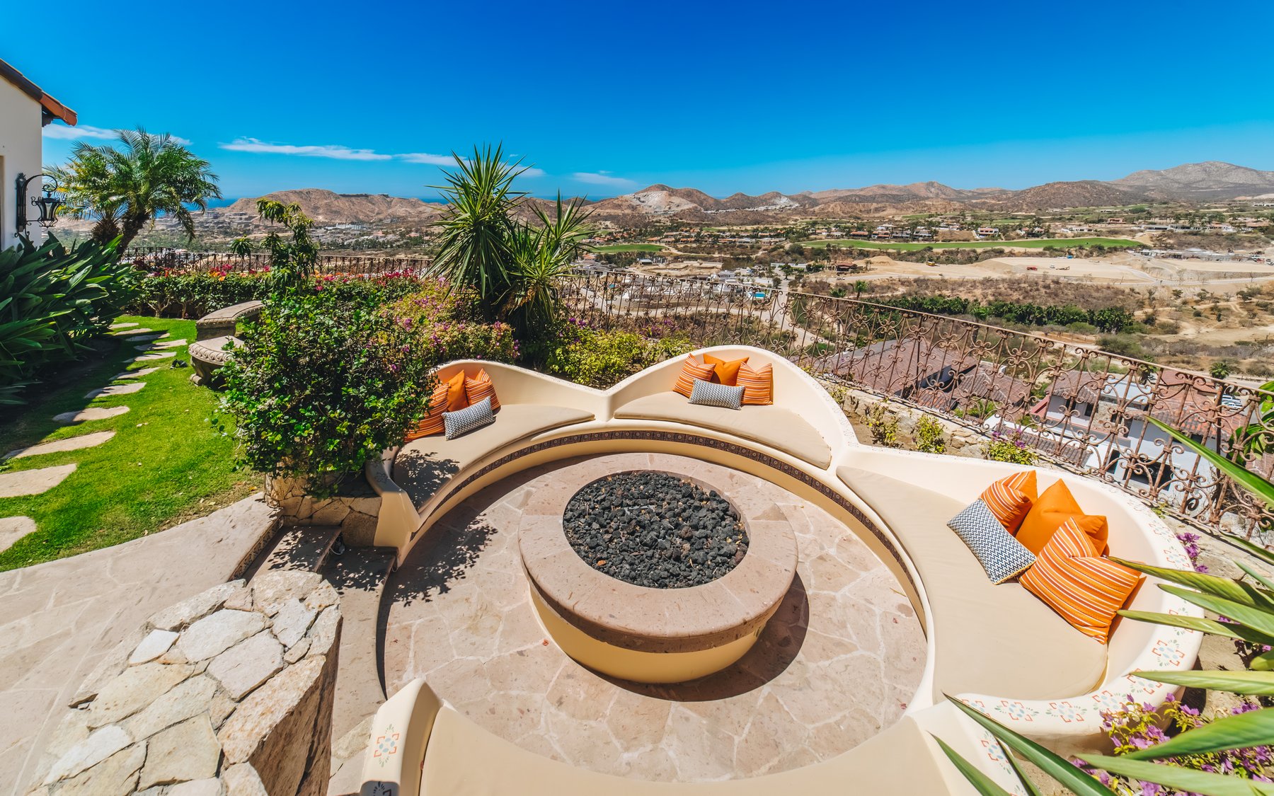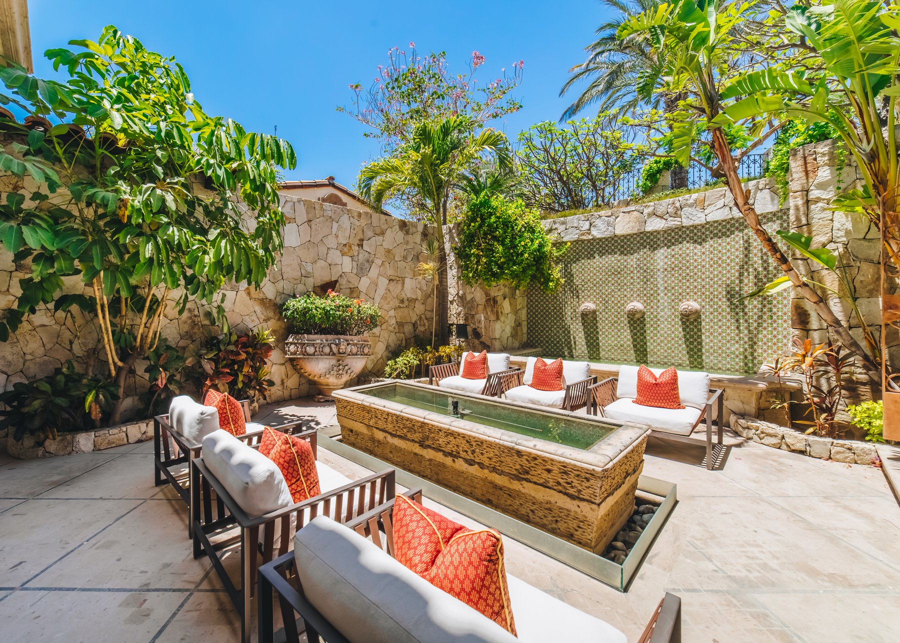 The outdoor program holds a private infinity pool, jacuzzi, outdoor dining for twelve, a wood-burning pizza oven alongside a gas grill, two fire pits, two outdoor fireplaces, a hammock and swinging bed, outdoor sound system, and underwater pool speakers. The underwater speakers — an uncommon feature in Los Cabos villa rentals — give the pool a specific sensory quality that makes it worth noting.