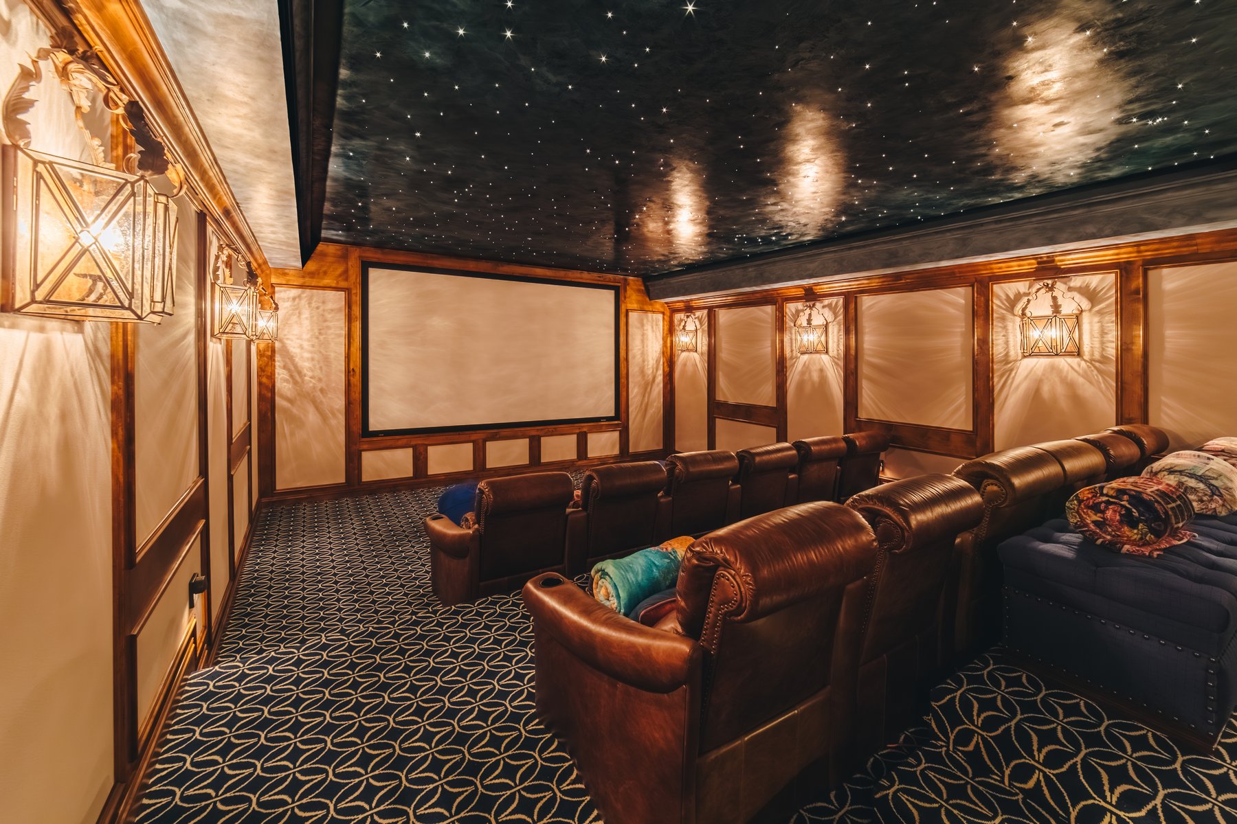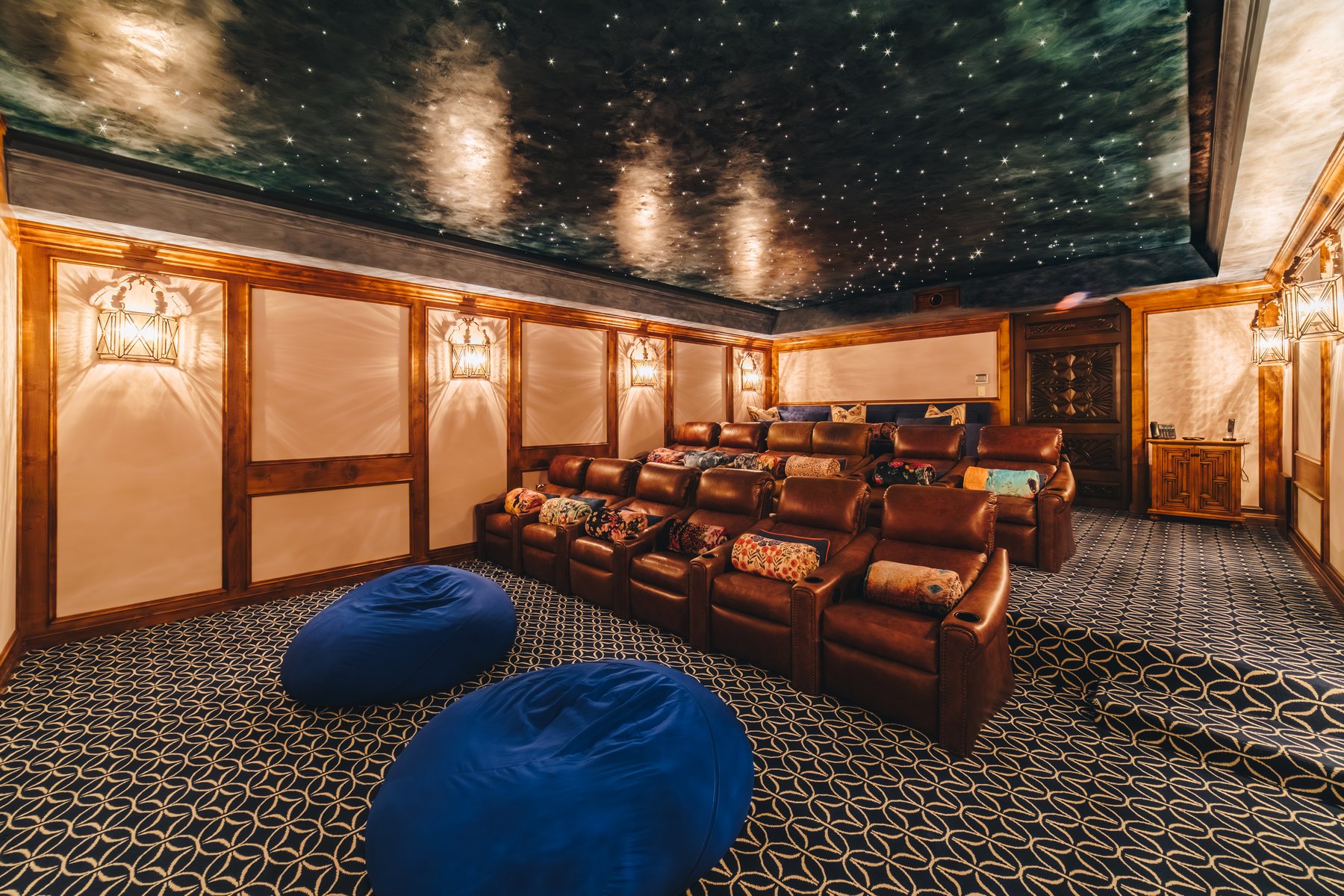 Inside: a game room with pool table, dartboard, and pinball machine; a movie theater; an upstairs media room with a large screen and two Apple computers; an elevator; a chef's kitchen; a bar; an office; and a fireplace. The layering of entertainment infrastructure — theater, media room, game room, pizza oven — inside a Querencia estate is the specific case for this property.