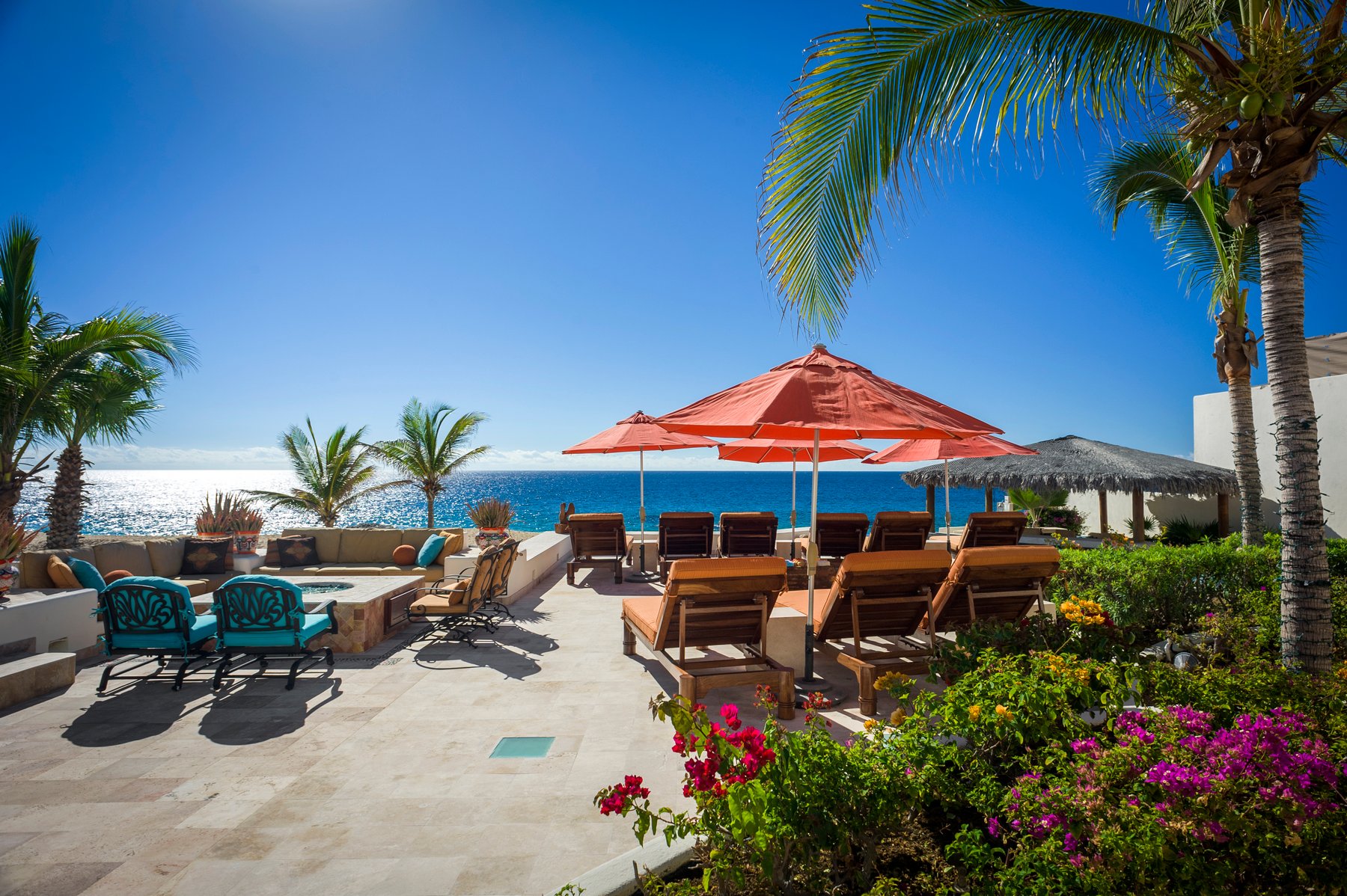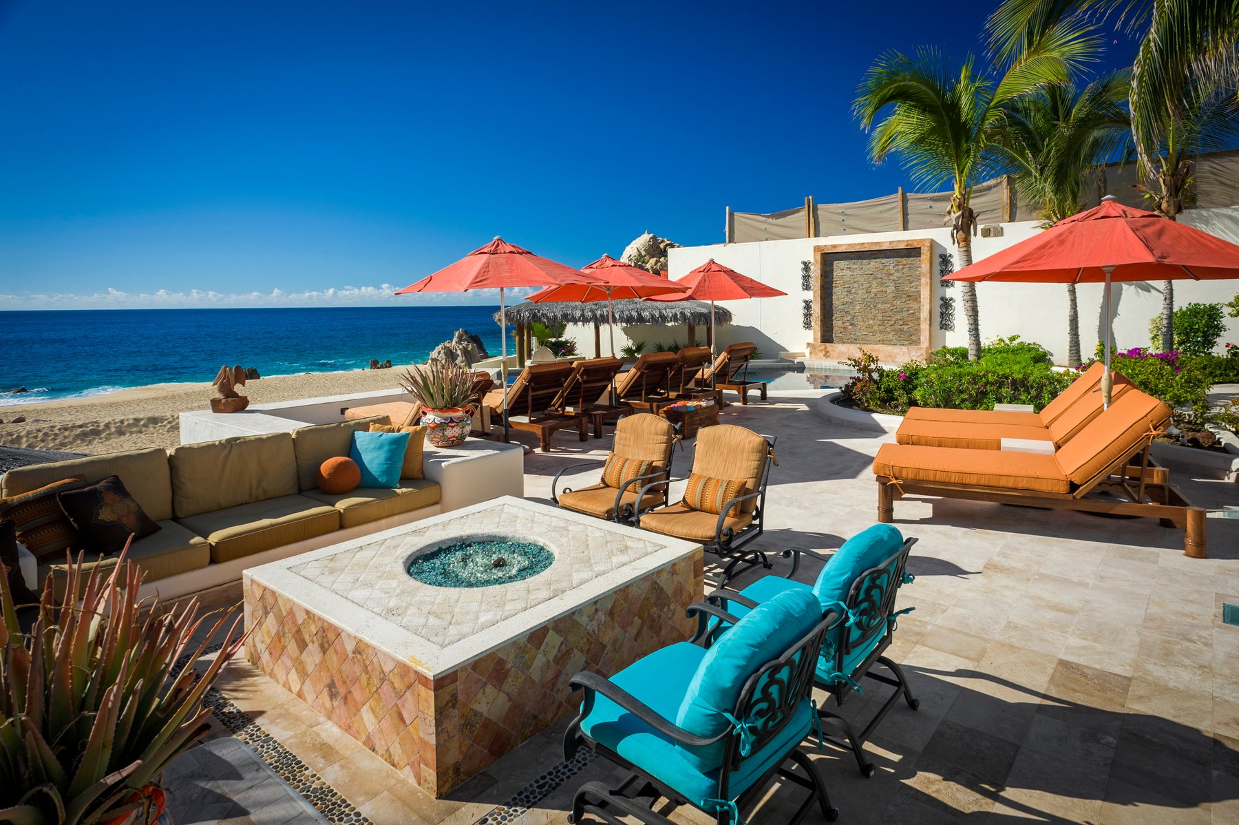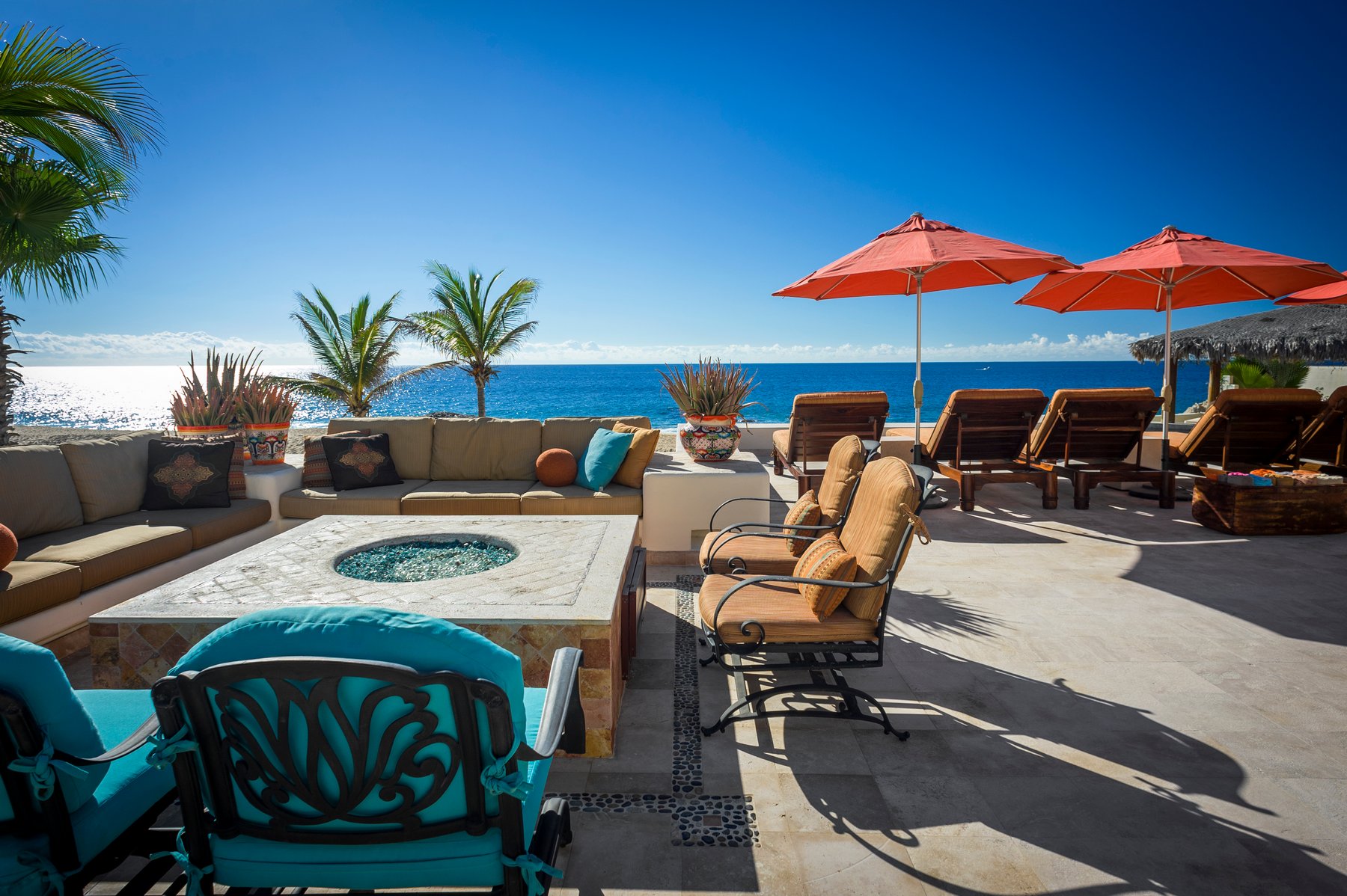 Outdoor living is centered around a large terrace with a pool, jacuzzi, fire pit, and multiple seating areas arranged across the space. A covered palapa dining area with BBQ creates a dedicated zone for outdoor meals, while the beachfront position allows for uninterrupted views and direct access to the sand. The layout supports both group gatherings and more private moments across different areas of the terrace.