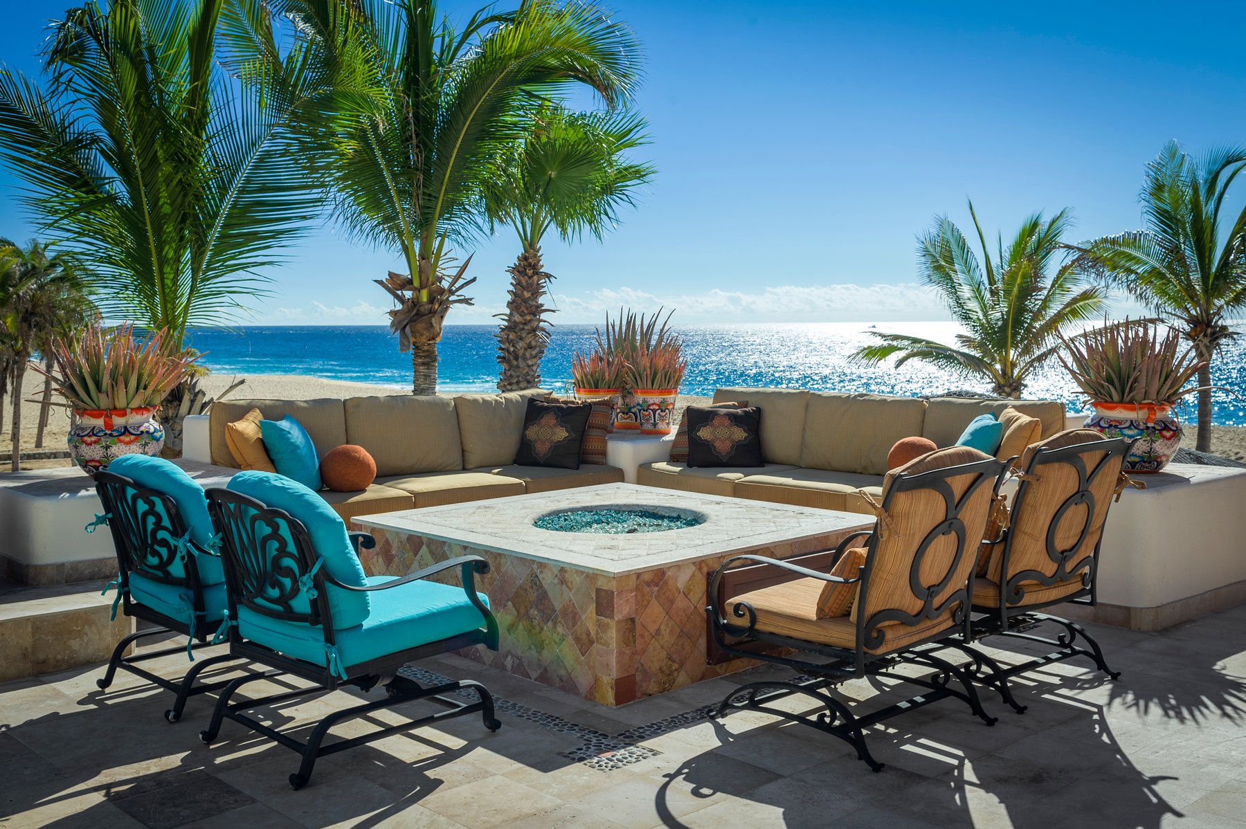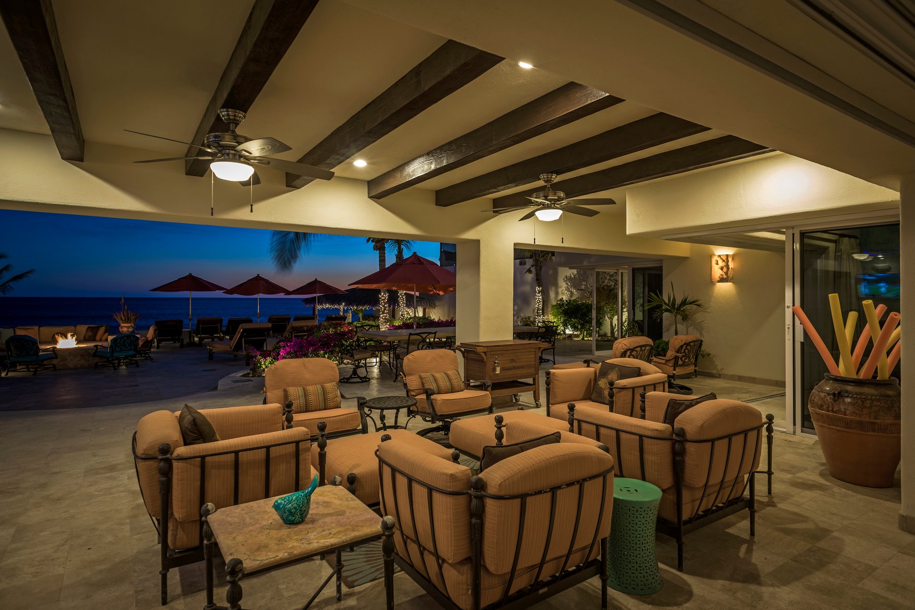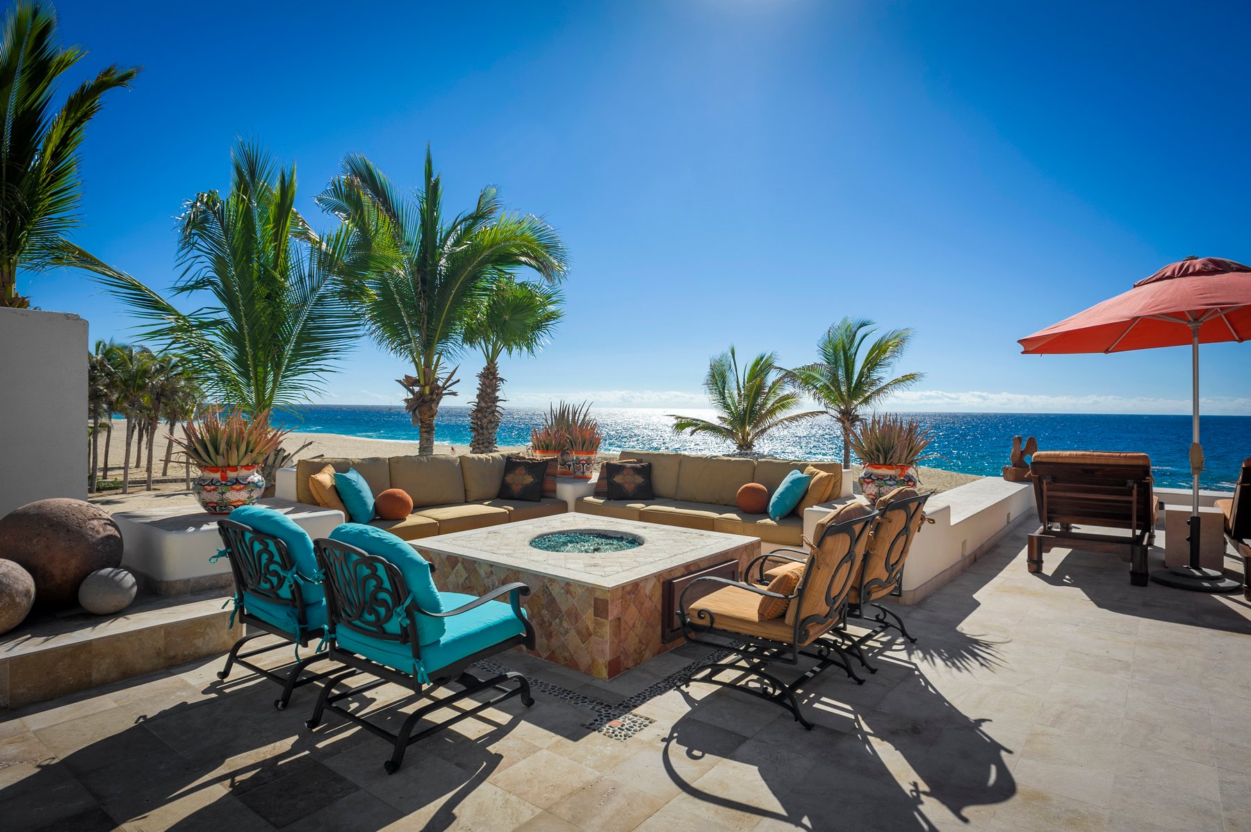 Outdoor living is centered around a large terrace with a pool, jacuzzi, fire pit, and multiple seating areas arranged across the space. A covered palapa dining area with BBQ creates a dedicated zone for outdoor meals, while the beachfront position allows for uninterrupted views and direct access to the sand. The layout supports both group gatherings and more private moments across different areas of the terrace.