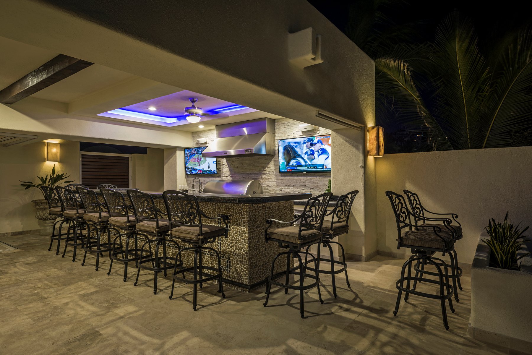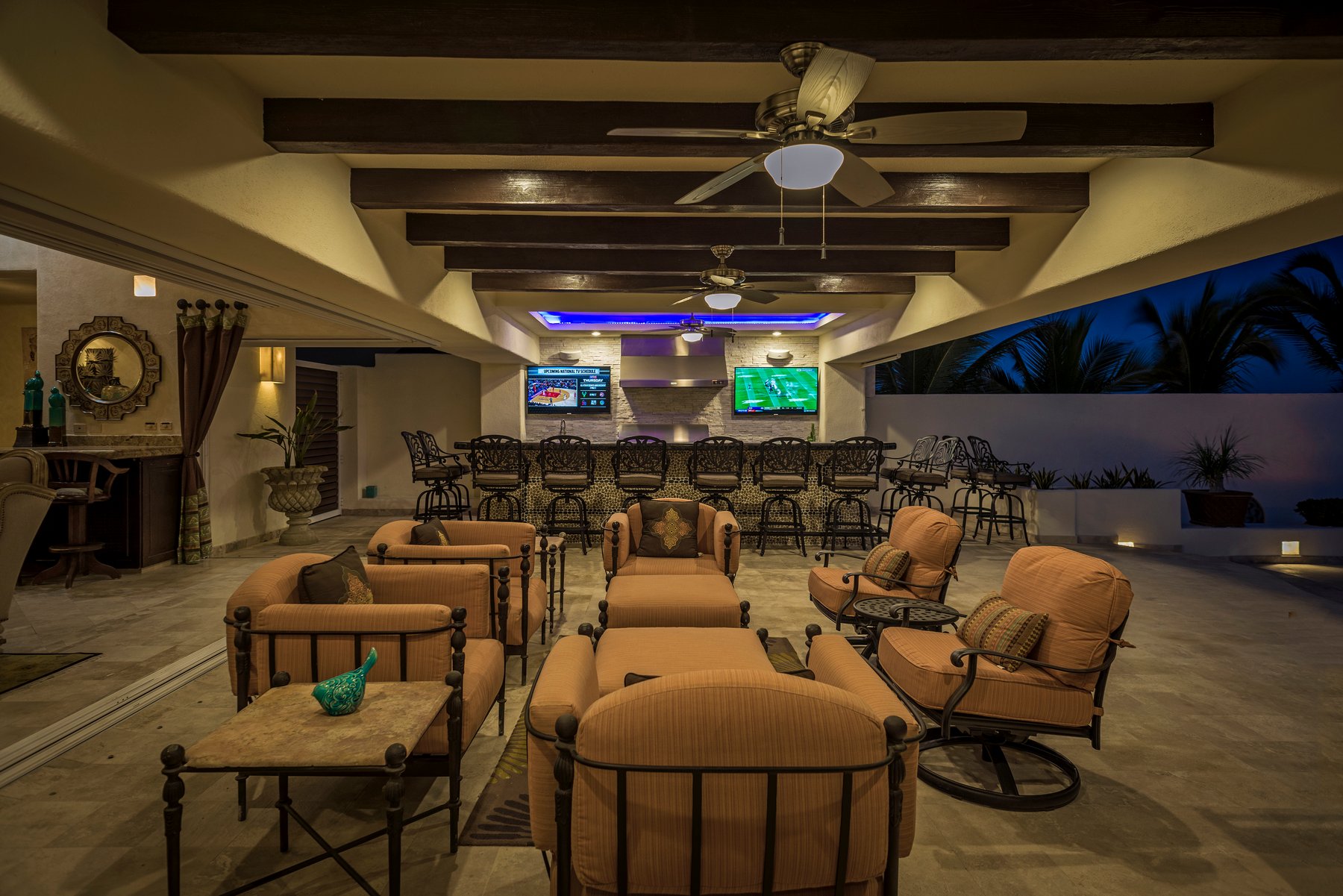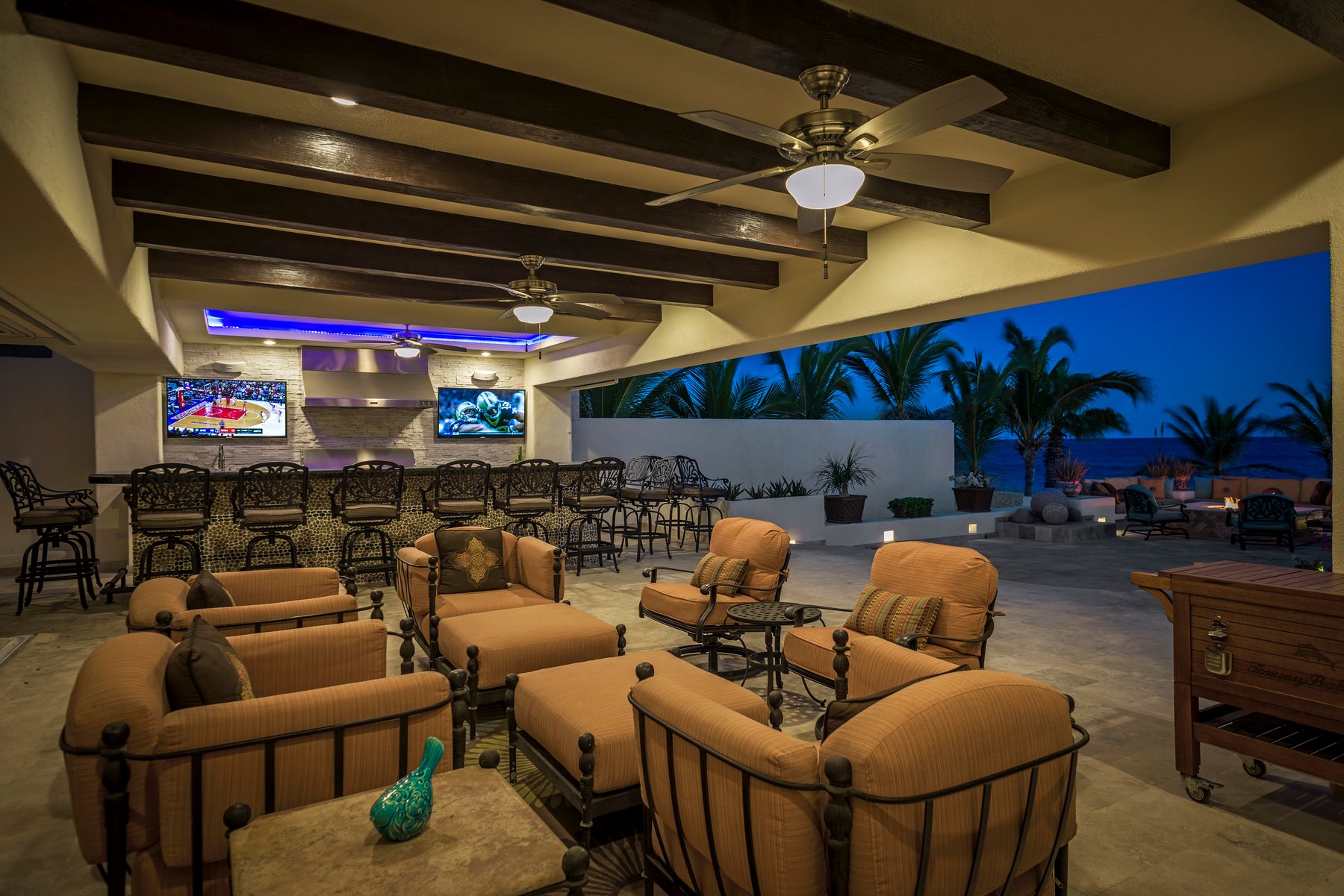 Inside, the villa features over 7,000 square feet of interior space with a layout designed for larger groups. The home includes multiple suites with ocean views, along with a separate guest casita that adds additional sleeping capacity. A gourmet kitchen, large living areas, media room, and indoor features such as a rock wall and water feature provide a mix of functional and recreational spaces throughout the property.