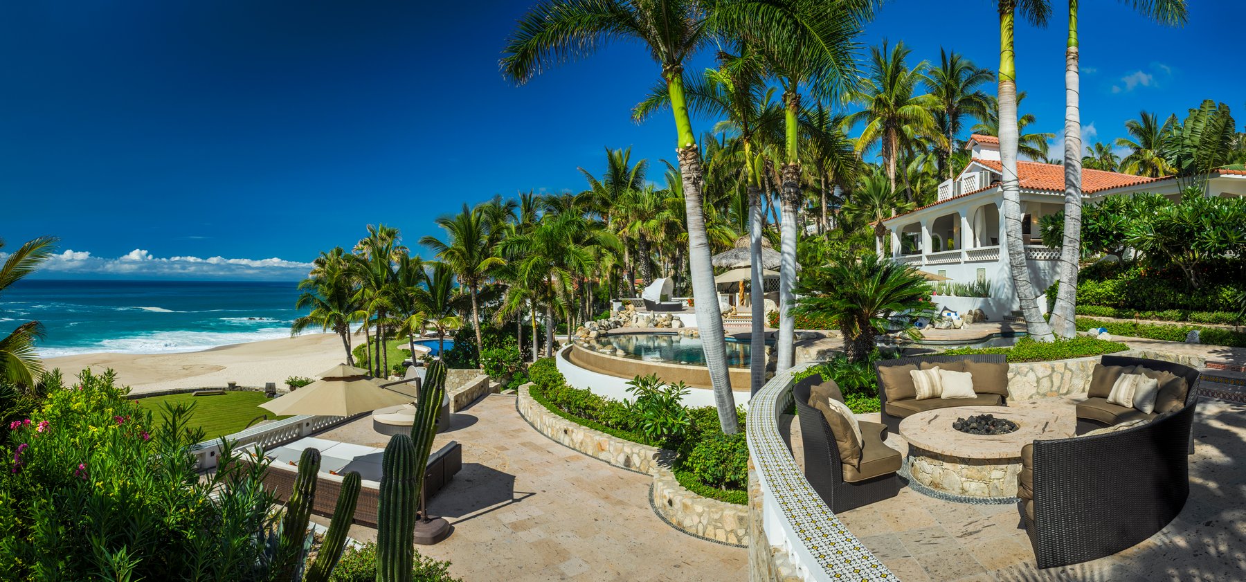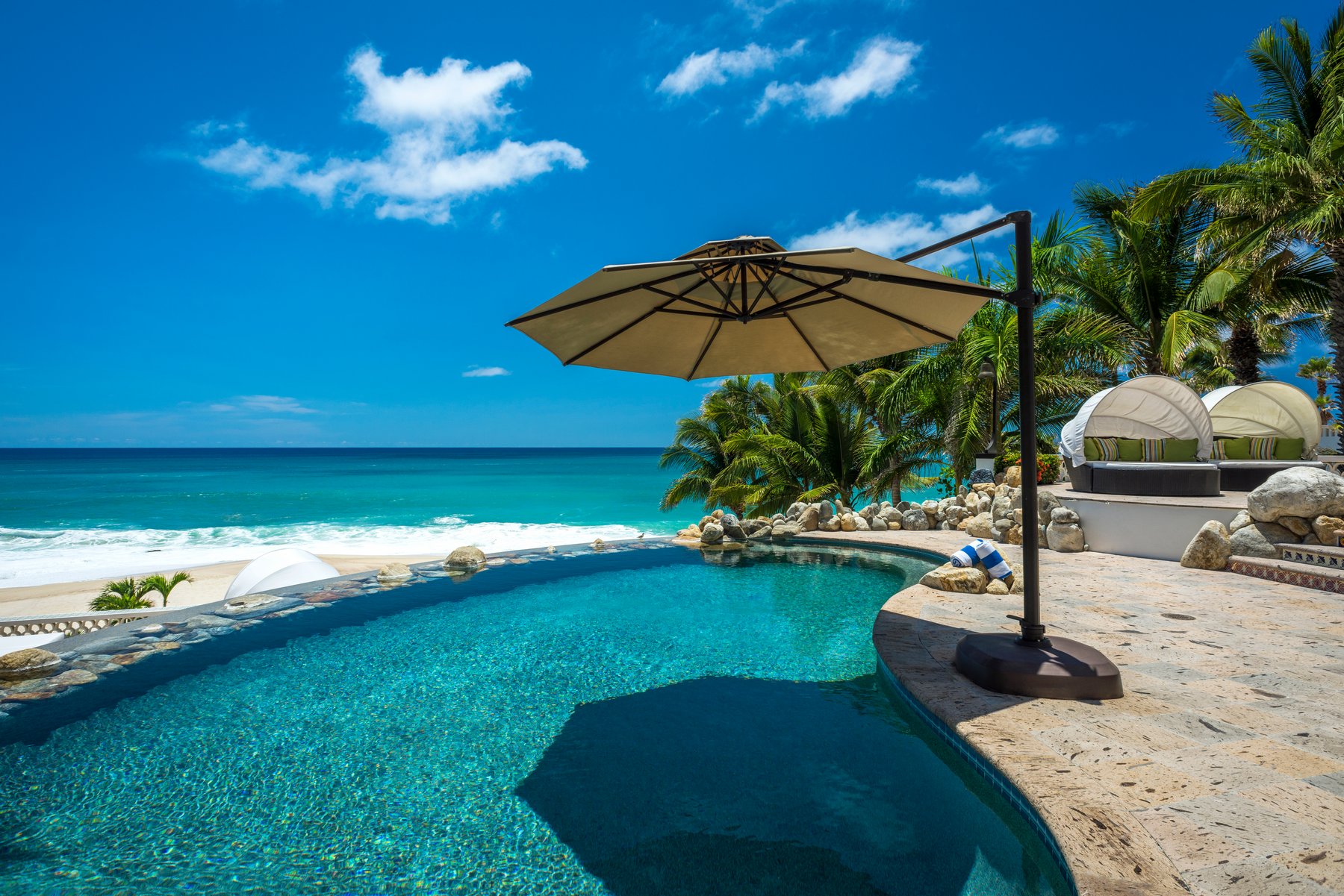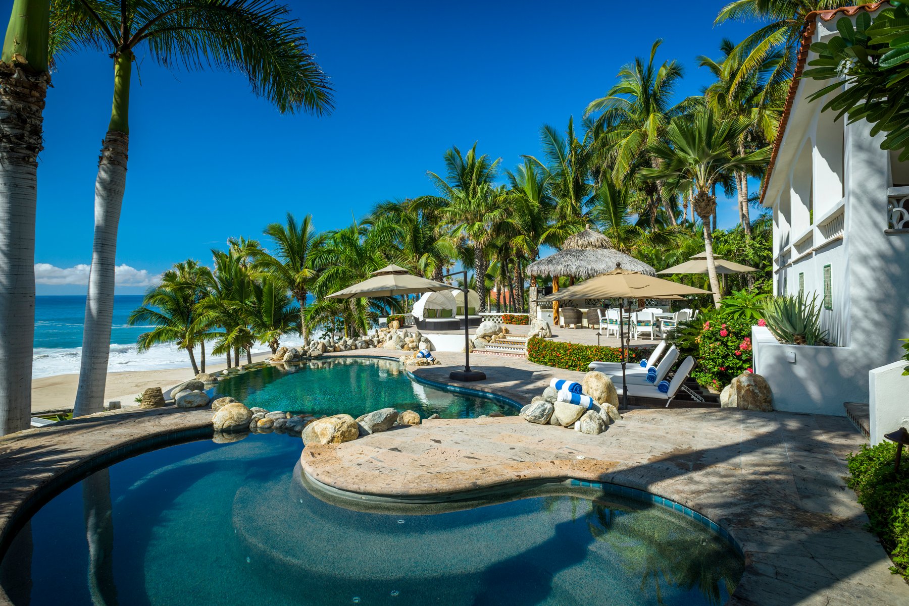 Casa Edwards has been one of the most sought-after beachfront villas in Villas Del Mar for good reason. Set directly on one of the few genuinely swimmable beaches in Los Cabos, this eight-bedroom estate carries the easy confidence of a home that has hosted hundreds of remarkable stays — renovated and impeccably maintained, but without the stiffness of a property trying to announce itself. You feel it the moment you walk through the front doors.
