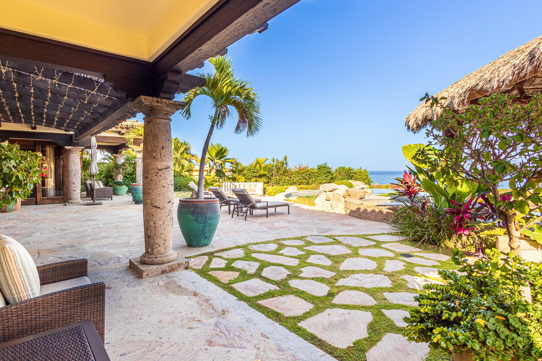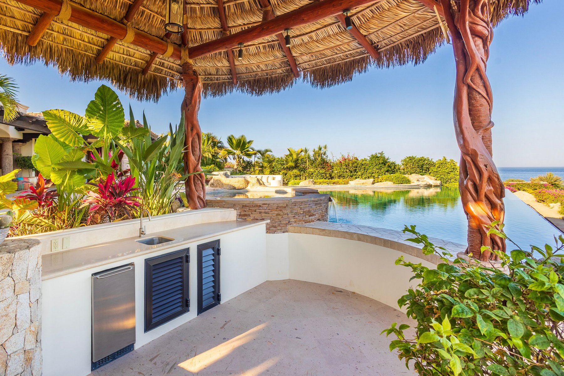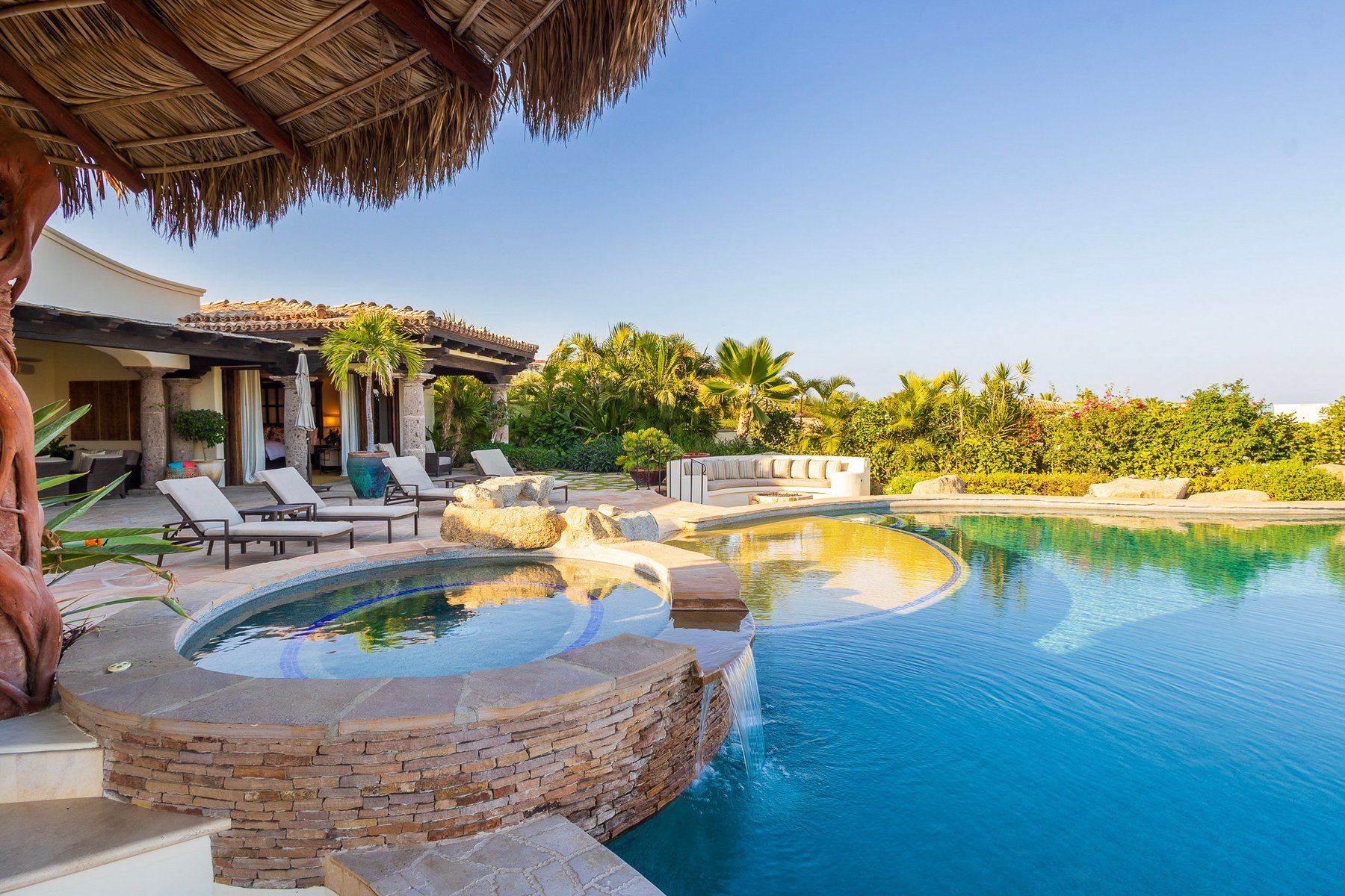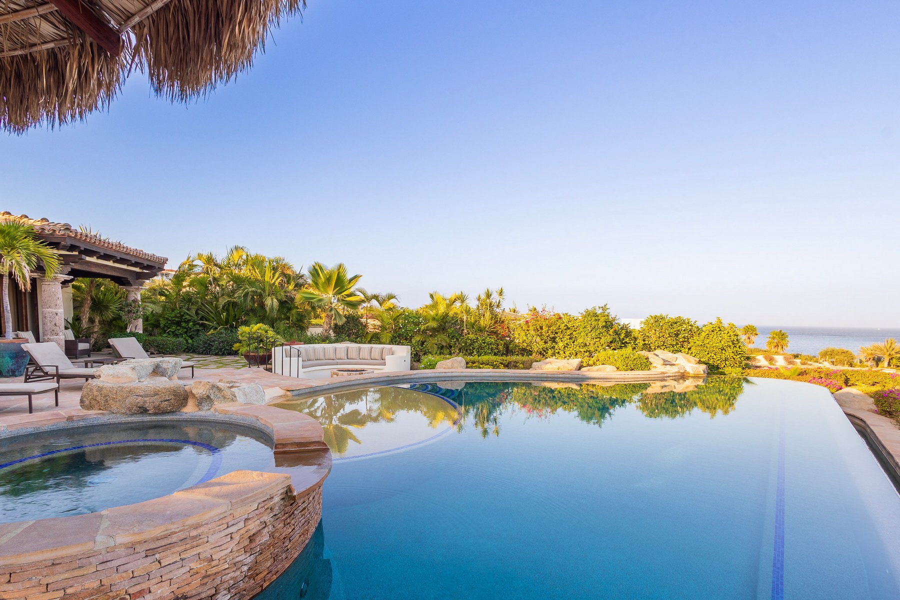 The outdoor area is centered around an infinity-edge pool and jacuzzi, with adjacent lounge seating and a shaded palapa that supports both dining and relaxation. The terrace layout allows for full use throughout the day, with multiple zones that keep the space functional for groups without concentrating activity in one area.