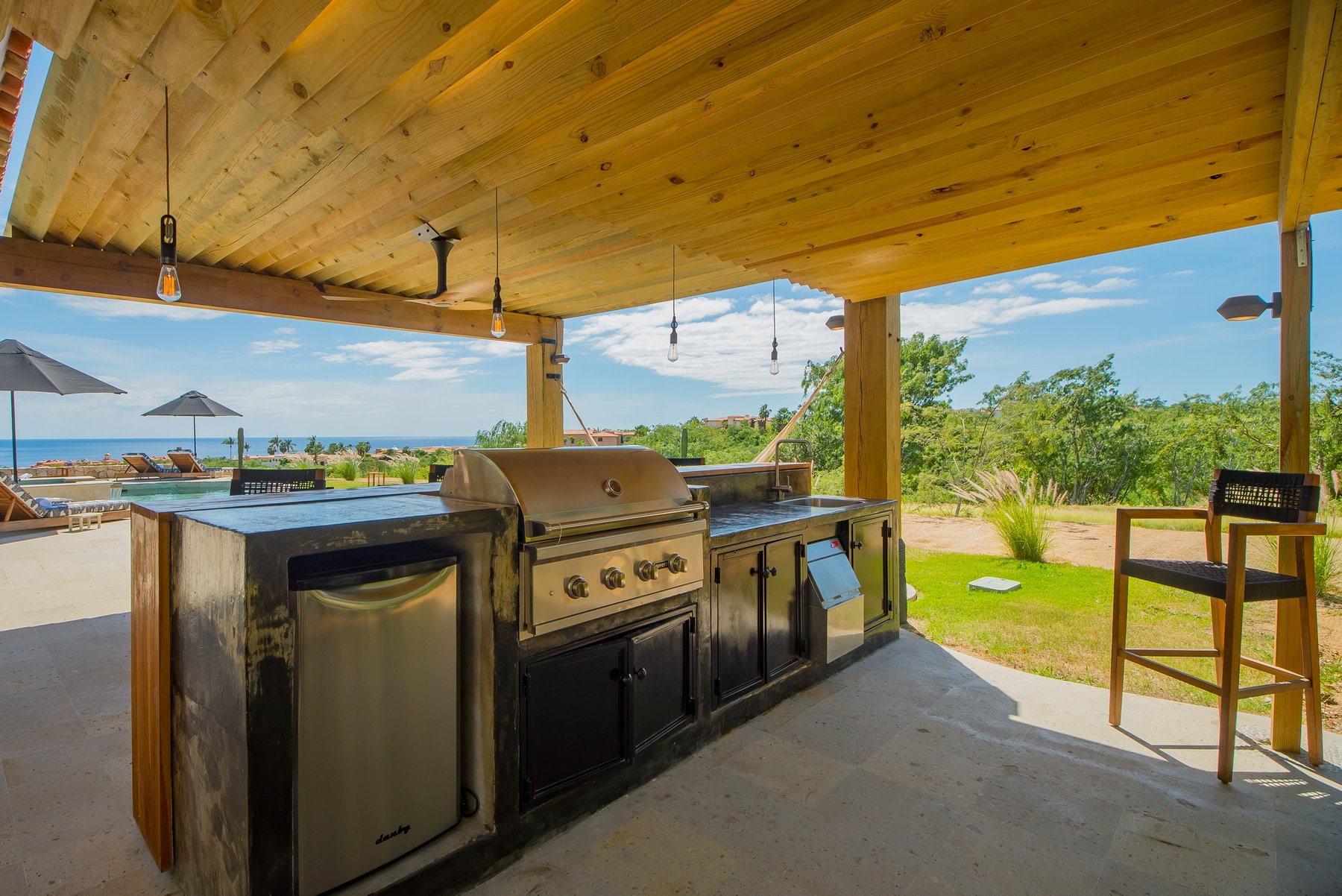 The outdoor area includes a pool, jacuzzi, fire pit, and dining space, all arranged across a wide terrace that faces the golf course and the ocean beyond. Seating is distributed to support both group and individual use, with the layout allowing the entire space to function as a single unit without separation. The terrace remains the central area throughout the day.