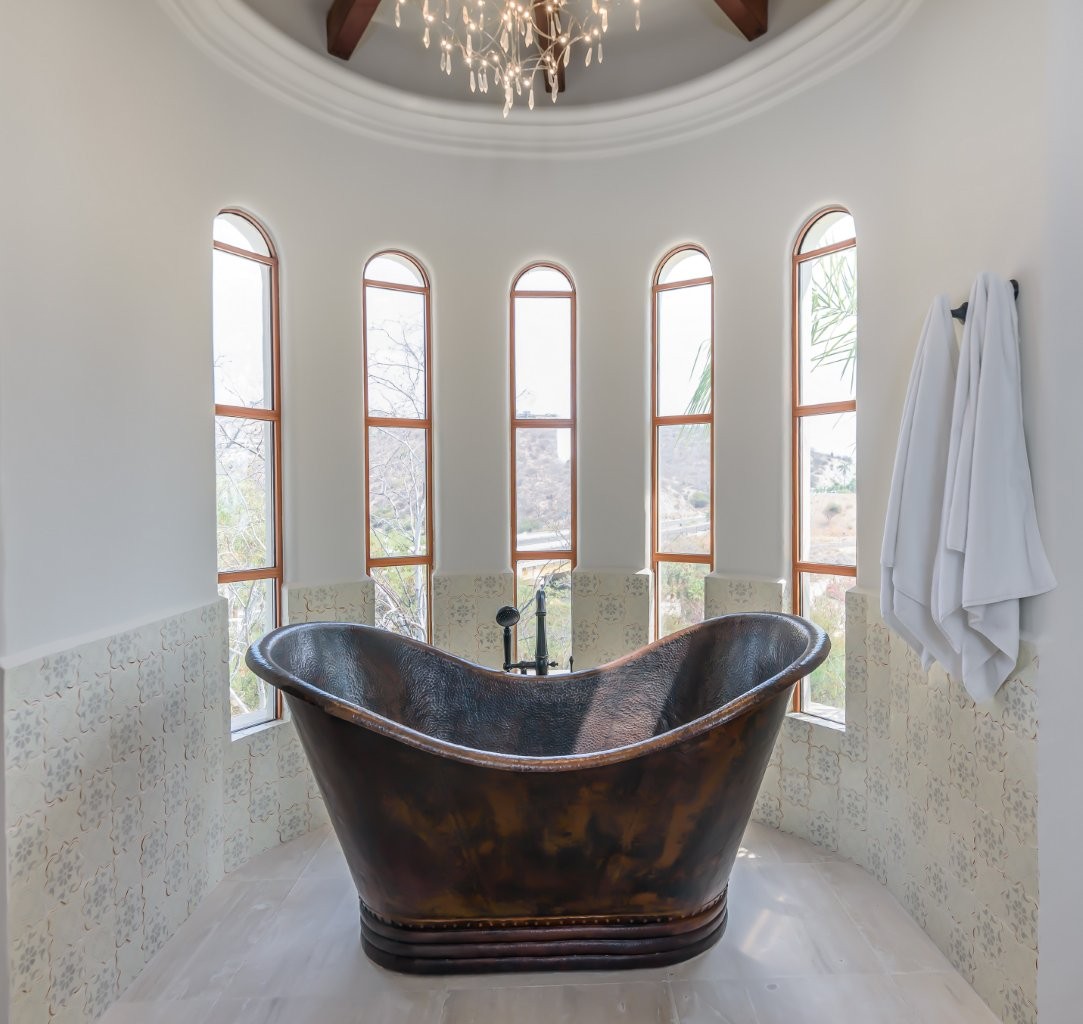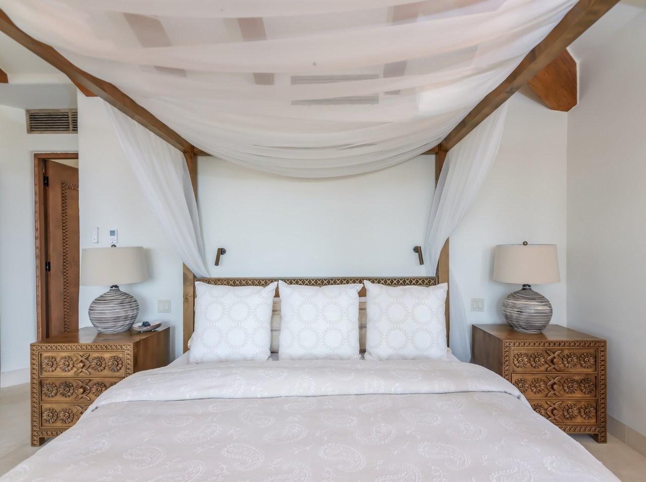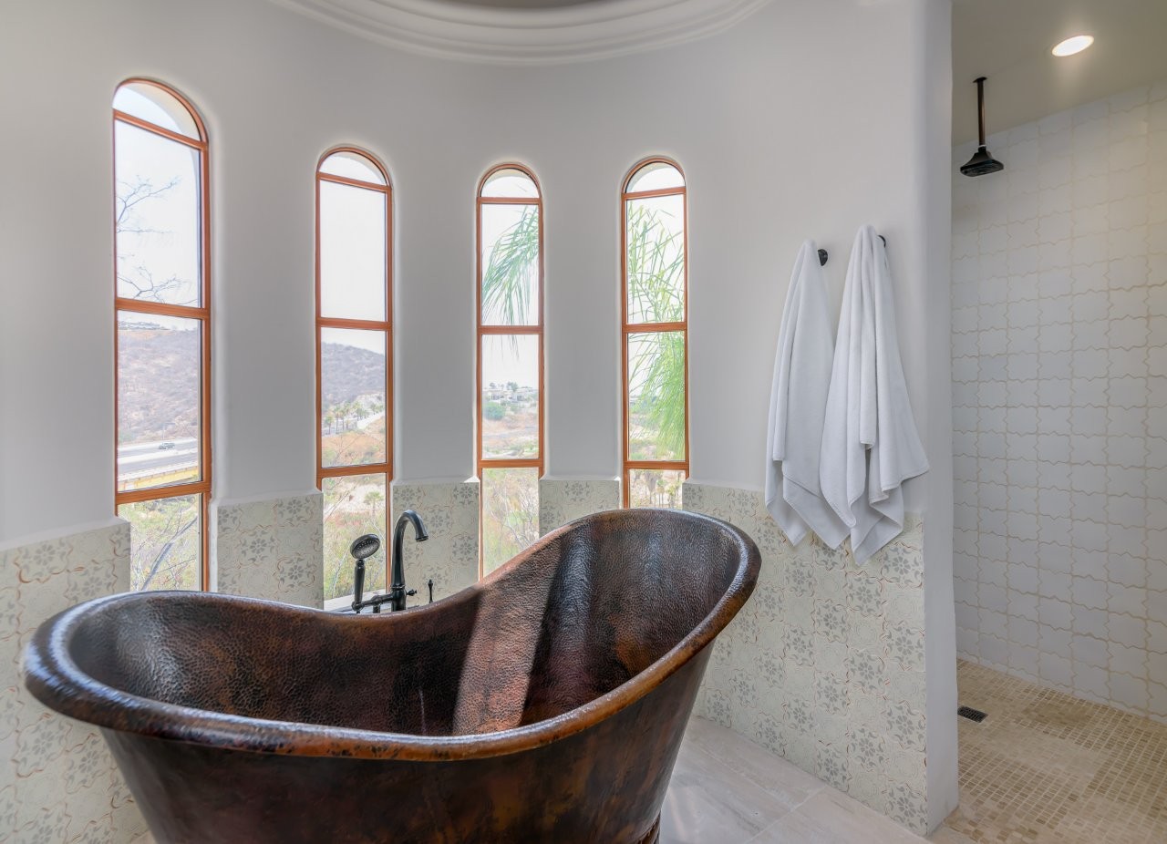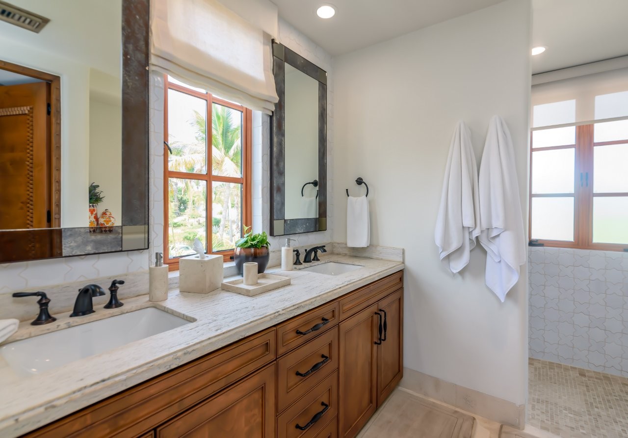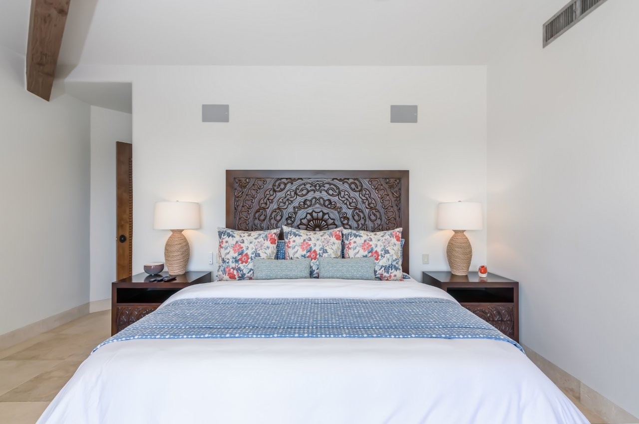 Casa Primera is a six-bedroom, eight-bath villa in the Palmilla community of San José del Cabo, 5,000 square feet with ocean and golf course views and a heated pool, jacuzzi, and wet bar on the main terrace. Sixteen guests across six bedrooms, each finished with hotel-quality linens, robes, toiletries, TV, closets, ceiling fans, and Wi-Fi. Dunes Club access is included — a private community club with pool, pickleball, tennis, spa, and gym — along with a complimentary golf cart for moving through the community.