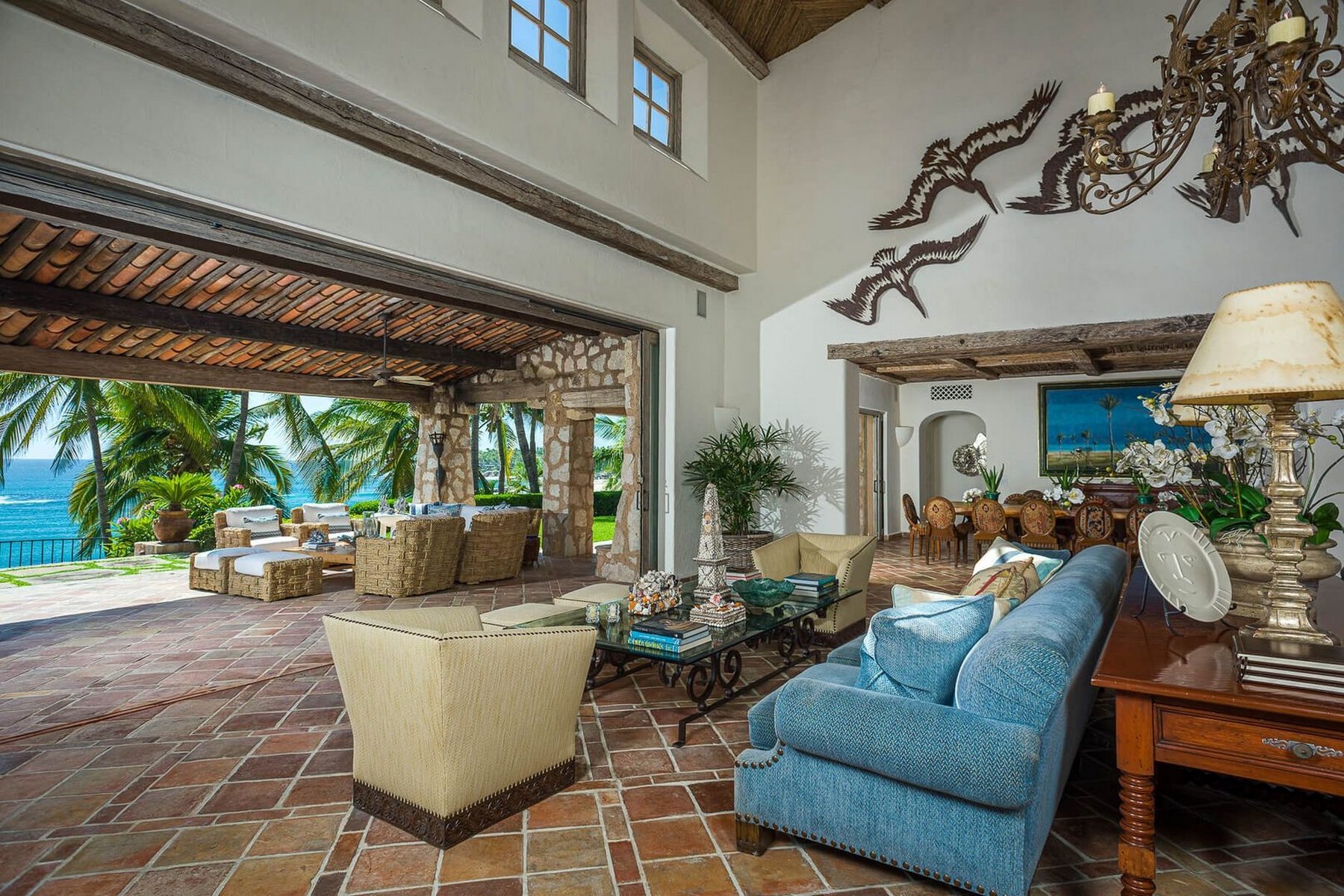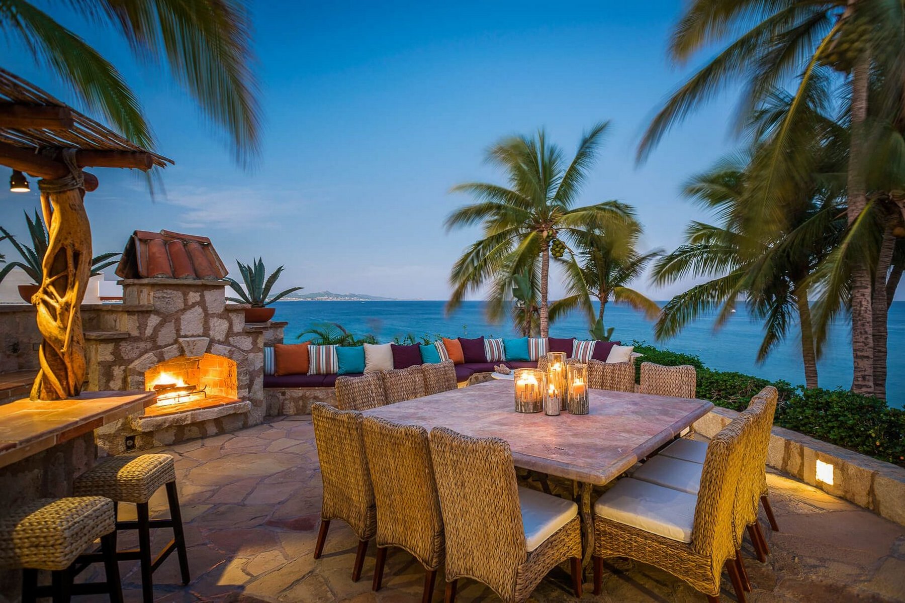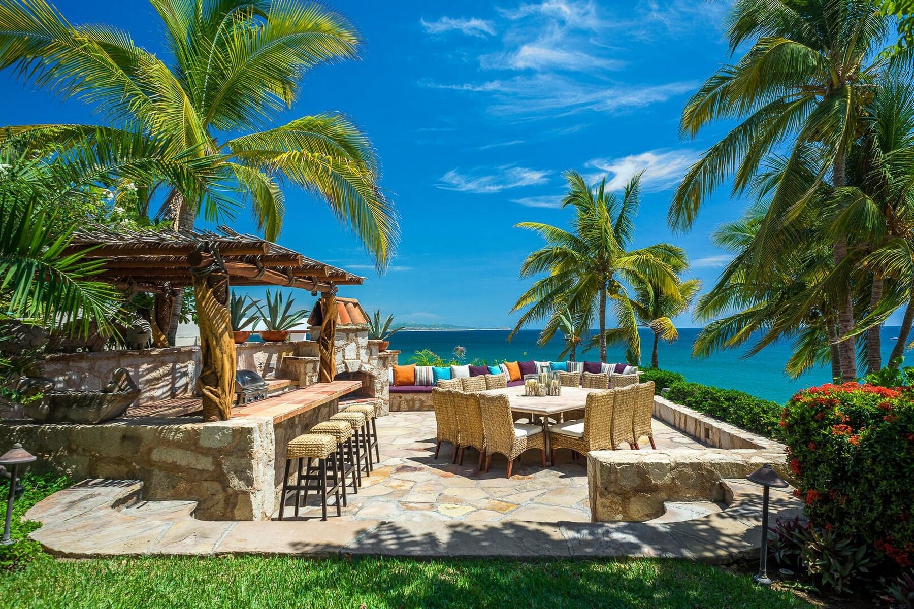 Koll Estate sits within Palmilla Norte in San José del Cabo directly on the swimmable shoreline of Palmilla Bay — one of the calmest and most consistently swimmable beaches in Los Cabos, wide and soft-sand and protected in a way that the Pacific-facing side of Cabo San Lucas is not. Eight bedrooms, ten baths, and 9,500 square feet built for multi-generational occupancy at the waterfront. Twenty guests, and the kind of outdoor footprint that supports them: multiple furnished terraces, a large heated pool, a jacuzzi, a private tennis court, a bocce court, a pool house with a wood-burning grill, a beachfront fire pit, chaise lounges, and a basketball hoop.