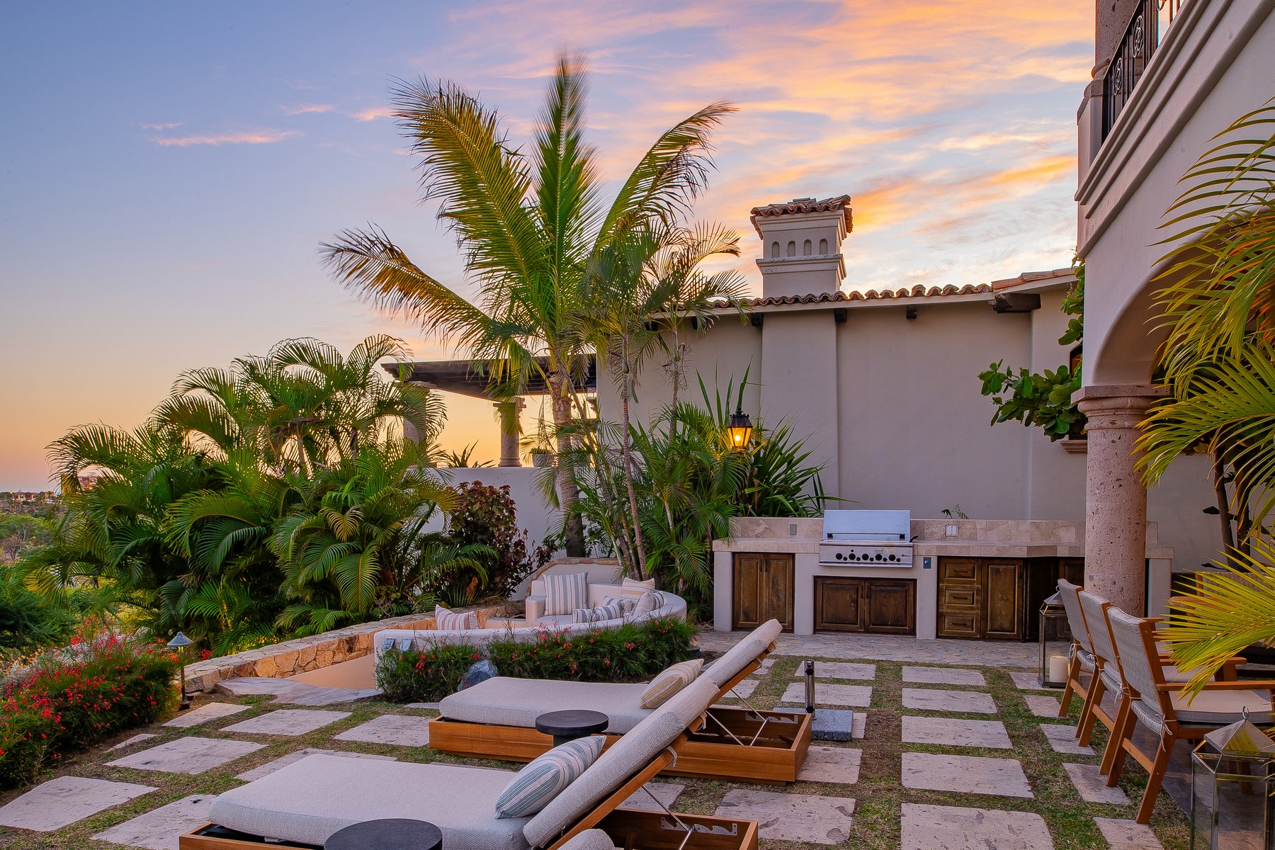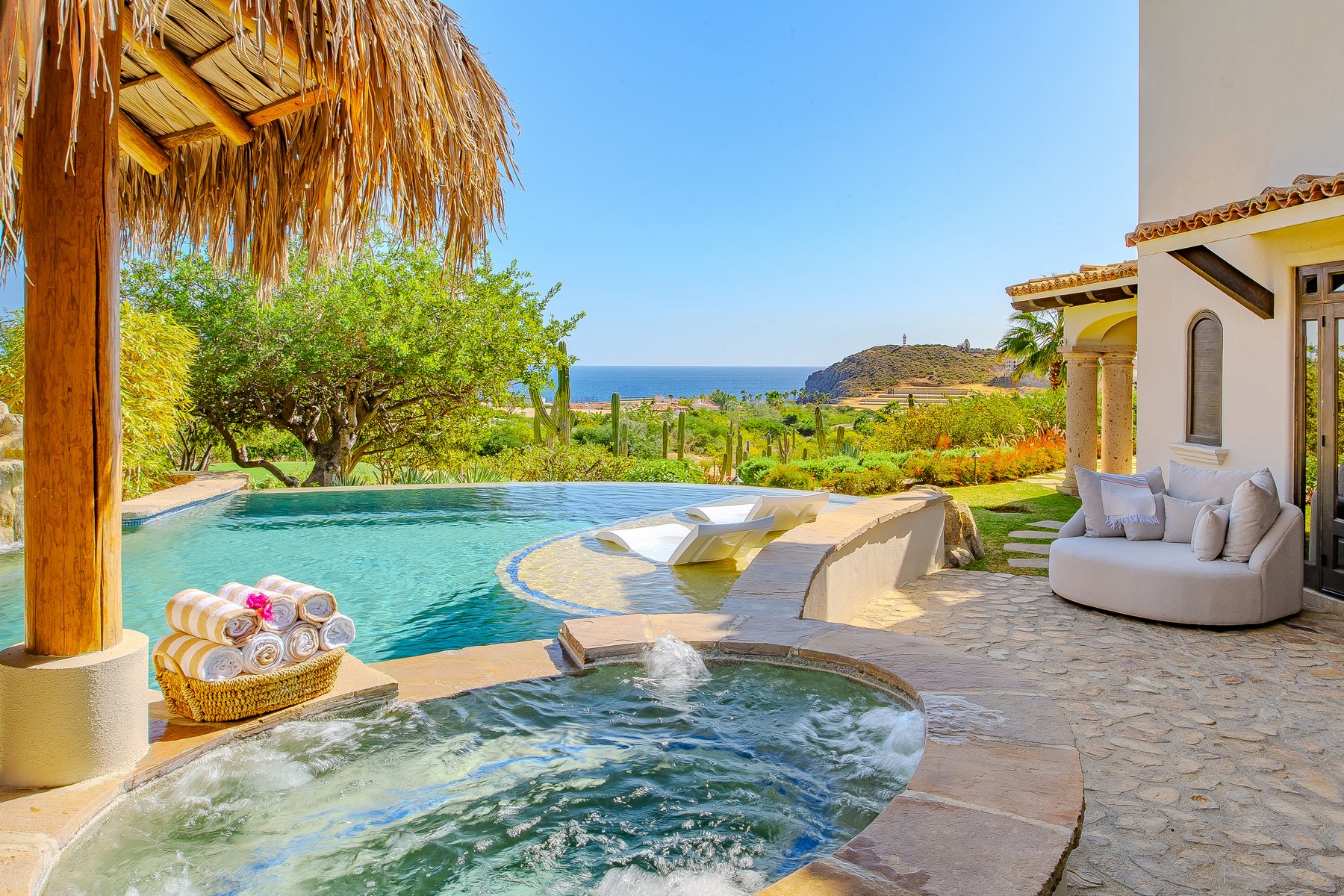 The outdoor space follows a familiar Cabo del Sol logic: infinity pool and jacuzzi side by side, a swim-up bar under a palapa, sun loungers, BBQ grill, and an alfresco dining area that transitions naturally into evenings around the fire pit. The views and sounds of the surrounding landscape give the terrace a quieter quality than properties closer to town — unhurried in a way that suits a group that wants to decompress rather than perform.