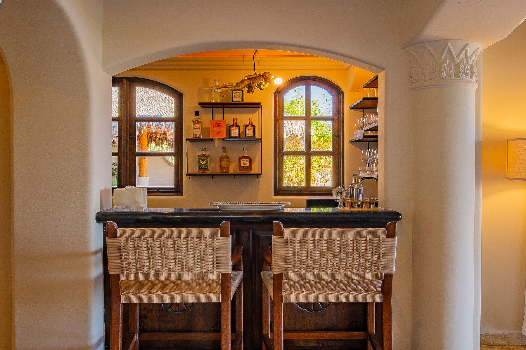 Inside, the renovation balanced comfort with character. Sofas oriented toward a large flat-screen TV, a fully equipped bar ready for cocktails or something simpler, and a layout that feels considered rather than staged. The kind of interior that settles a group in quickly without requiring any adjustment period.