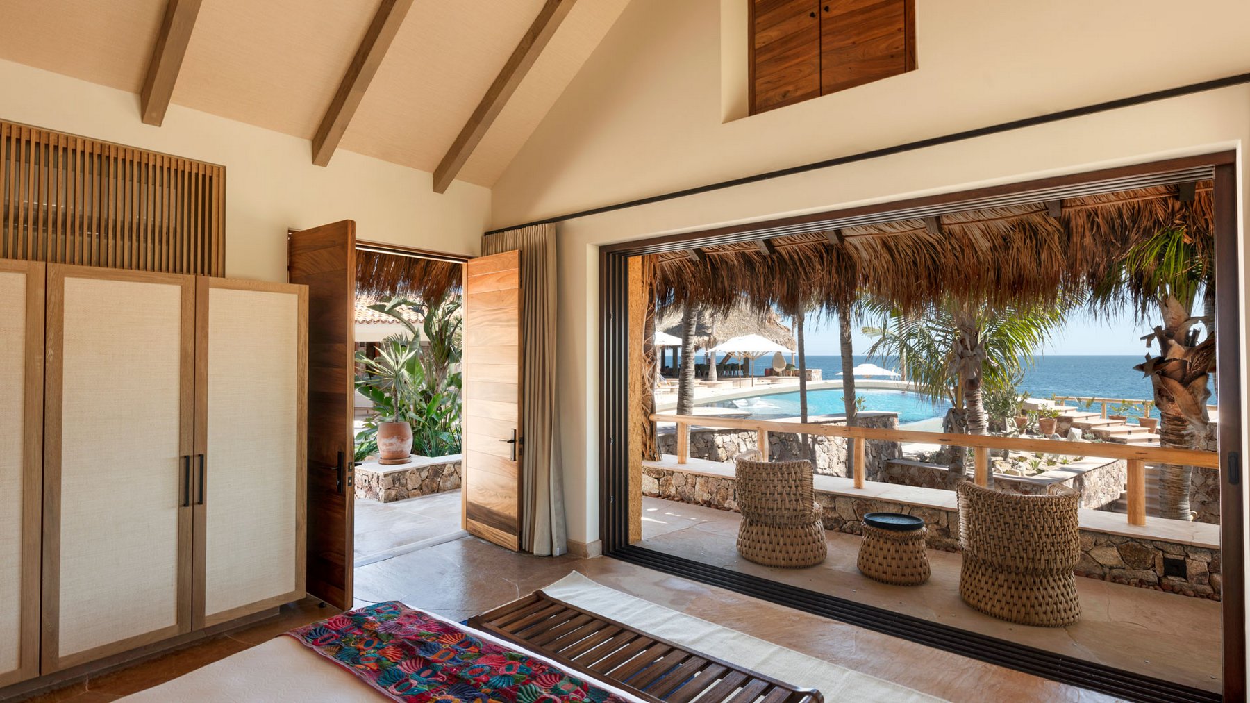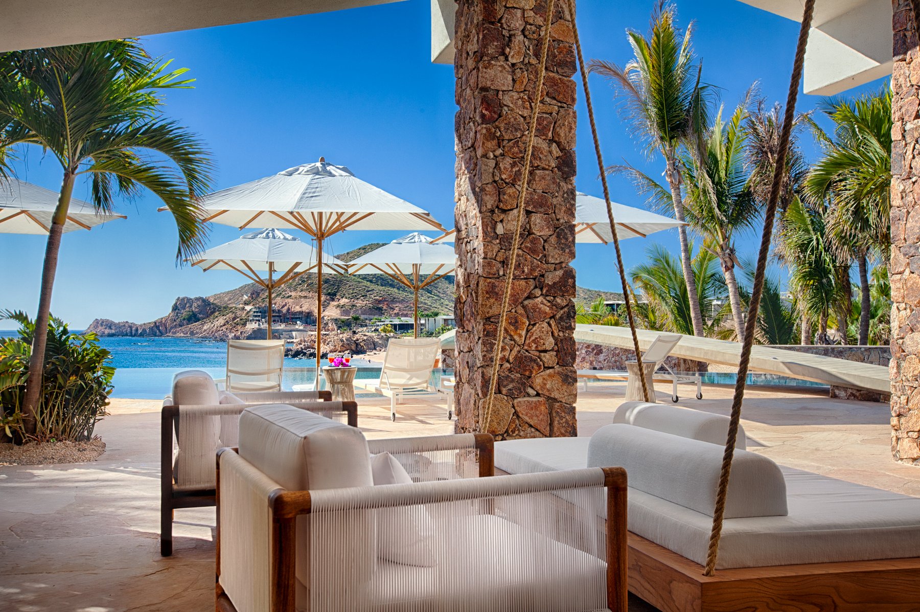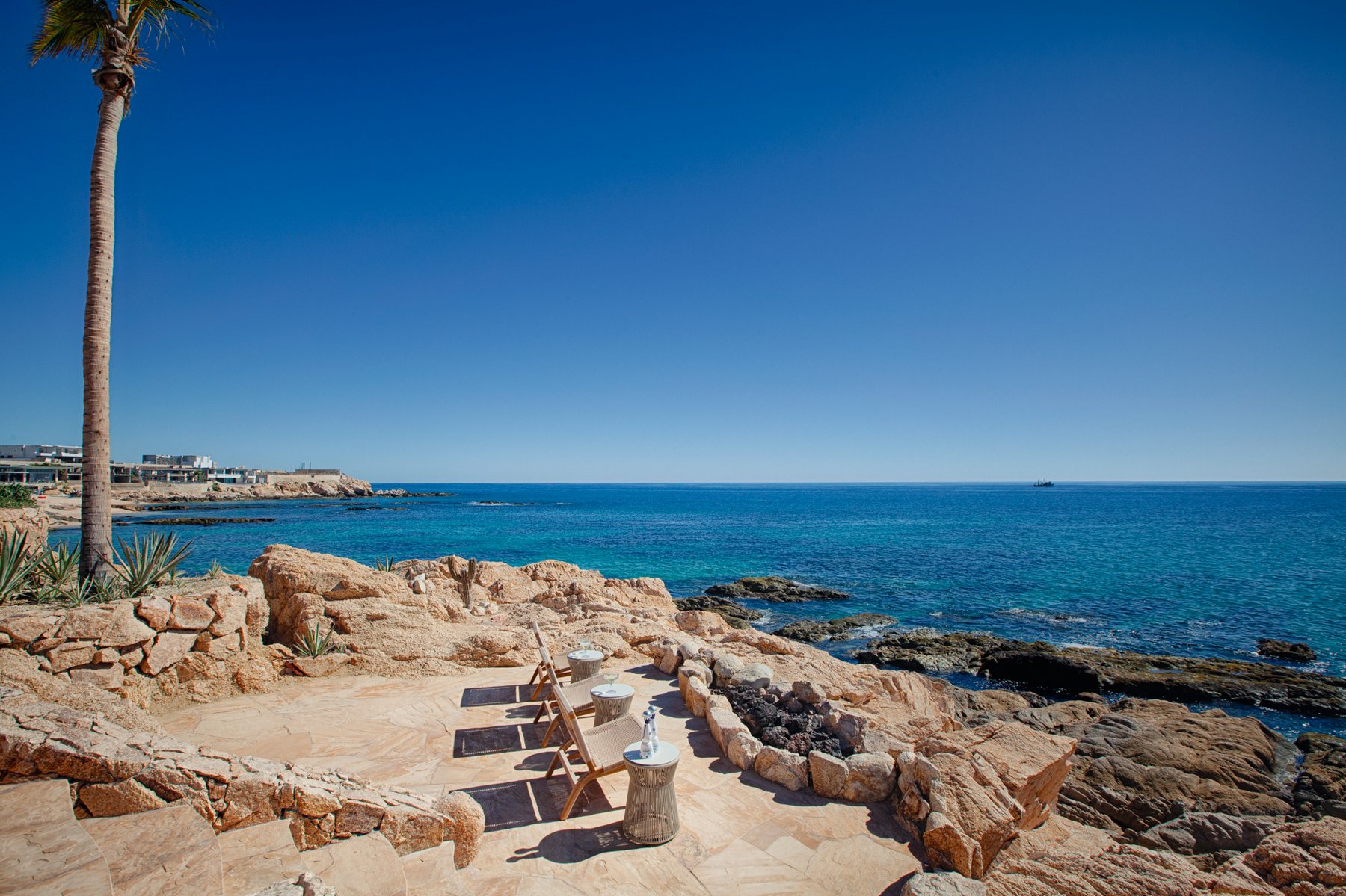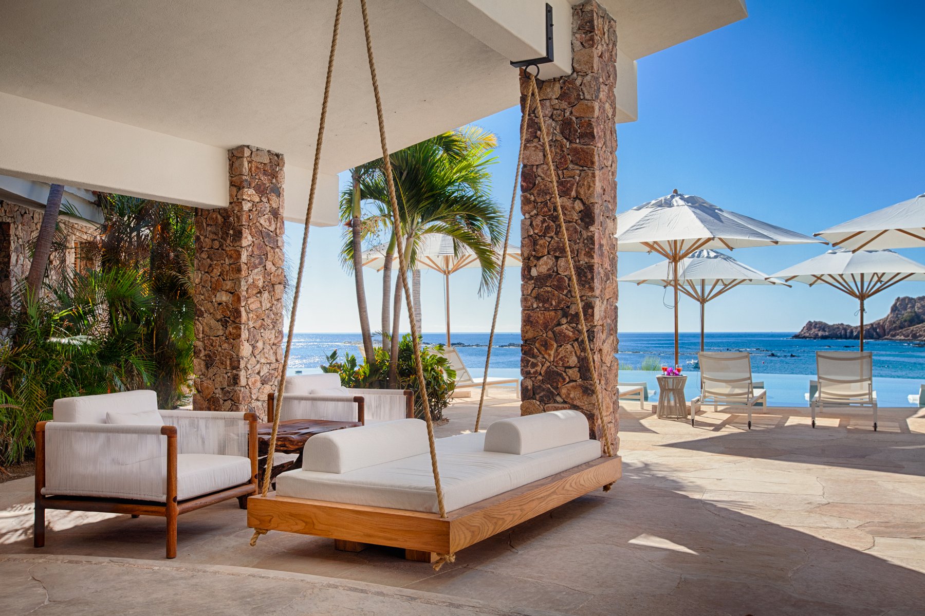 The outdoor terraces step along the edge of the property, oriented to capture the full span of the bay below. Seating, lounging, and gathering areas are distributed across the exterior rather than concentrated in one place, allowing the view to be experienced from multiple positions throughout the day. The pool and terrace spaces remain aligned with the horizon, so the entire exterior reads as one continuous plane facing the water. As the light moves across Chileno Bay, the perspective shifts without requiring anyone to move.