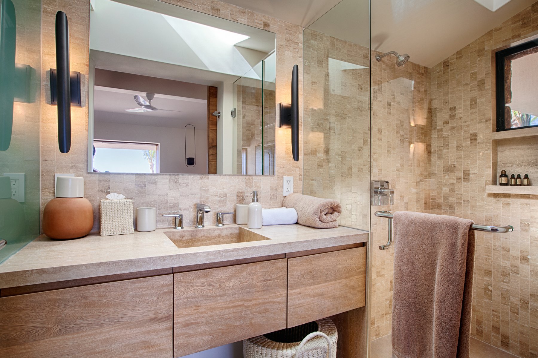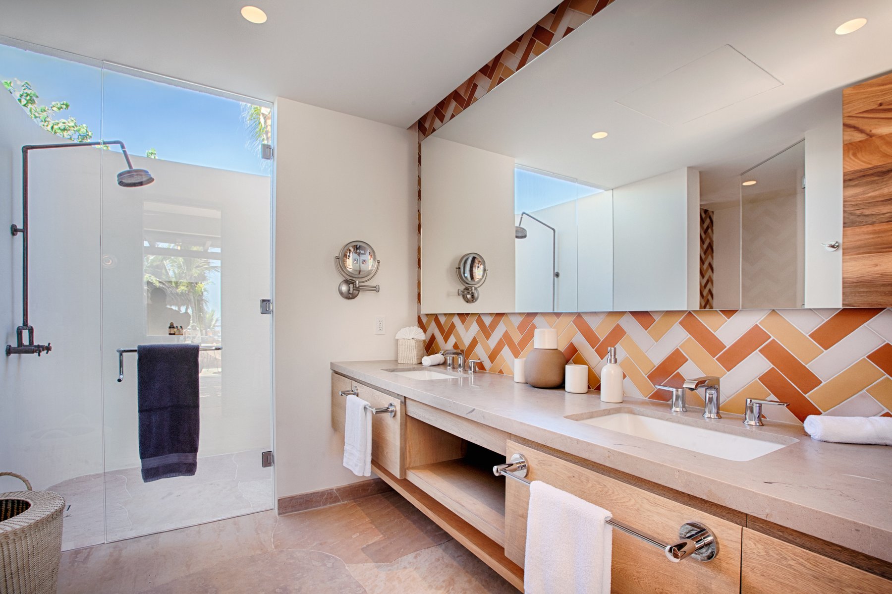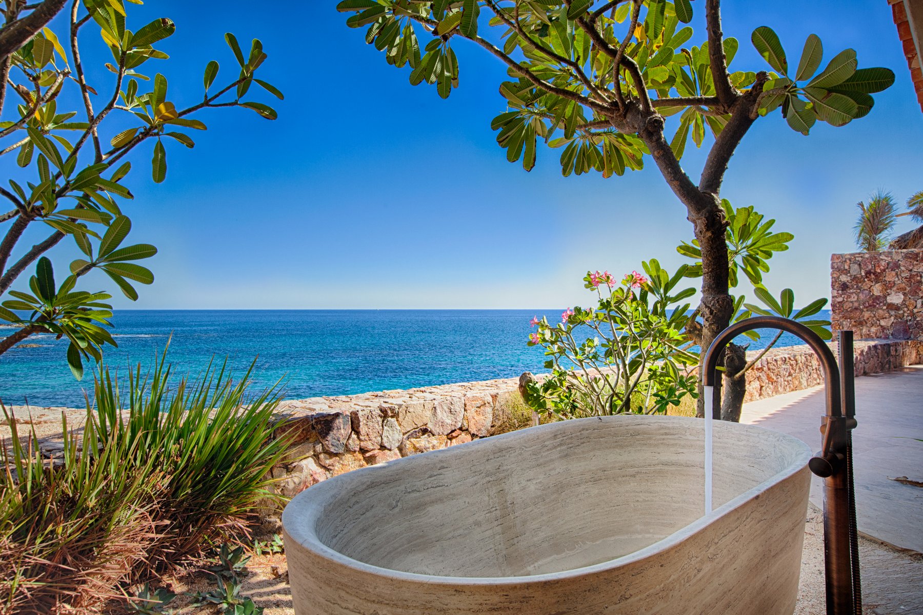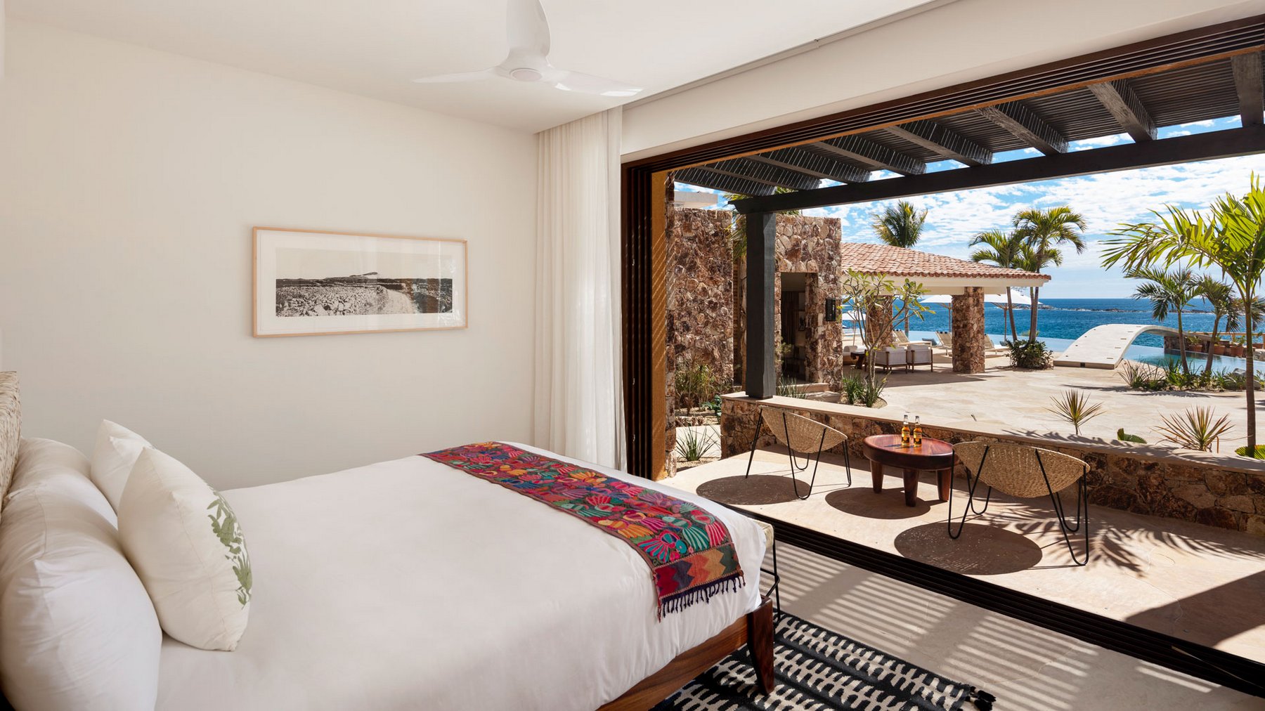 The outdoor terraces step along the edge of the property, oriented to capture the full span of the bay below. Seating, lounging, and gathering areas are distributed across the exterior rather than concentrated in one place, allowing the view to be experienced from multiple positions throughout the day. The pool and terrace spaces remain aligned with the horizon, so the entire exterior reads as one continuous plane facing the water. As the light moves across Chileno Bay, the perspective shifts without requiring anyone to move.