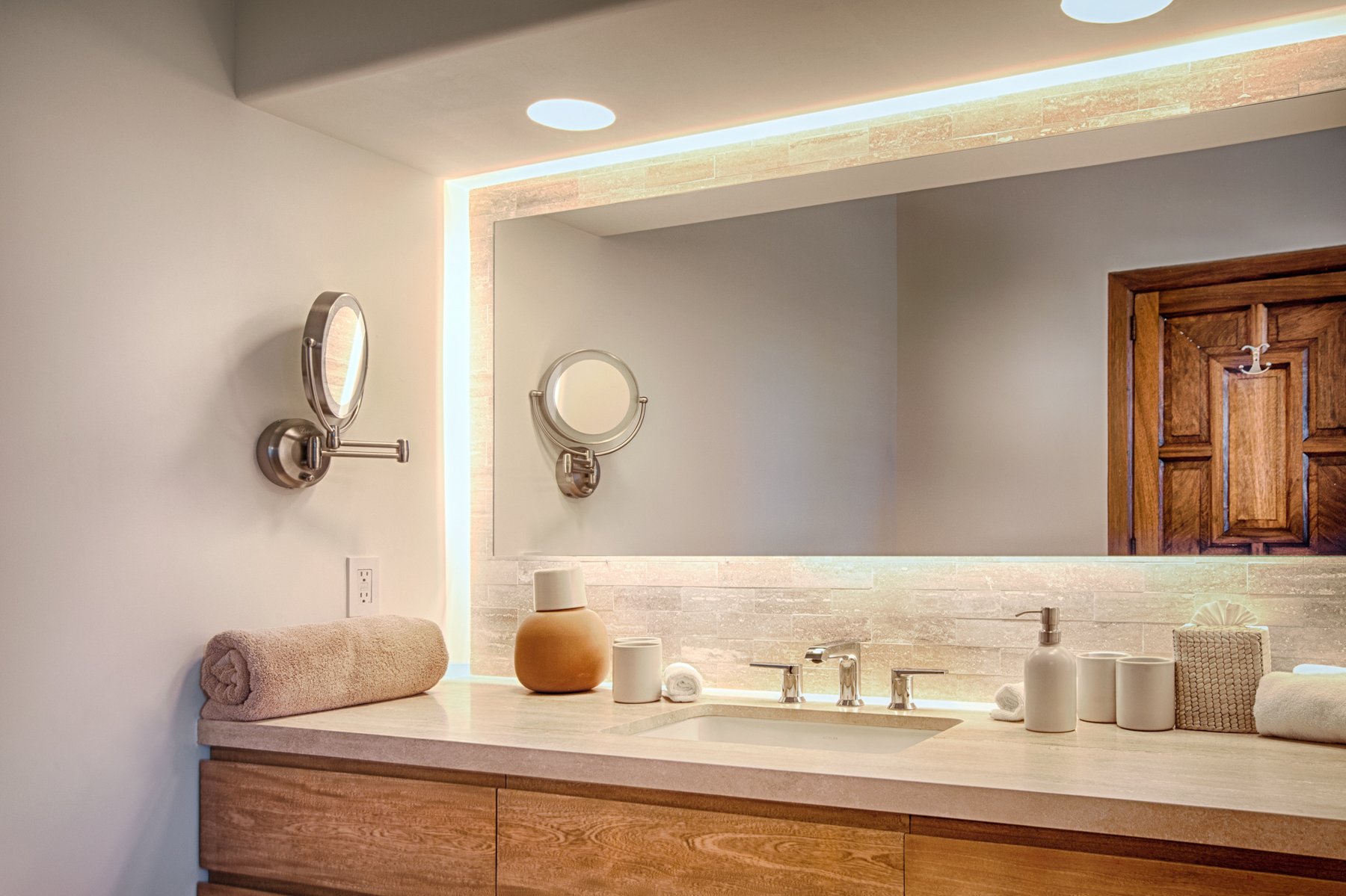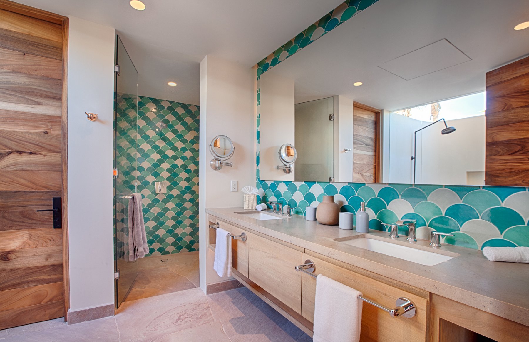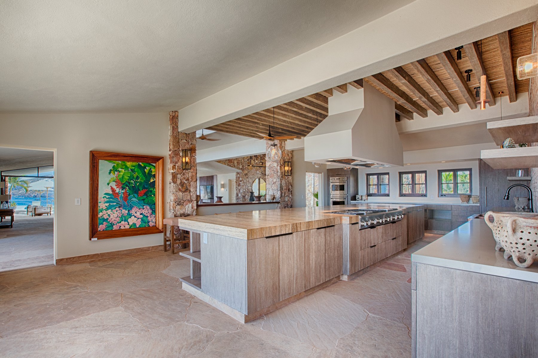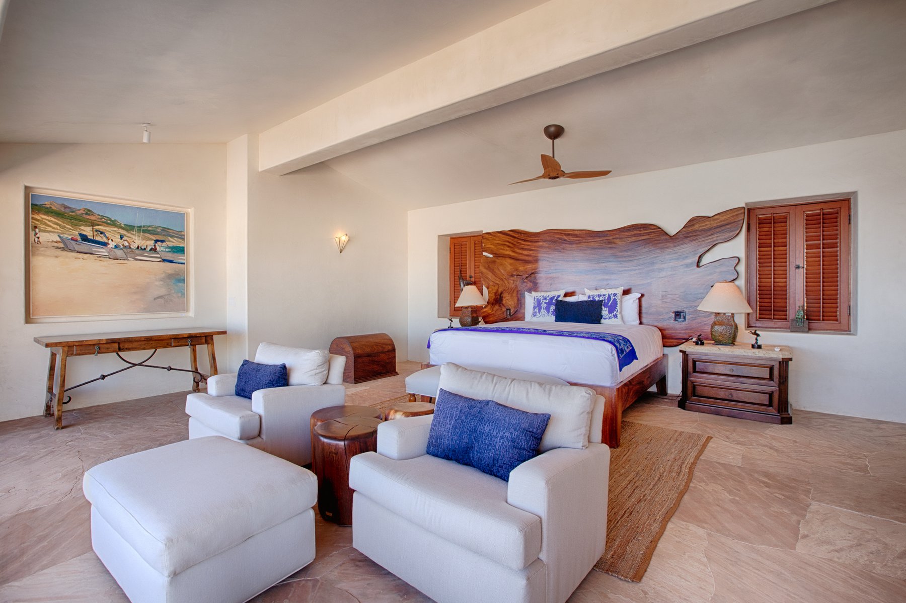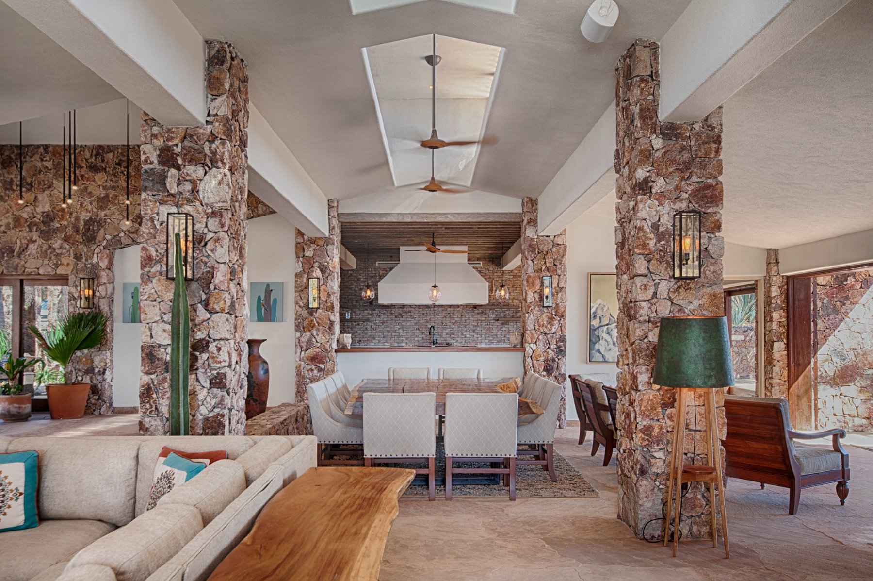Inside, the home combines the proportions of a traditional Cabo estate with updates that bring the layout into current use. Large living areas open toward the terraces, while eight bedrooms are positioned to maintain both privacy and access to the view. The structure allows groups to occupy the home at scale without compressing activity into a single area, supporting both shared time and complete separation when needed.