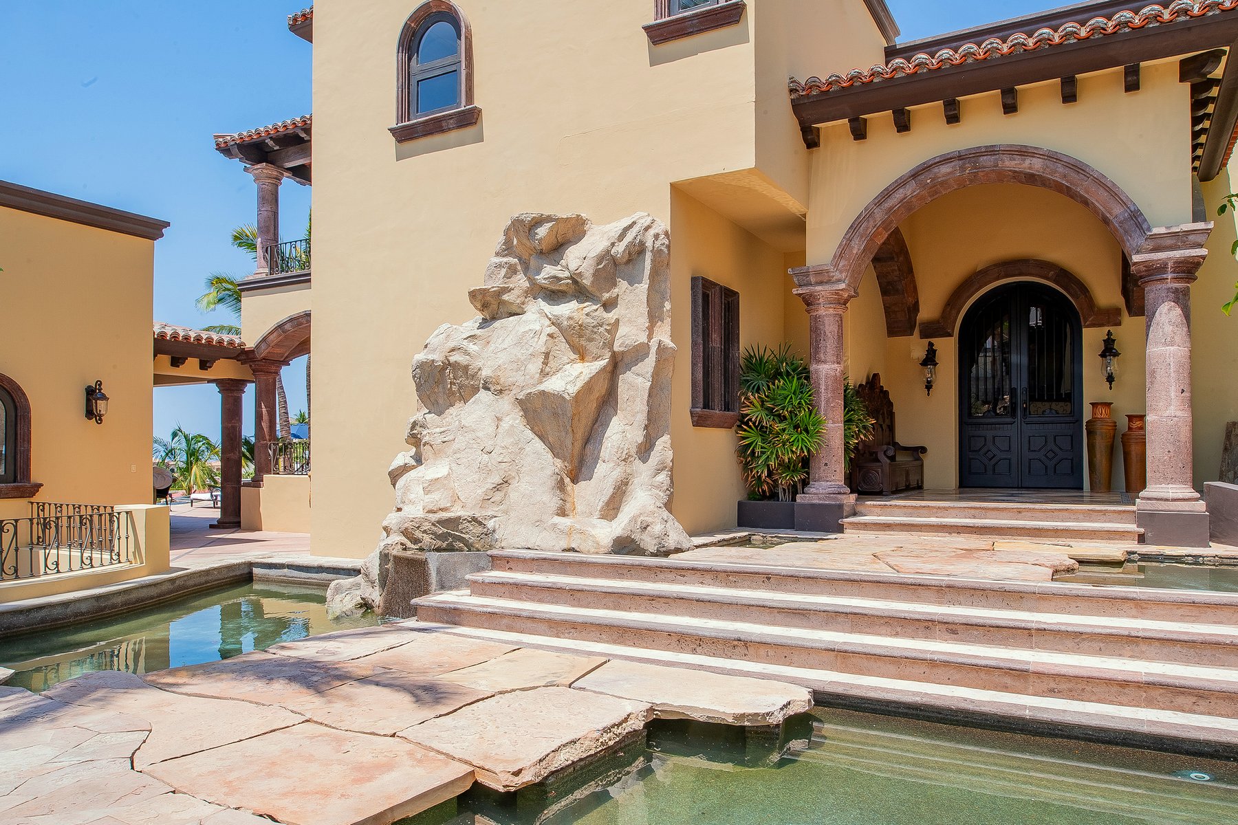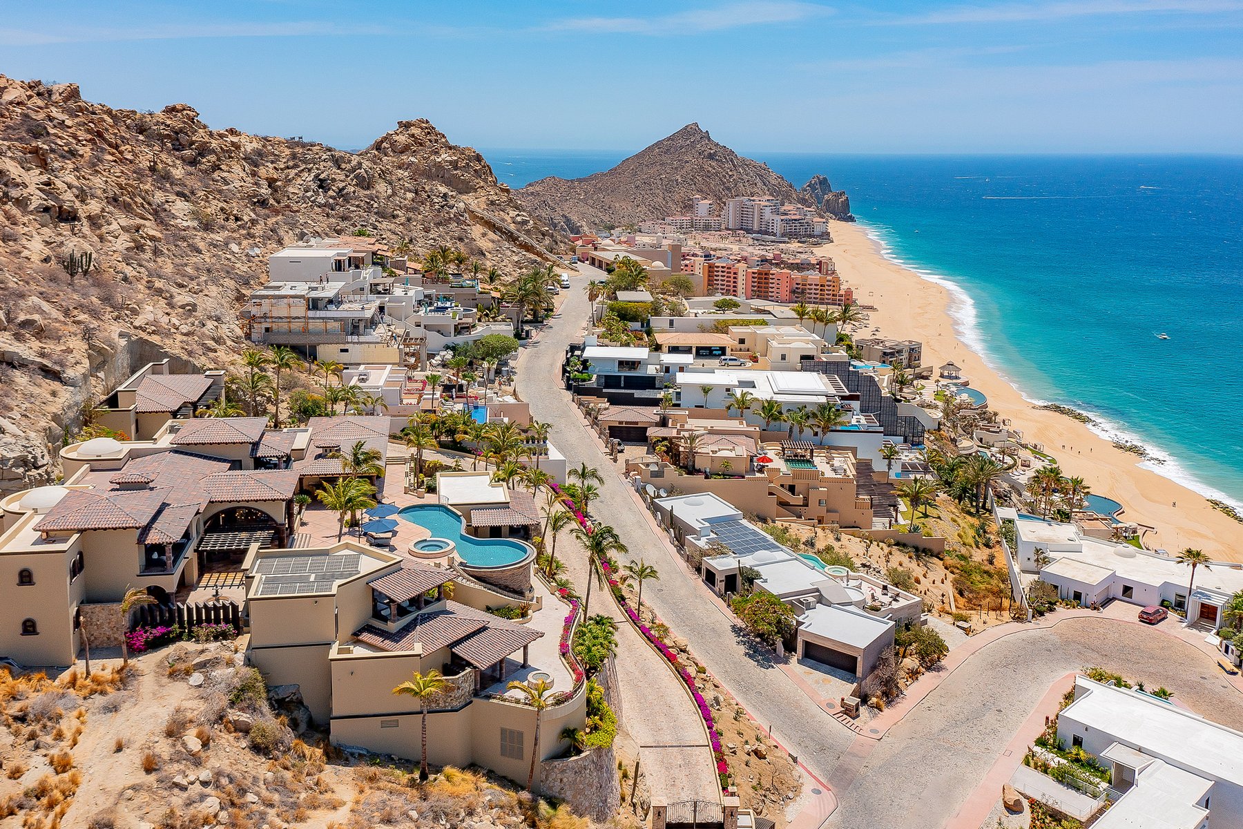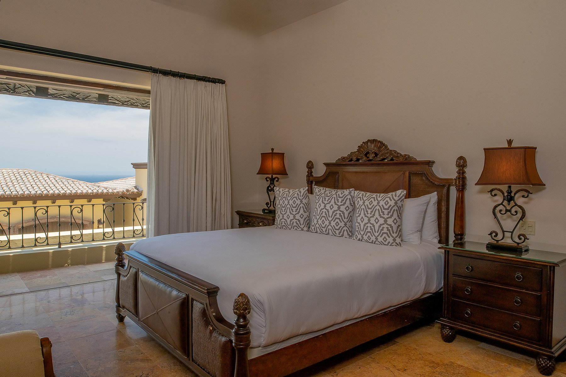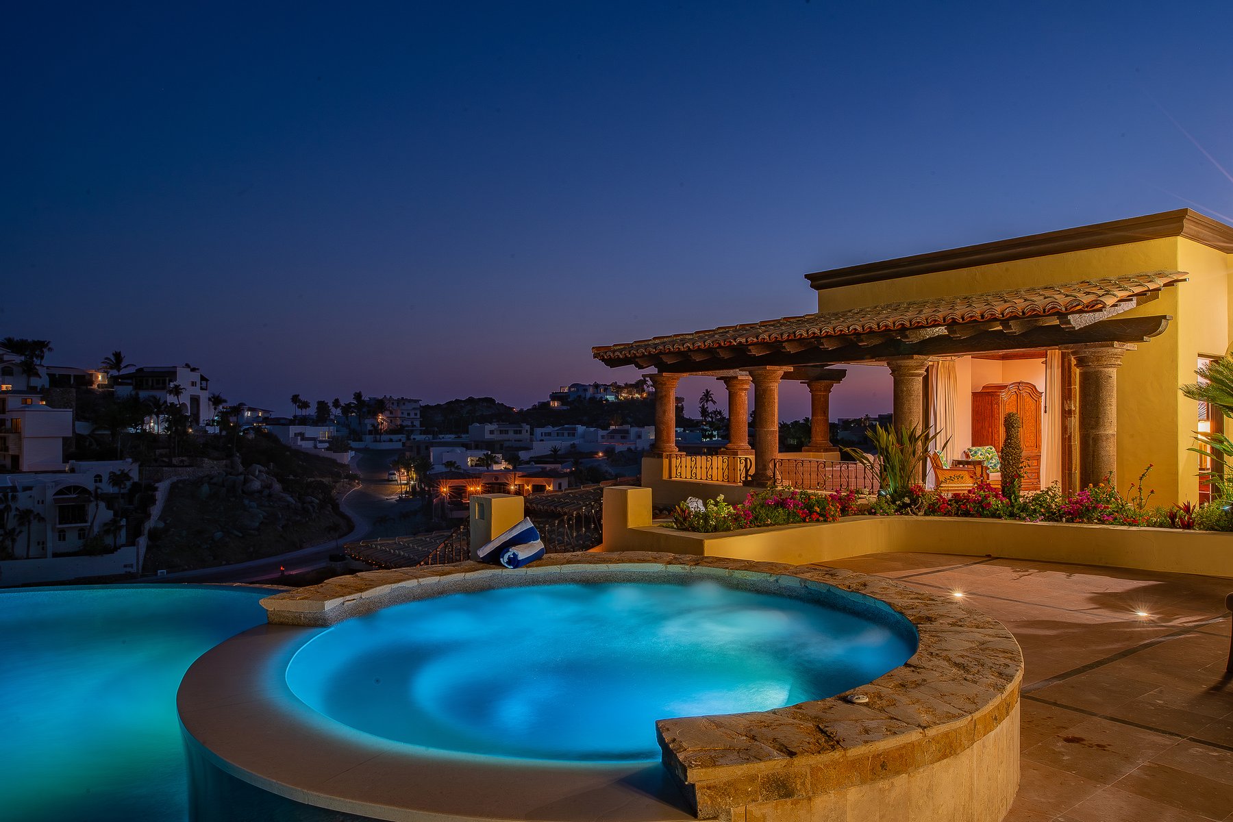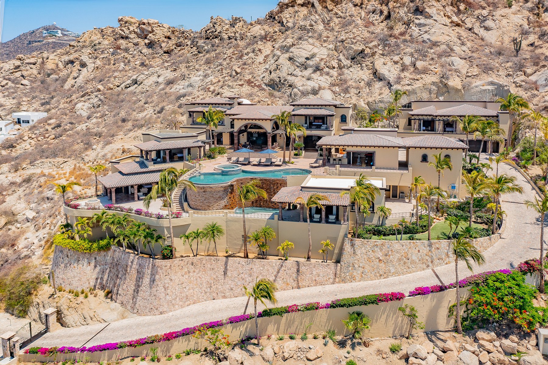 Villa de los Sueños is an eight-bedroom villa rental in the gated Pedregal community of Cabo San Lucas — 11,000 square feet of Spanish hacienda architecture adjacent to downtown and the marina, with Pacific Ocean views from an elevation that keeps the property above the main activity while remaining minutes from it. Eight bedrooms, nine baths, and eighteen guests across cream-colored walls, marble flooring, granite and marble countertops, and colonial-palace architectural details that carry through every room.