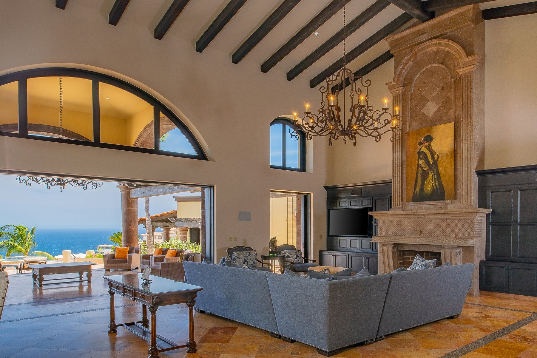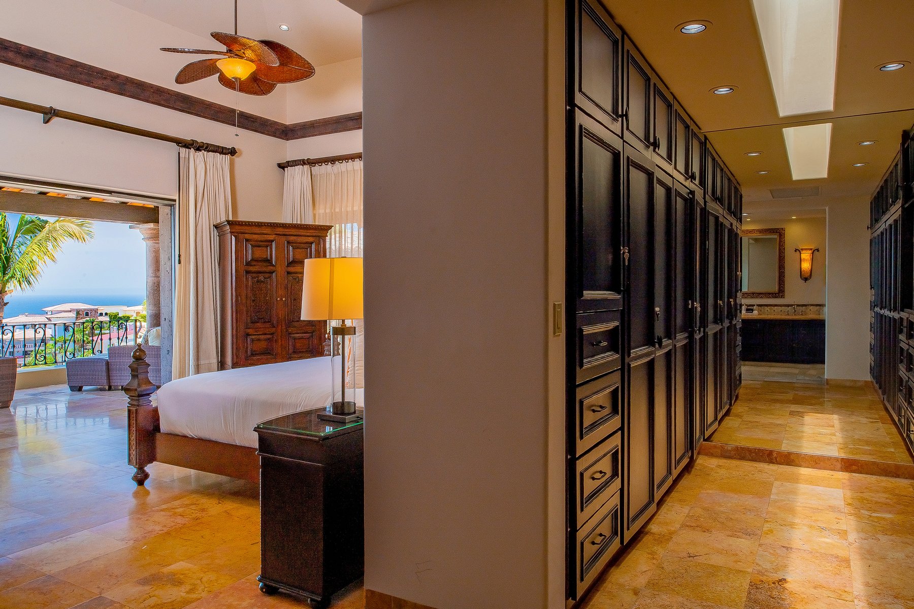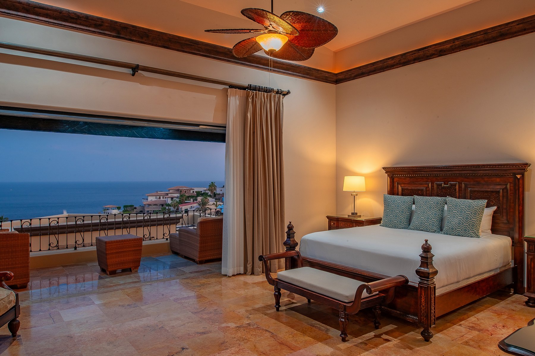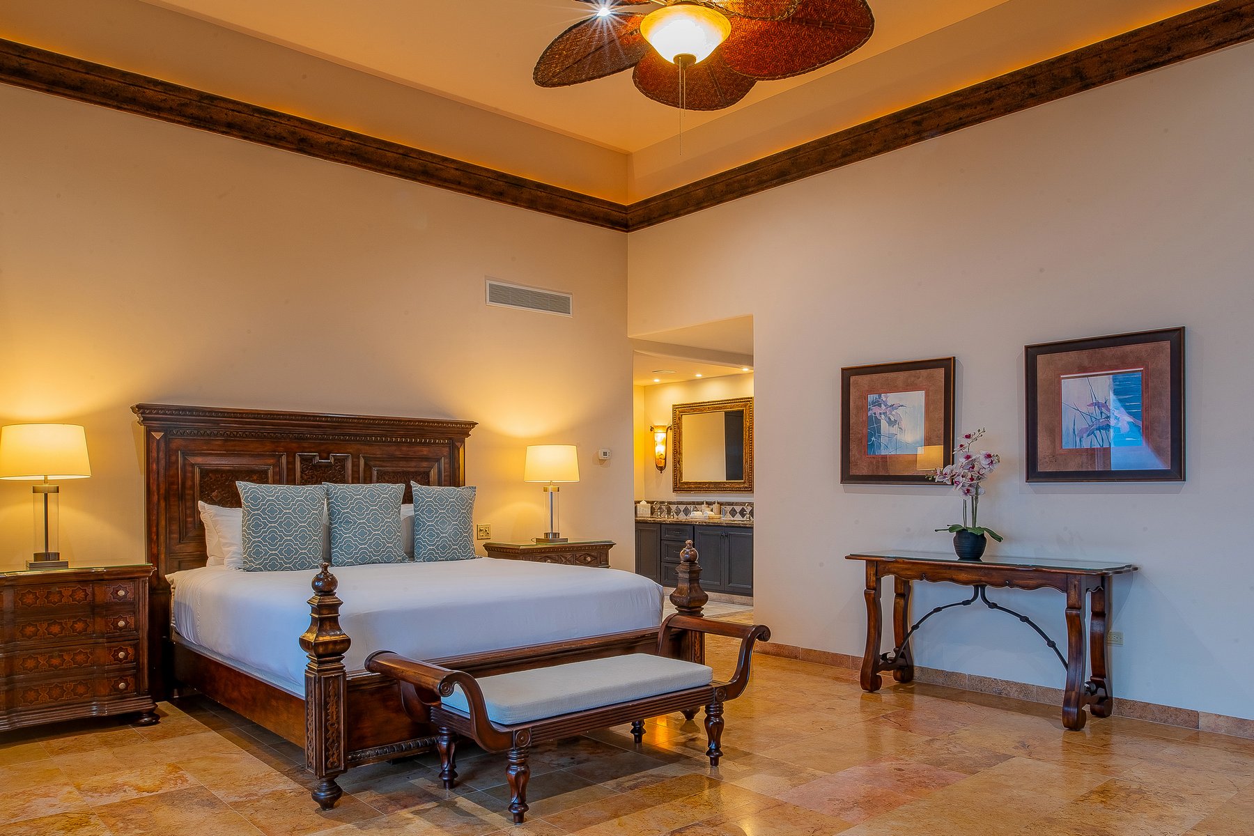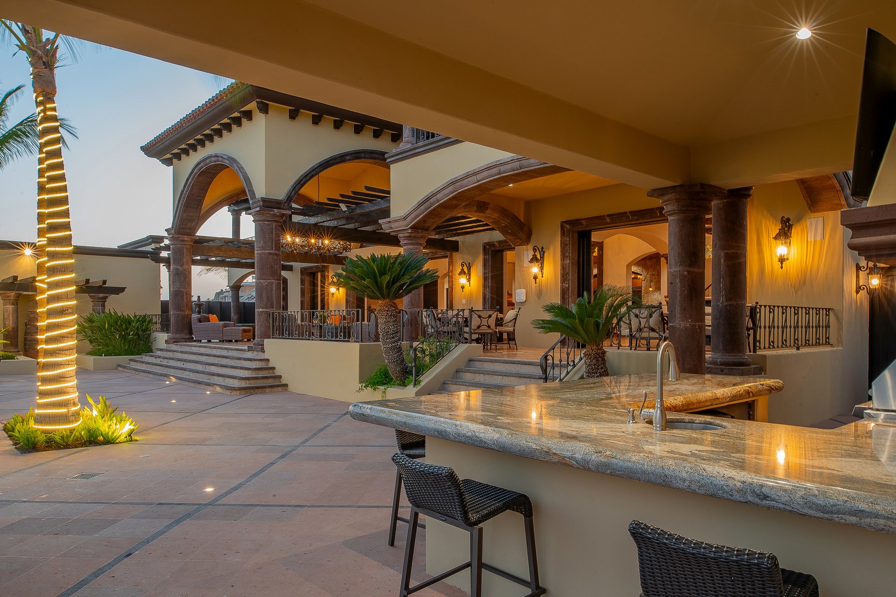 Villa de los Sueños is an eight-bedroom villa rental in the gated Pedregal community of Cabo San Lucas — 11,000 square feet of Spanish hacienda architecture adjacent to downtown and the marina, with Pacific Ocean views from an elevation that keeps the property above the main activity while remaining minutes from it. Eight bedrooms, nine baths, and eighteen guests across cream-colored walls, marble flooring, granite and marble countertops, and colonial-palace architectural details that carry through every room.