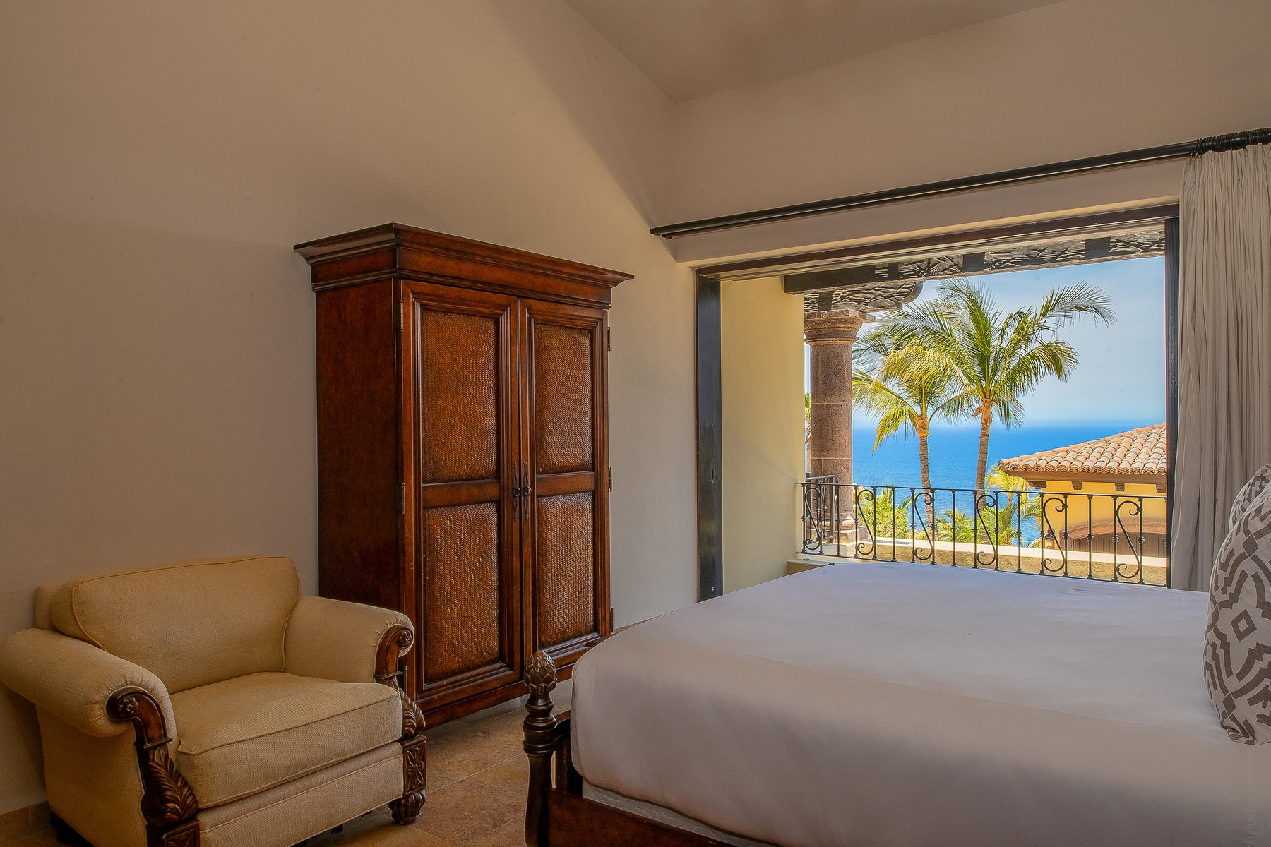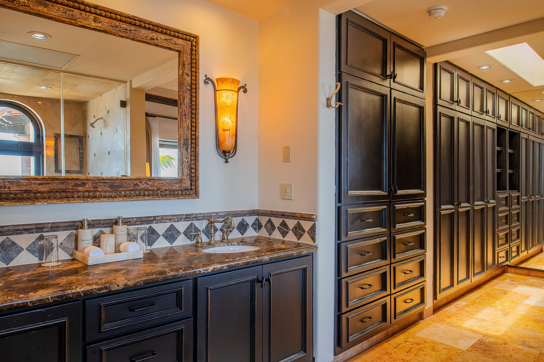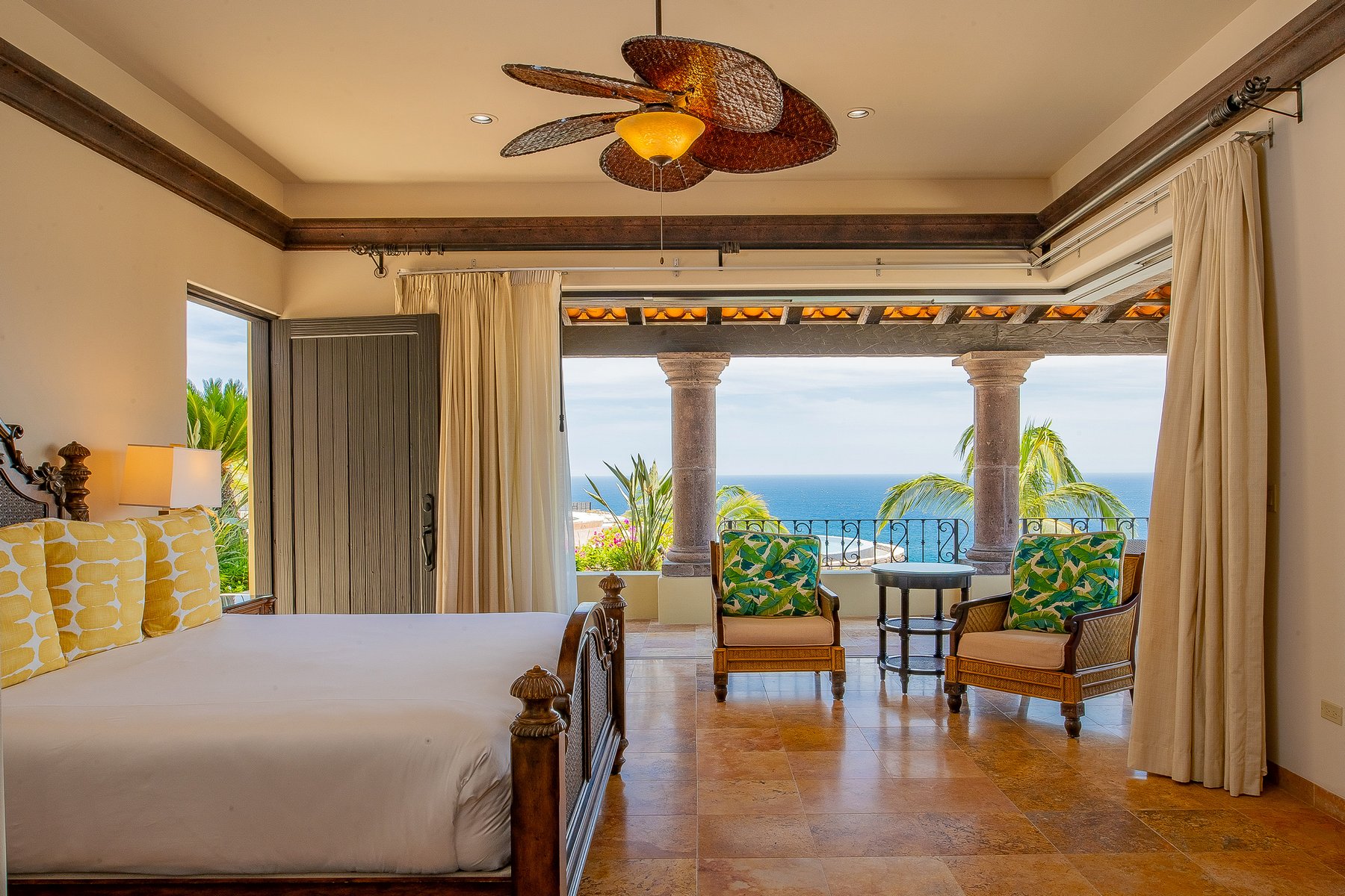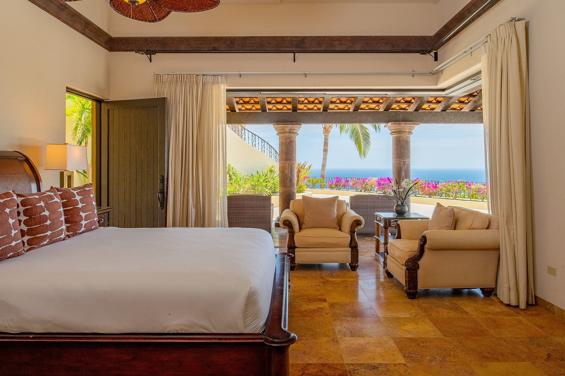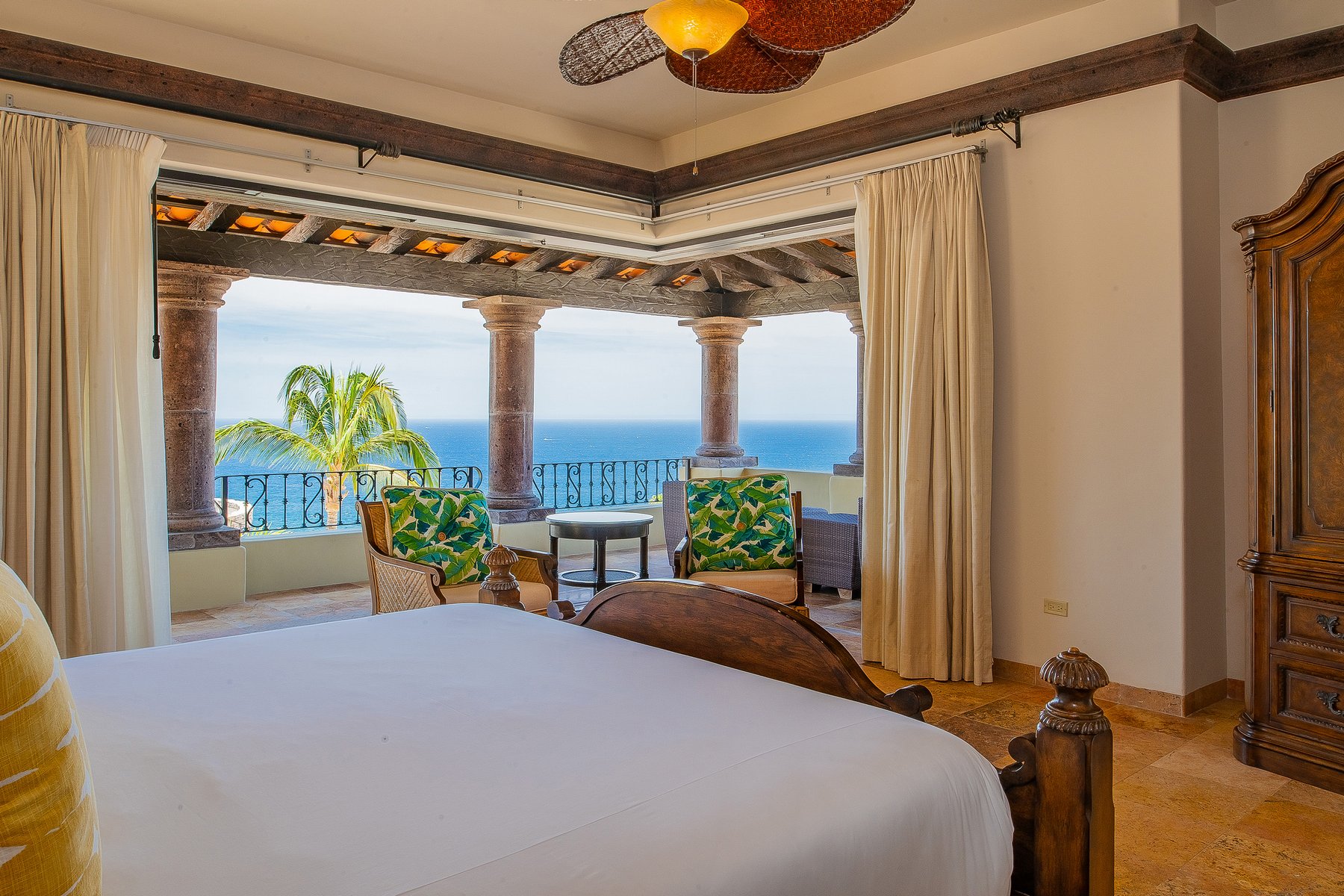 Villa de los Sueños is an eight-bedroom villa rental in the gated Pedregal community of Cabo San Lucas — 11,000 square feet of Spanish hacienda architecture adjacent to downtown and the marina, with Pacific Ocean views from an elevation that keeps the property above the main activity while remaining minutes from it. Eight bedrooms, nine baths, and eighteen guests across cream-colored walls, marble flooring, granite and marble countertops, and colonial-palace architectural details that carry through every room.
