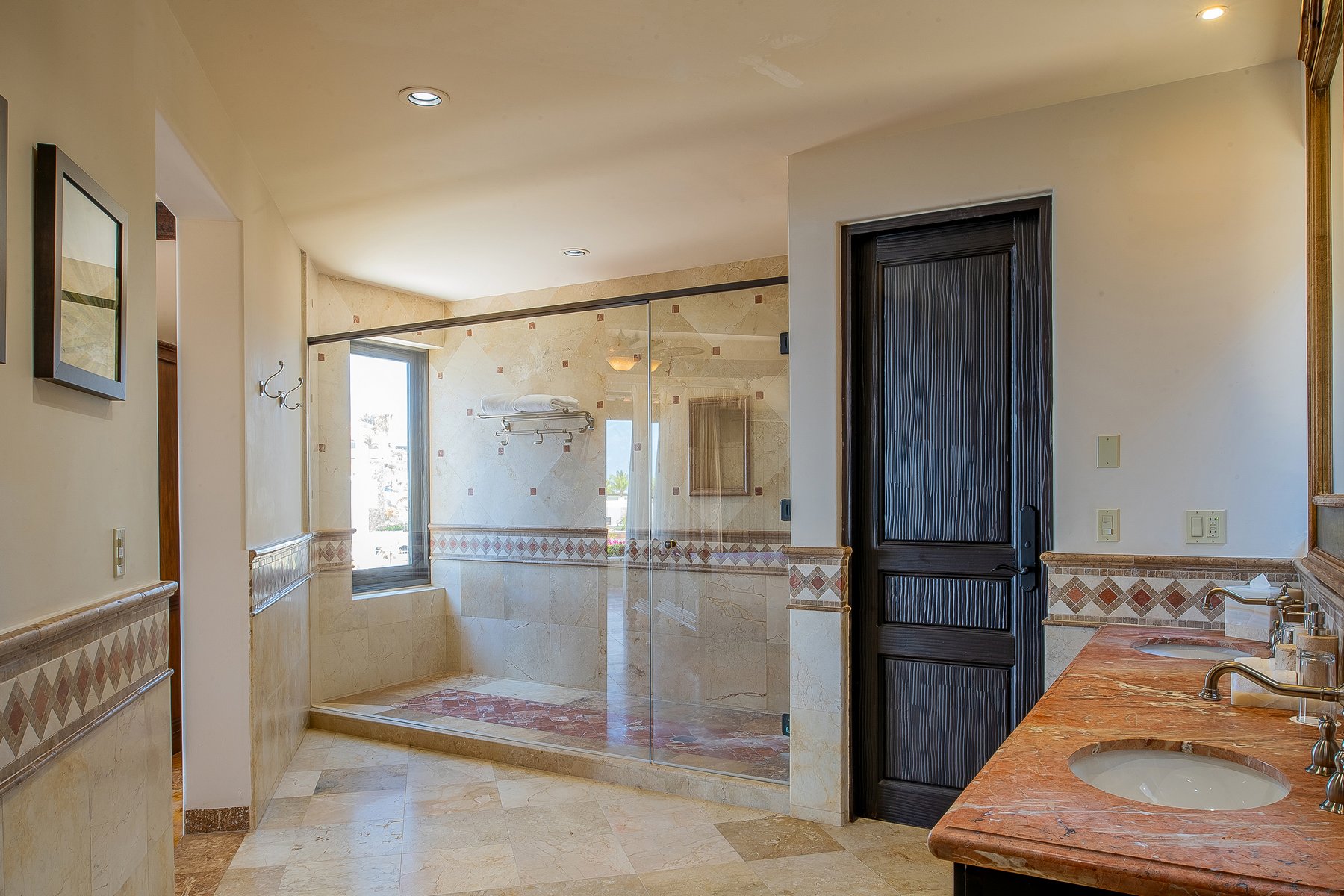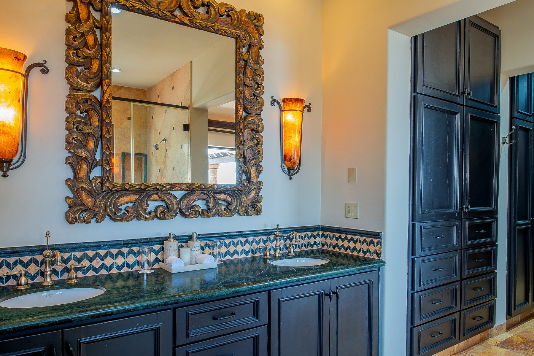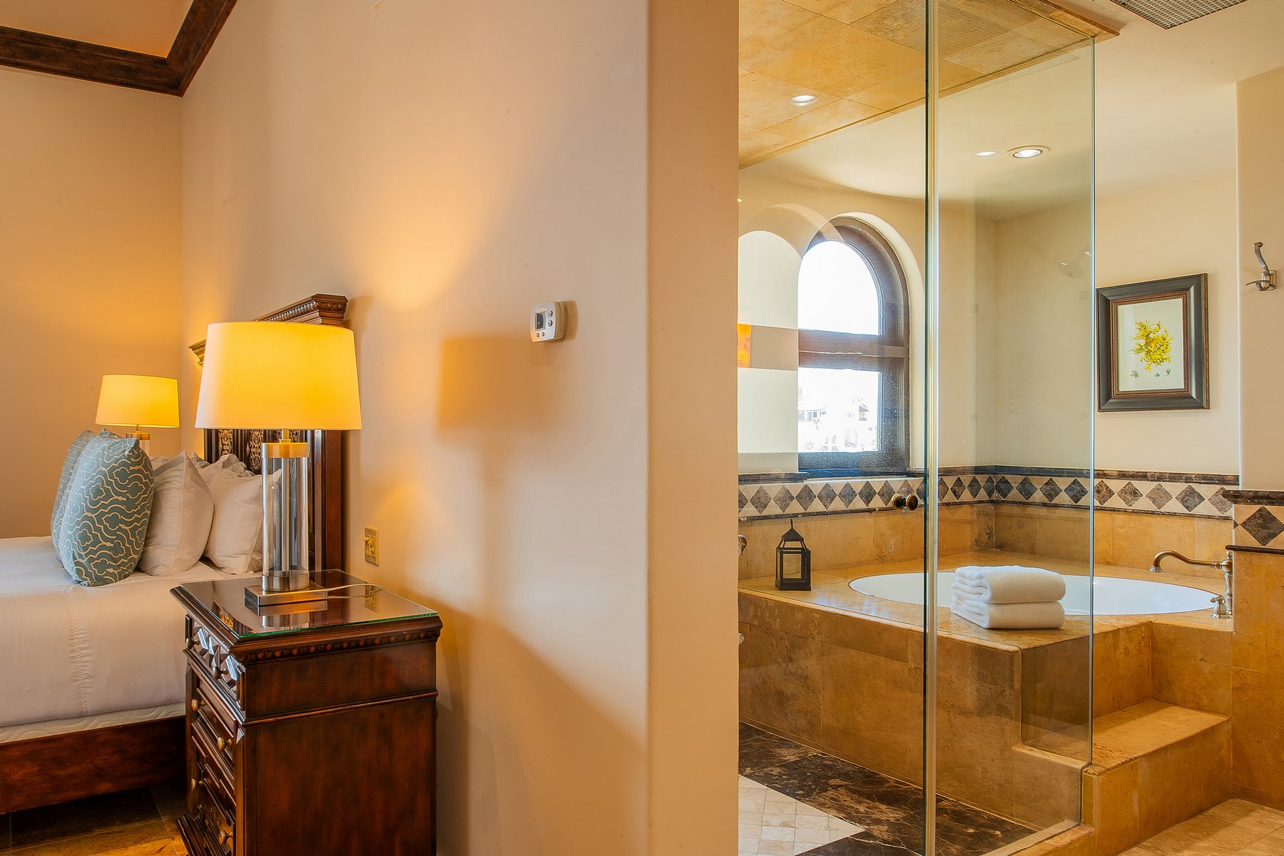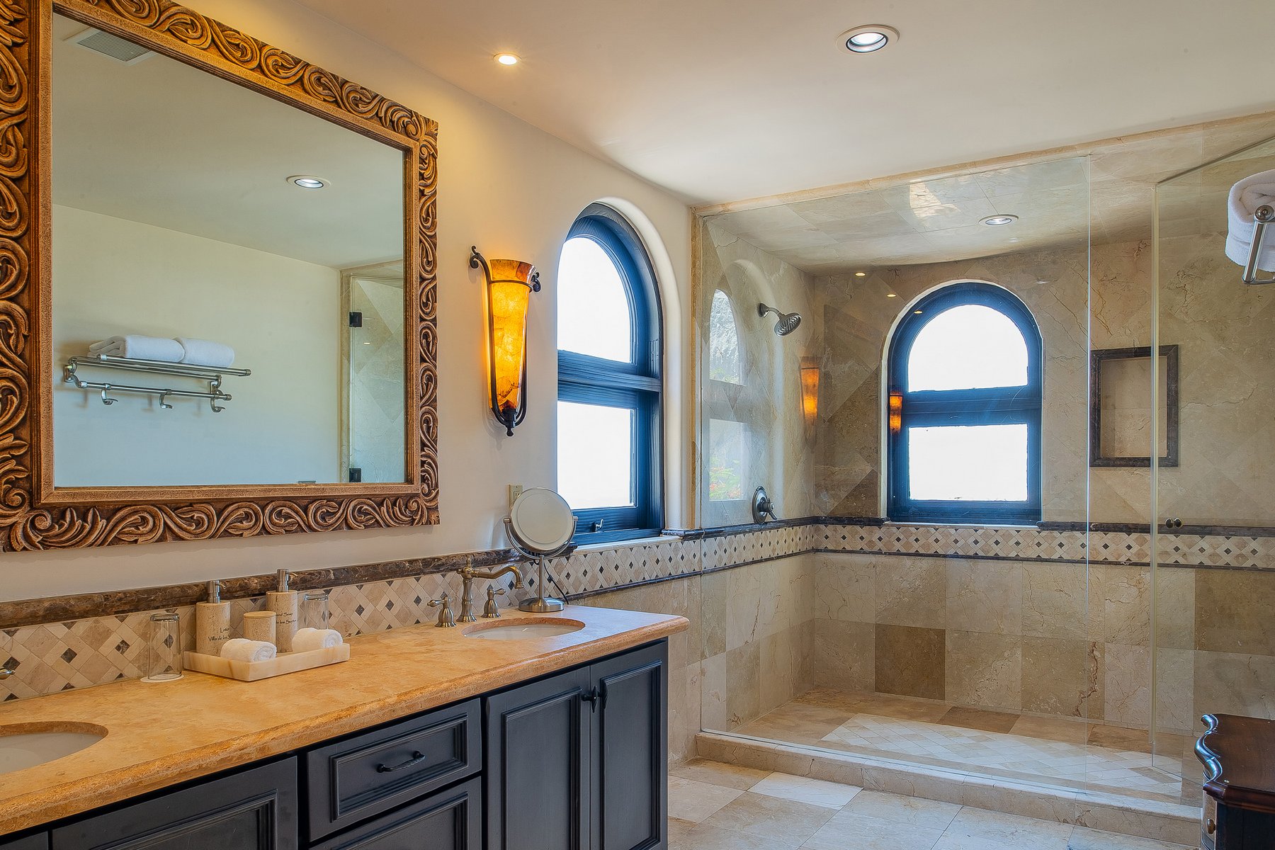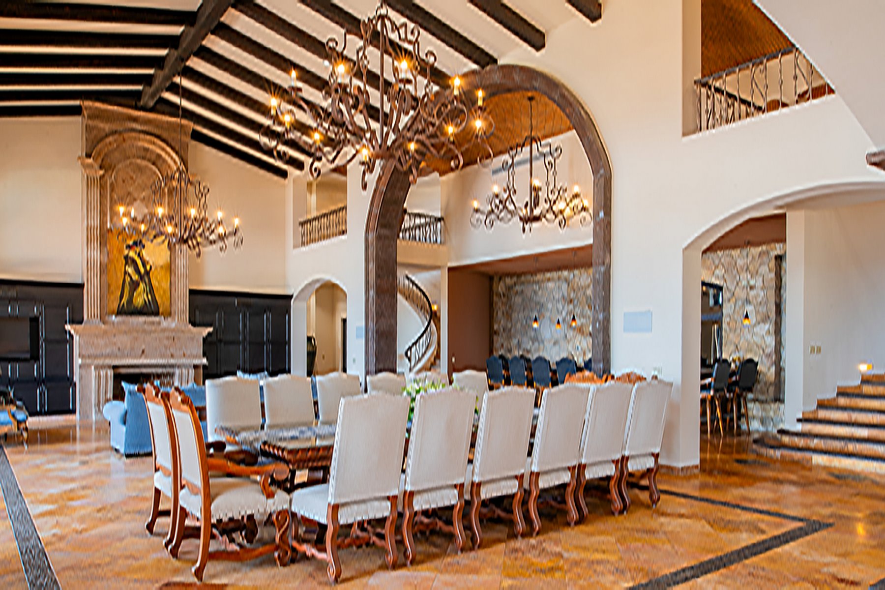 Villa de los Sueños is an eight-bedroom villa rental in the gated Pedregal community of Cabo San Lucas — 11,000 square feet of Spanish hacienda architecture adjacent to downtown and the marina, with Pacific Ocean views from an elevation that keeps the property above the main activity while remaining minutes from it. Eight bedrooms, nine baths, and eighteen guests across cream-colored walls, marble flooring, granite and marble countertops, and colonial-palace architectural details that carry through every room.