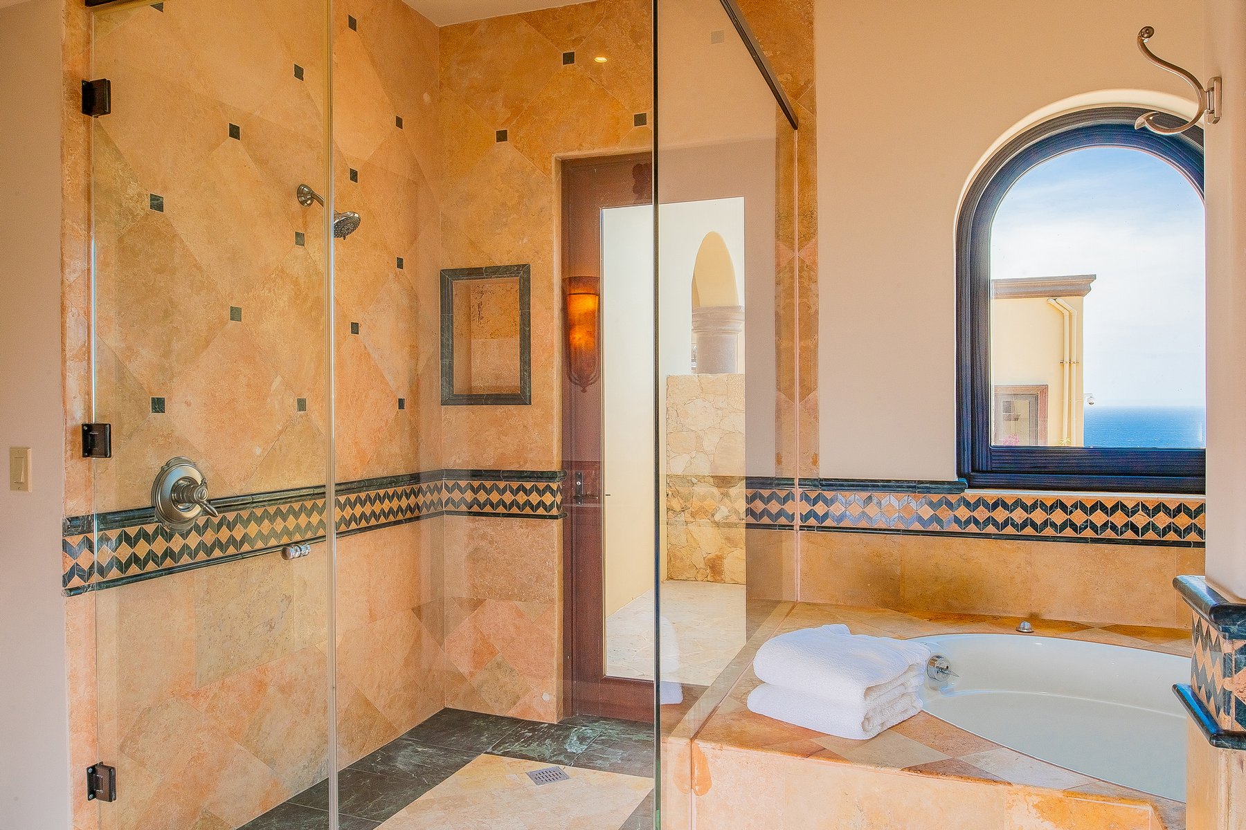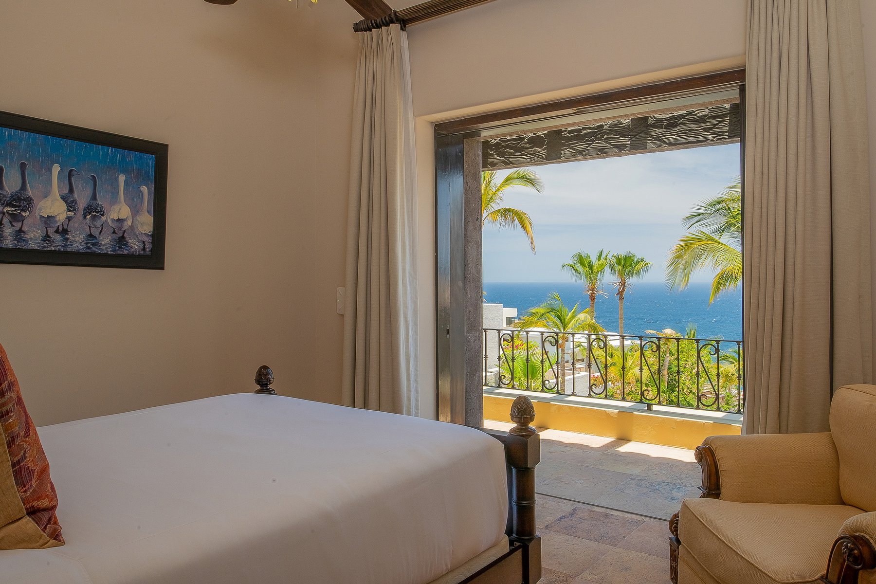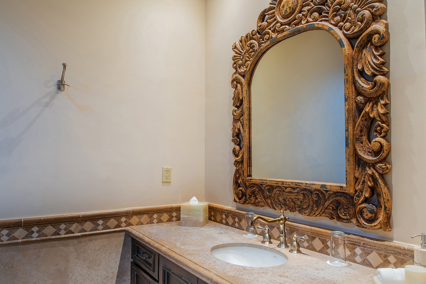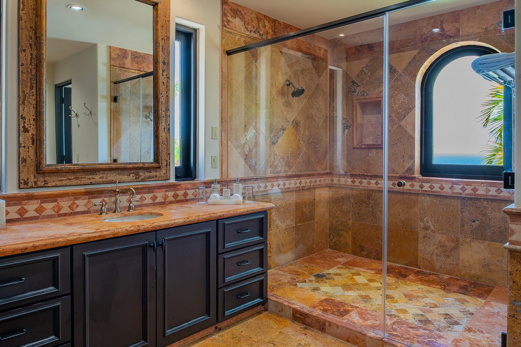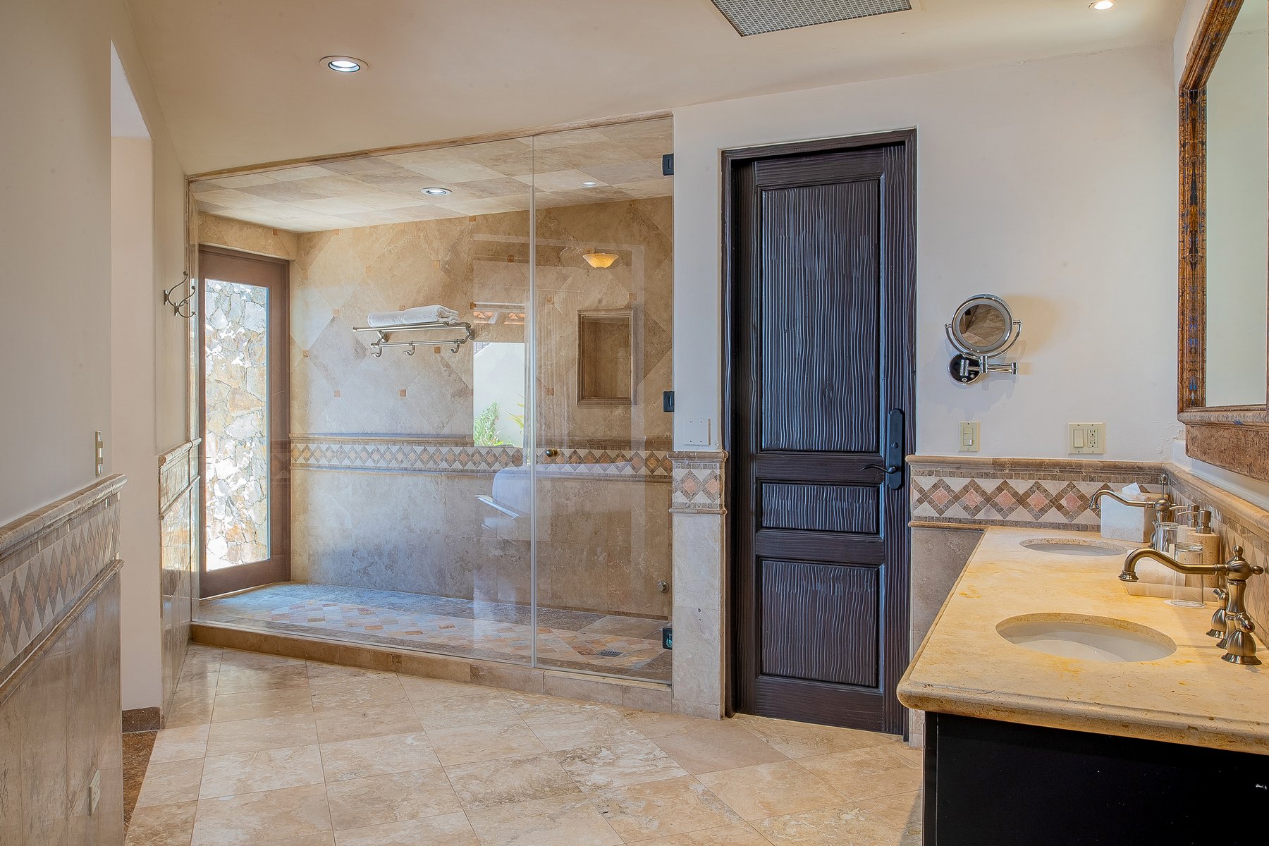 Villa de los Sueños is an eight-bedroom villa rental in the gated Pedregal community of Cabo San Lucas — 11,000 square feet of Spanish hacienda architecture adjacent to downtown and the marina, with Pacific Ocean views from an elevation that keeps the property above the main activity while remaining minutes from it. Eight bedrooms, nine baths, and eighteen guests across cream-colored walls, marble flooring, granite and marble countertops, and colonial-palace architectural details that carry through every room.