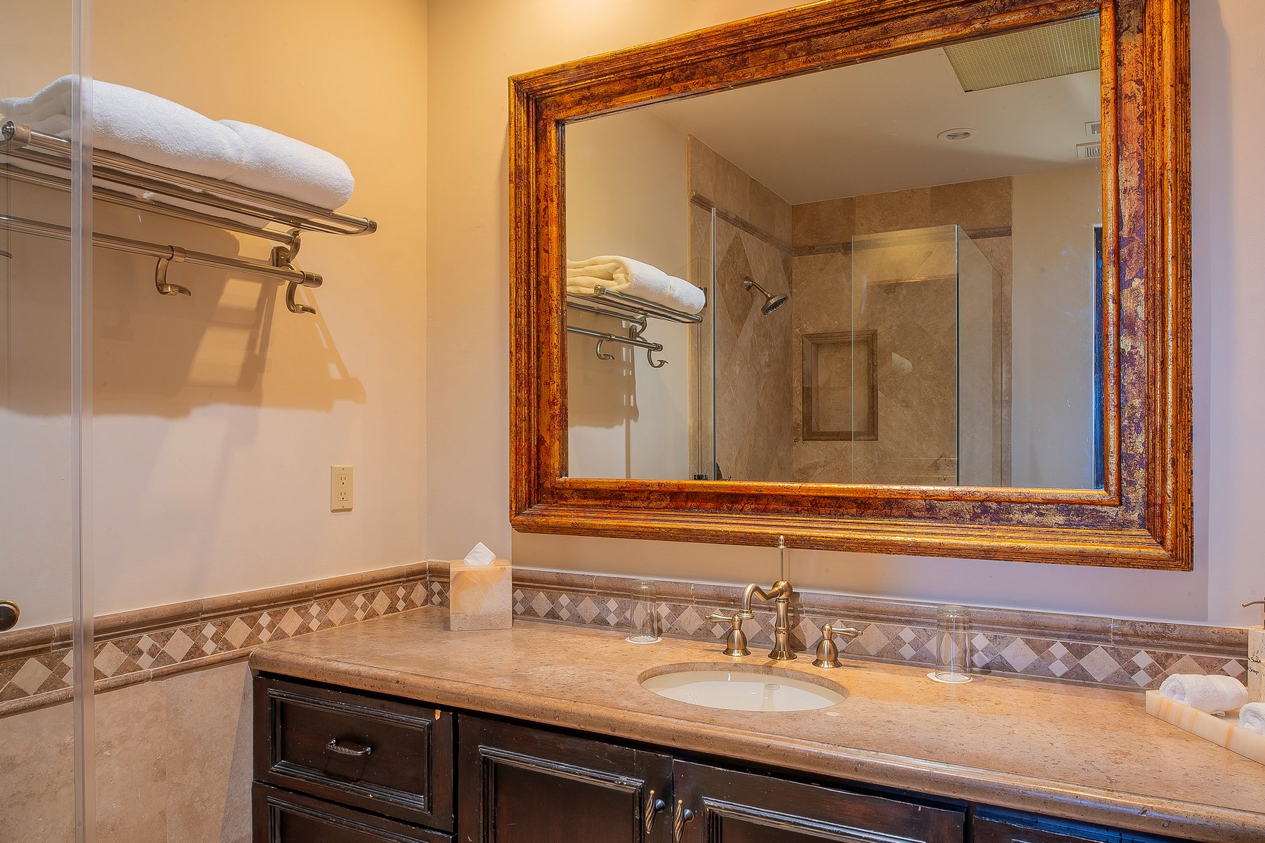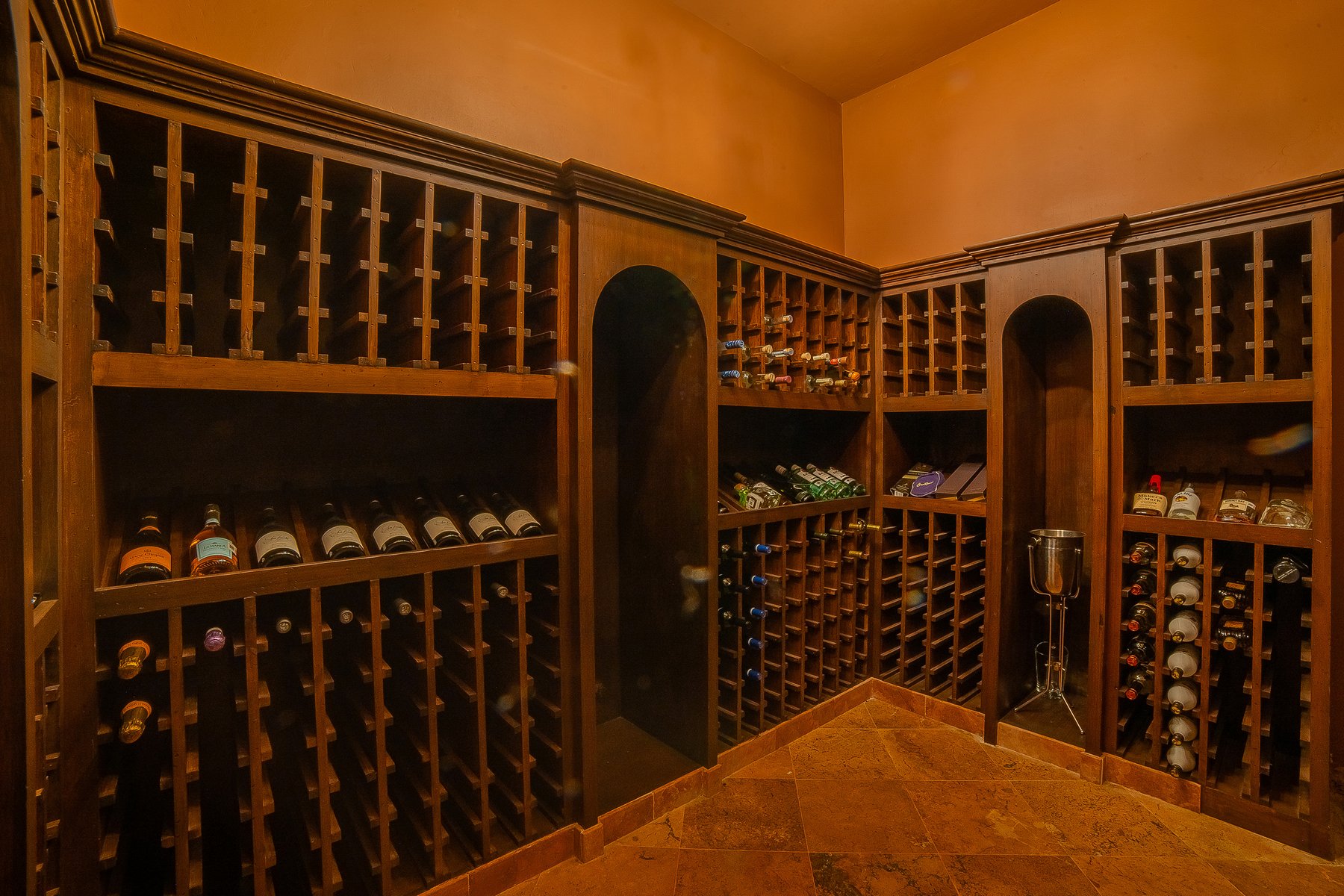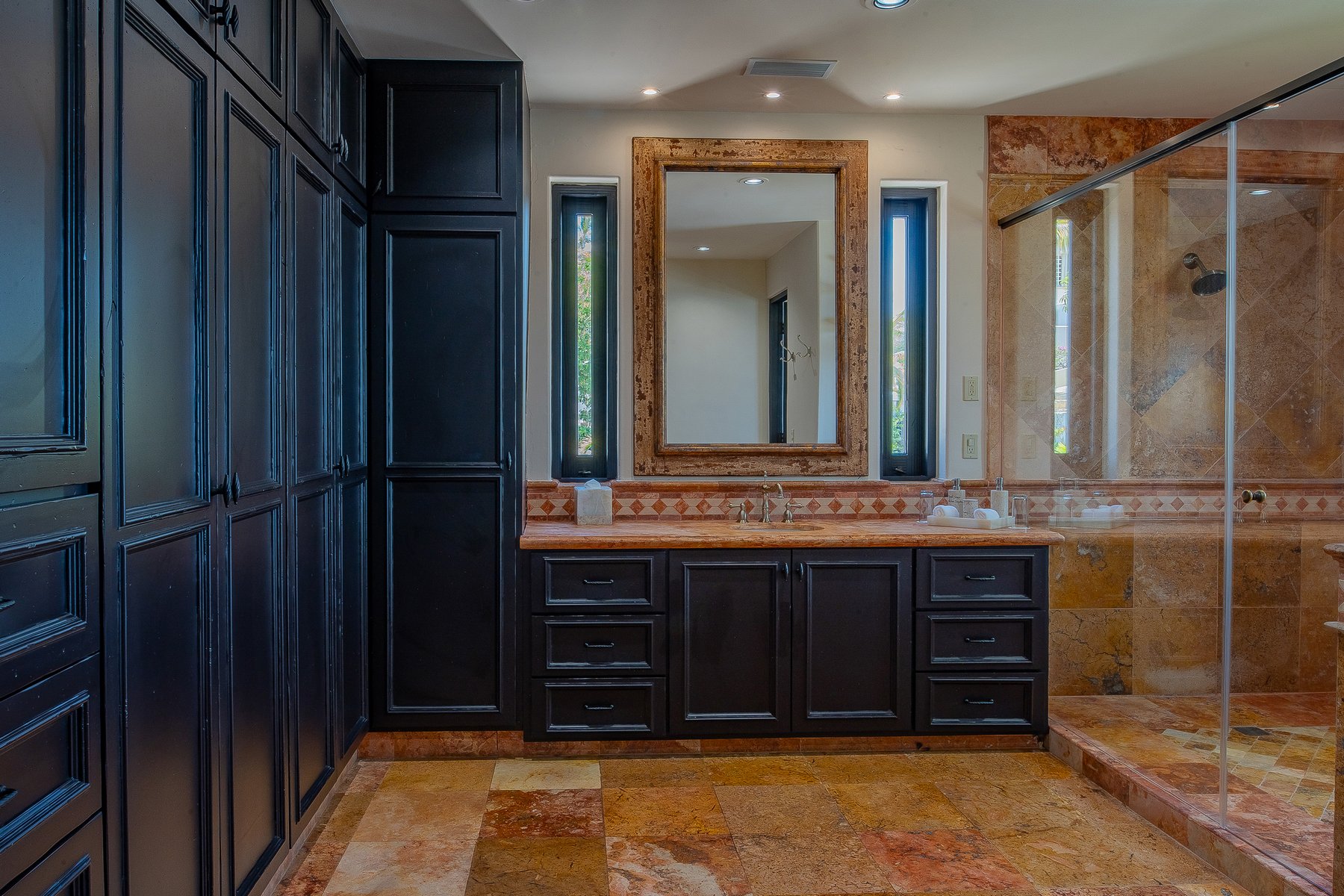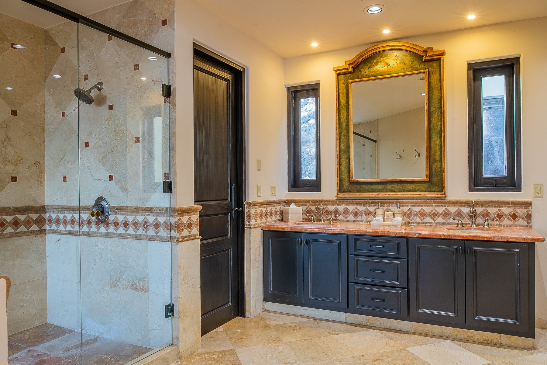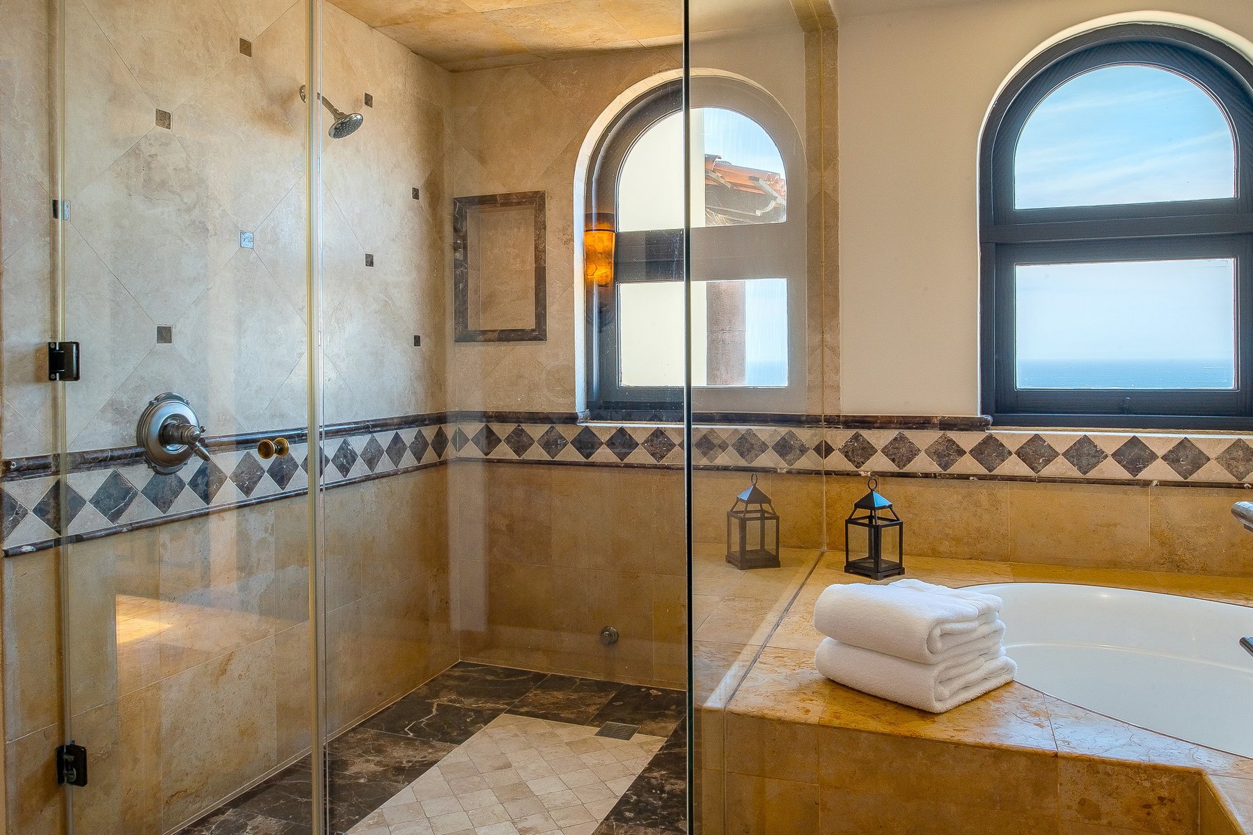 Villa de los Sueños is an eight-bedroom villa rental in the gated Pedregal community of Cabo San Lucas — 11,000 square feet of Spanish hacienda architecture adjacent to downtown and the marina, with Pacific Ocean views from an elevation that keeps the property above the main activity while remaining minutes from it. Eight bedrooms, nine baths, and eighteen guests across cream-colored walls, marble flooring, granite and marble countertops, and colonial-palace architectural details that carry through every room.