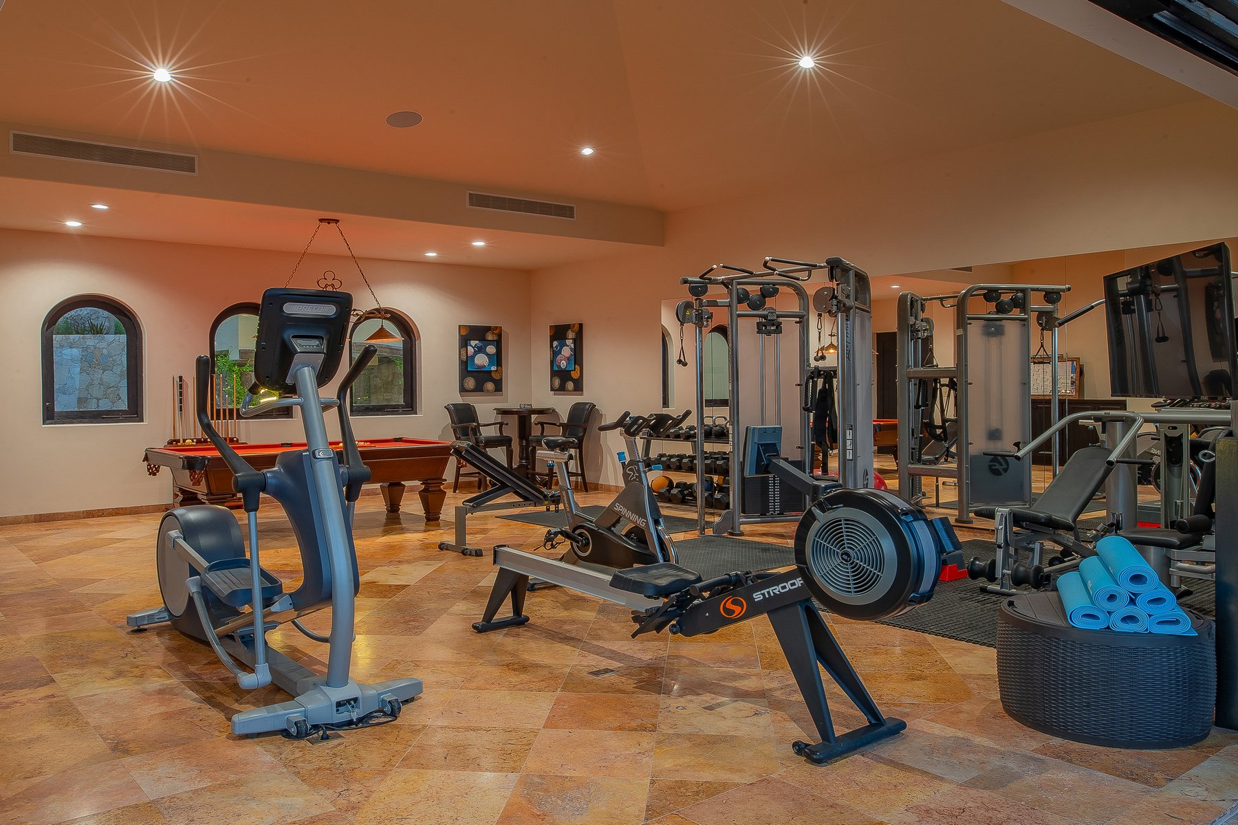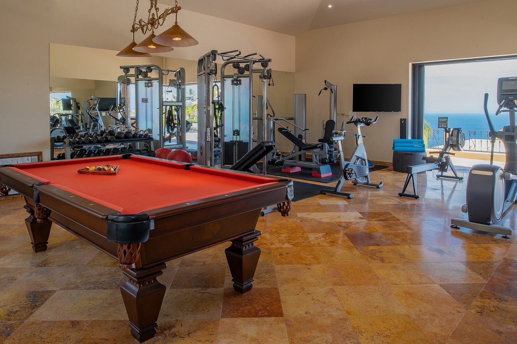 Inside, a fitness room with dedicated equipment, a billiards table with ping pong, a gas fireplace, indoor dining for sixteen, ten televisions with Dish Network, whole-house stereo system, Vonage long-distance, iPod docking, fax and printer, and a separate casita within the property give the estate a social and hospitality infrastructure proportional to eighteen guests.