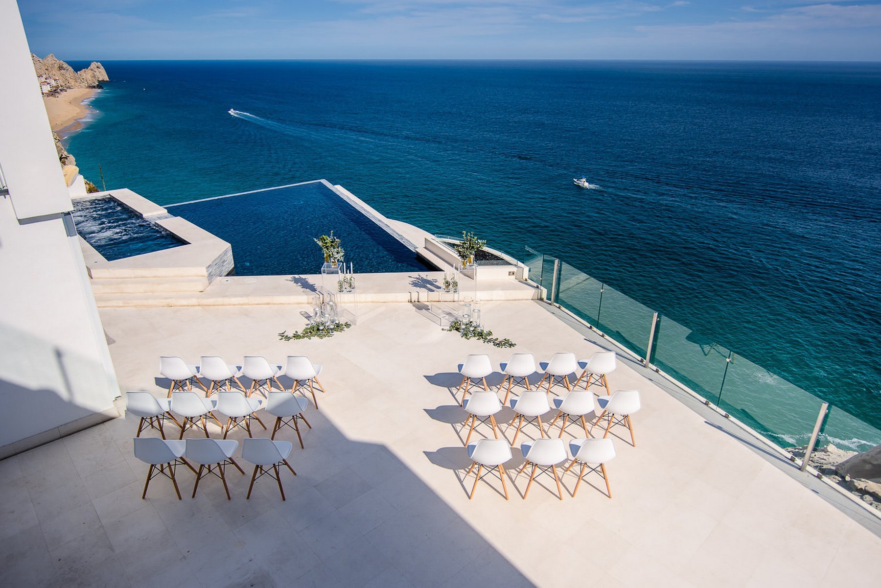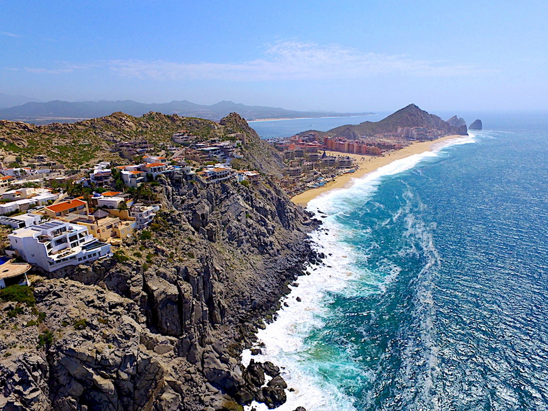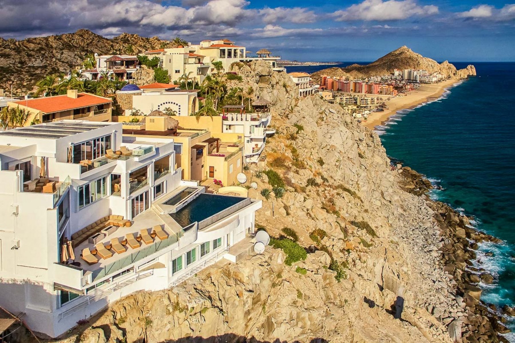 Villa Land's End is a seven-bedroom villa in Pedregal, Cabo San Lucas — positioned within the gated hillside community with Pacific Ocean views and a ten-minute walk to Pedregal Beach. Seven bedrooms, eight and a half bathrooms, sixteen guests.