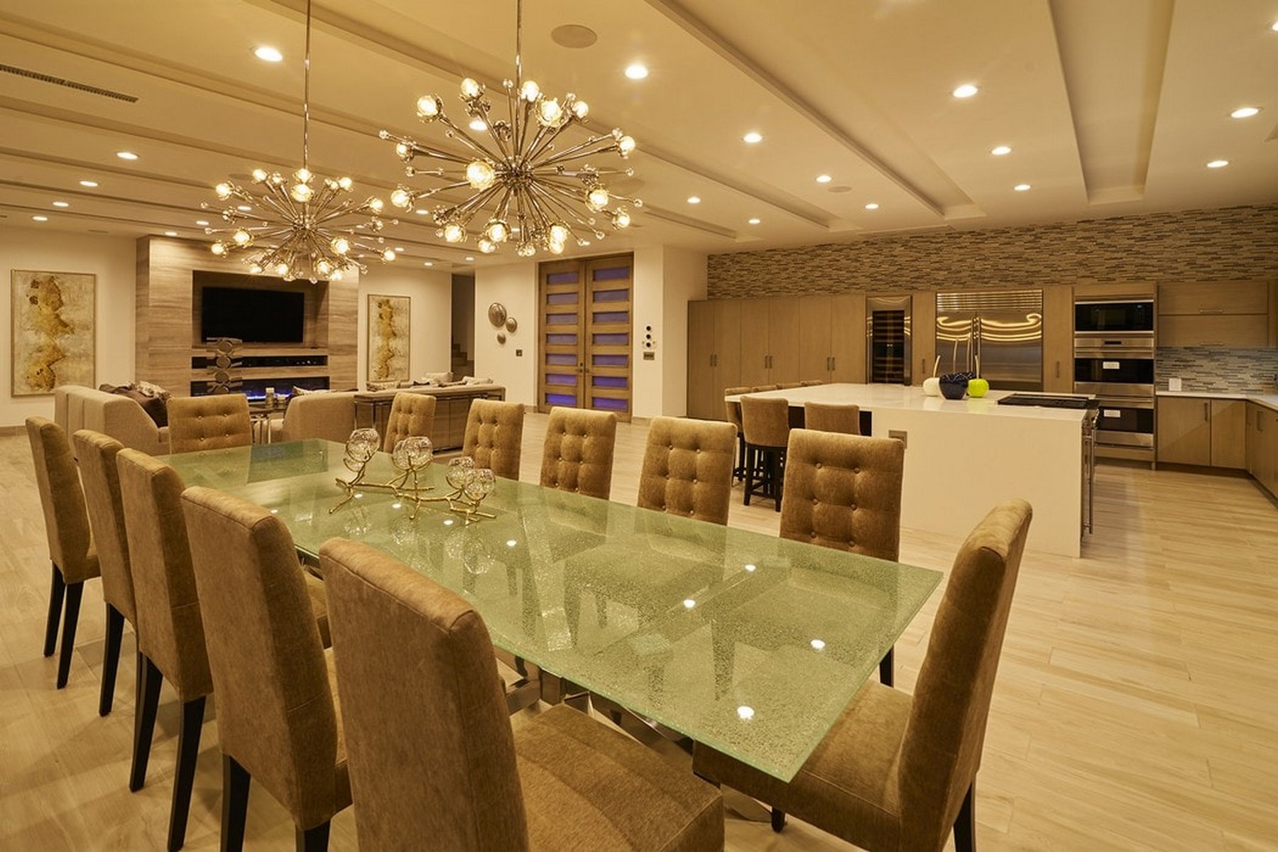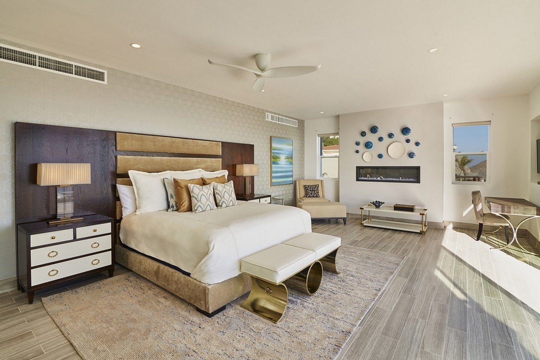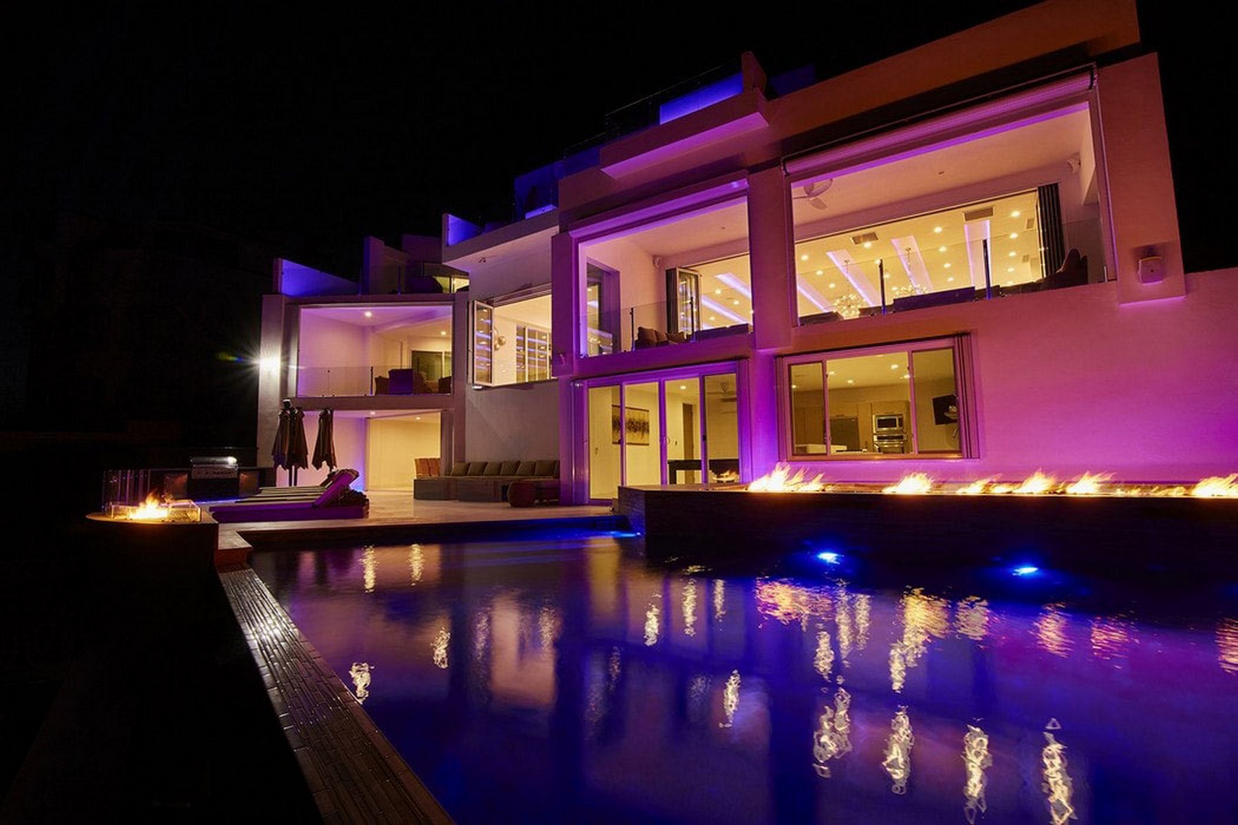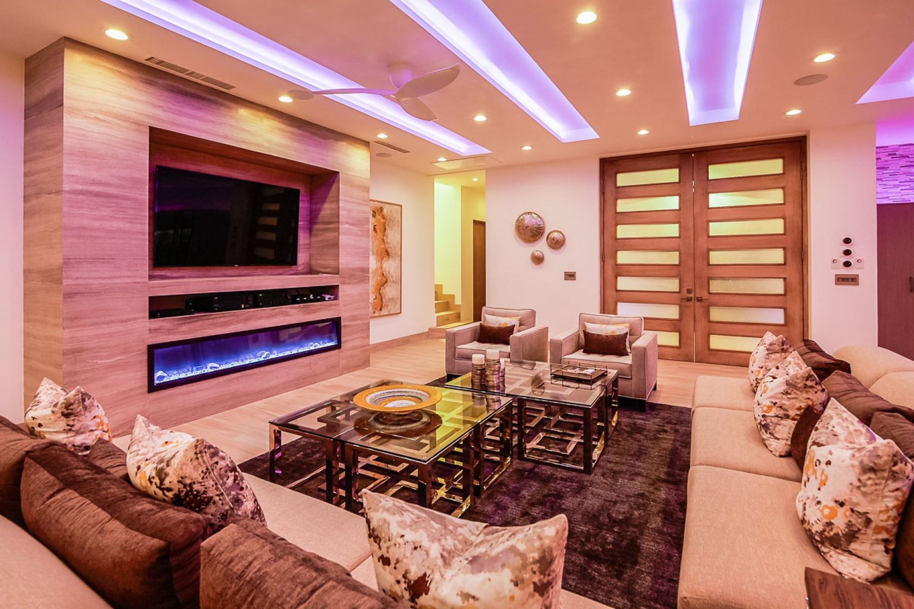Inside, the amenities are oriented toward entertainment. A billiard table, ping-pong, a full home gym, SONOS surround sound throughout, and LED lighting that adjusts to the mood of the evening give a group of sixteen plenty to work with over multiple days without the property ever feeling repetitive. Fireplaces add warmth to the common areas on Pedregal evenings when the air cools.