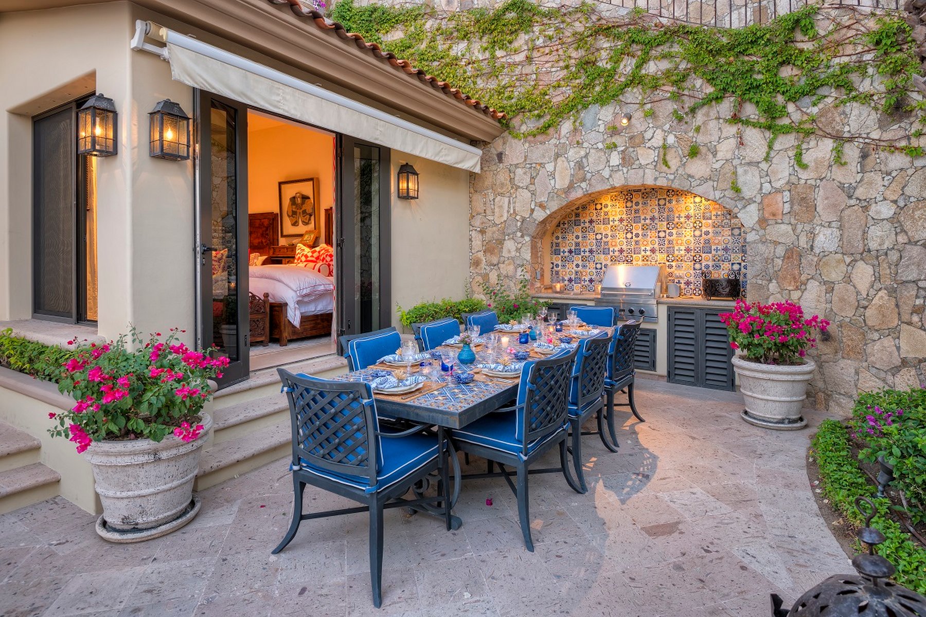 The outdoor terrace holds a private infinity pool, jacuzzi, gas BBQ, chaise lounges and umbrellas, and an outdoor seating bench with a fire pit. The simplicity of the outdoor program at this scale — pool, jacuzzi, fire pit facing the Cortez — is the point. This is a four-bedroom property where the outdoor setup and the Palmilla context do the work.