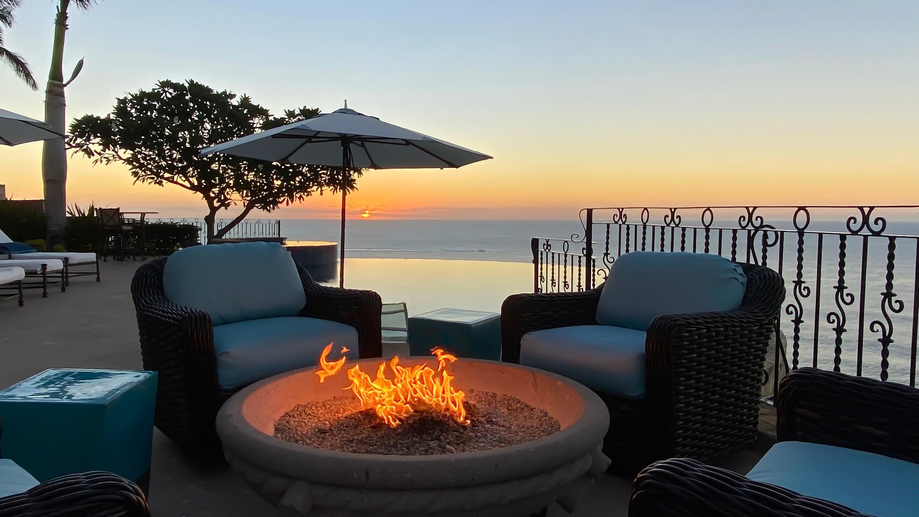 Outside, a private infinity pool and jacuzzi sit beneath a palapa with a fireplace and seating area, with chaise lounges and a fire pit rounding out the terrace. There's a particular quality to evenings here — the Cortez below, the palapa fireplace lit, the group settling into the kind of slow time that takes a few days to arrive and then doesn't want to leave. A media room inside extends that same unhurried energy on the nights when the terrace gives way to something quieter.