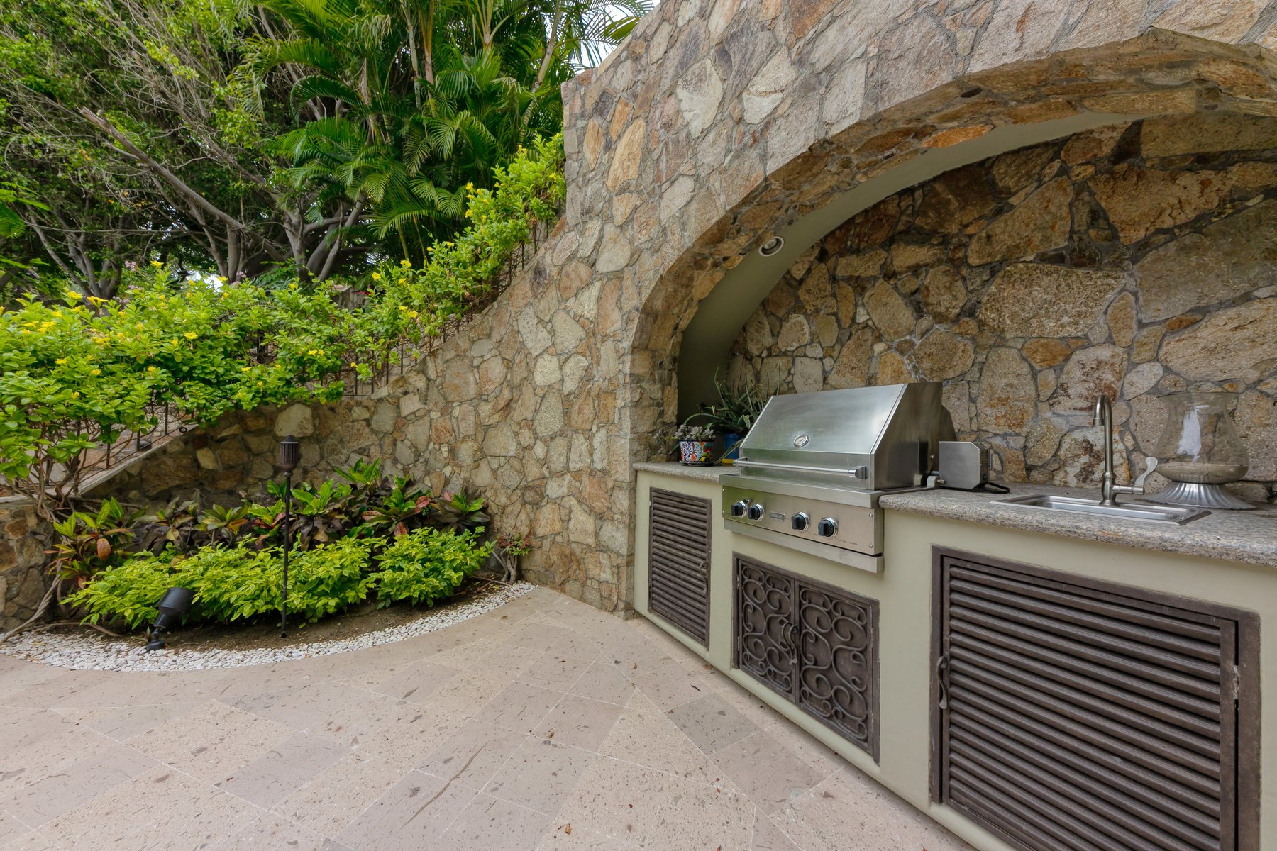 The outdoor terrace holds a private pool, jacuzzi, outdoor fireplace and fire pit, palapa, gas BBQ, and outdoor dining for ten. At this elevation on the Palmilla hillside, the property stays genuinely quiet — the kind that comes with the territory up here, where the Cortez sits in view and the activity of the corridor below doesn't reach.